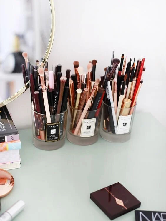 2. Remove and clean out all containers (or you may be adding brand new containers that are already clean). A lot of plastic caddies and dividers can be run through the dishwasher usually. Don't forget to also clean makeup brushes and sponges while you are doing this too.