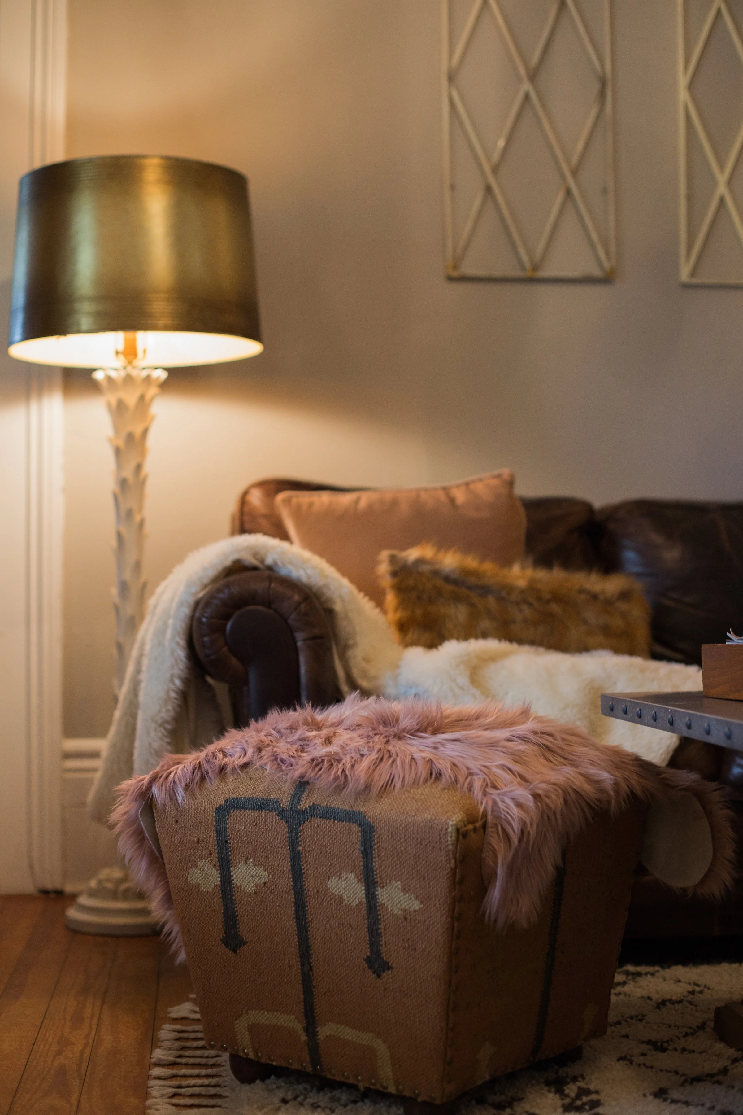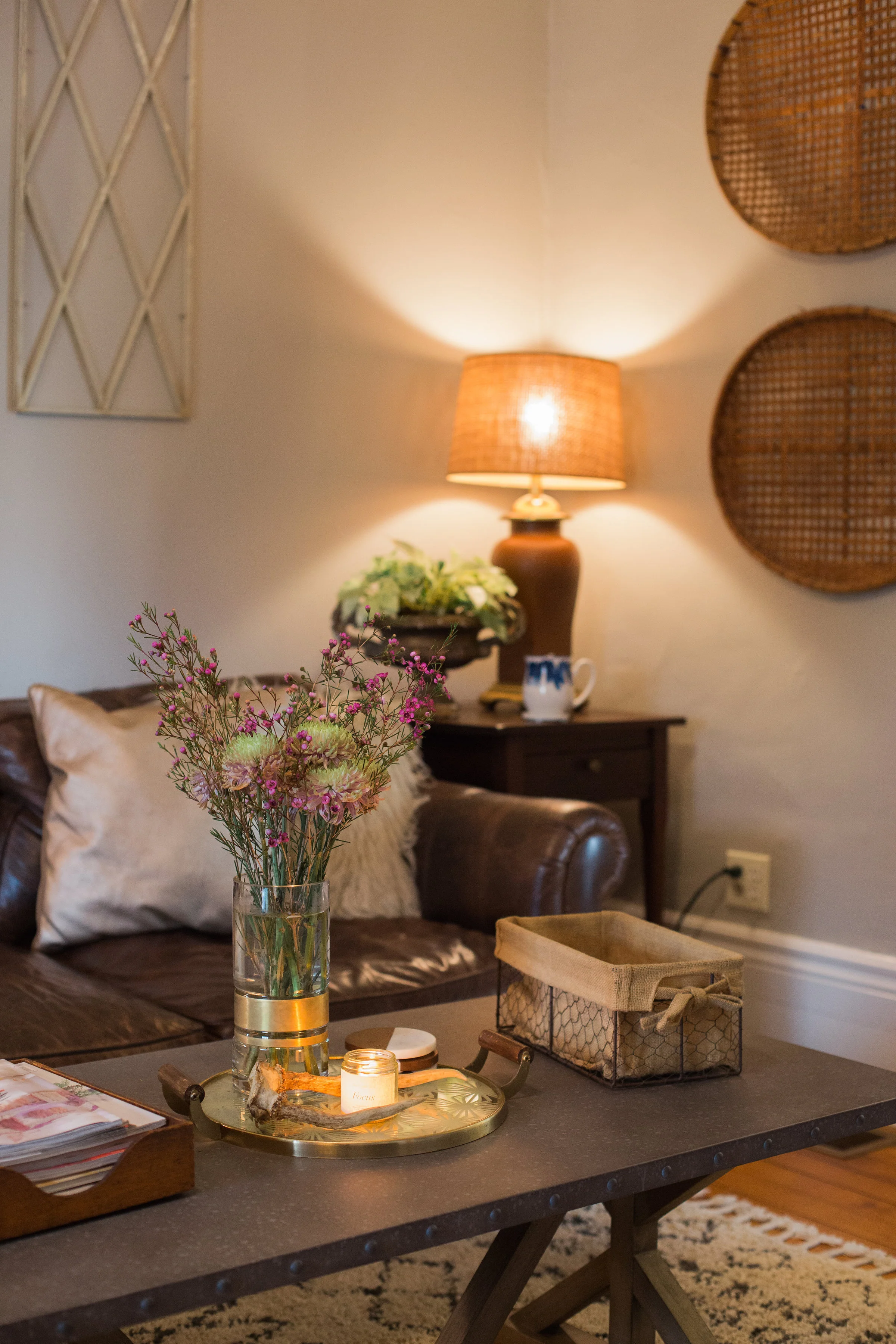 Finally, I love to add a vase of fresh florals as a centerpiece on my coffee table throughout the year, but especially in the spring. Lately I've been sticking to a mix of pale pink and purple flowers and I love how it looks with the rest of my decor, especially in this brass banded Magnolia vase. I've linked my vase, coffee table, and a few more of my favorite pieces from this space below.