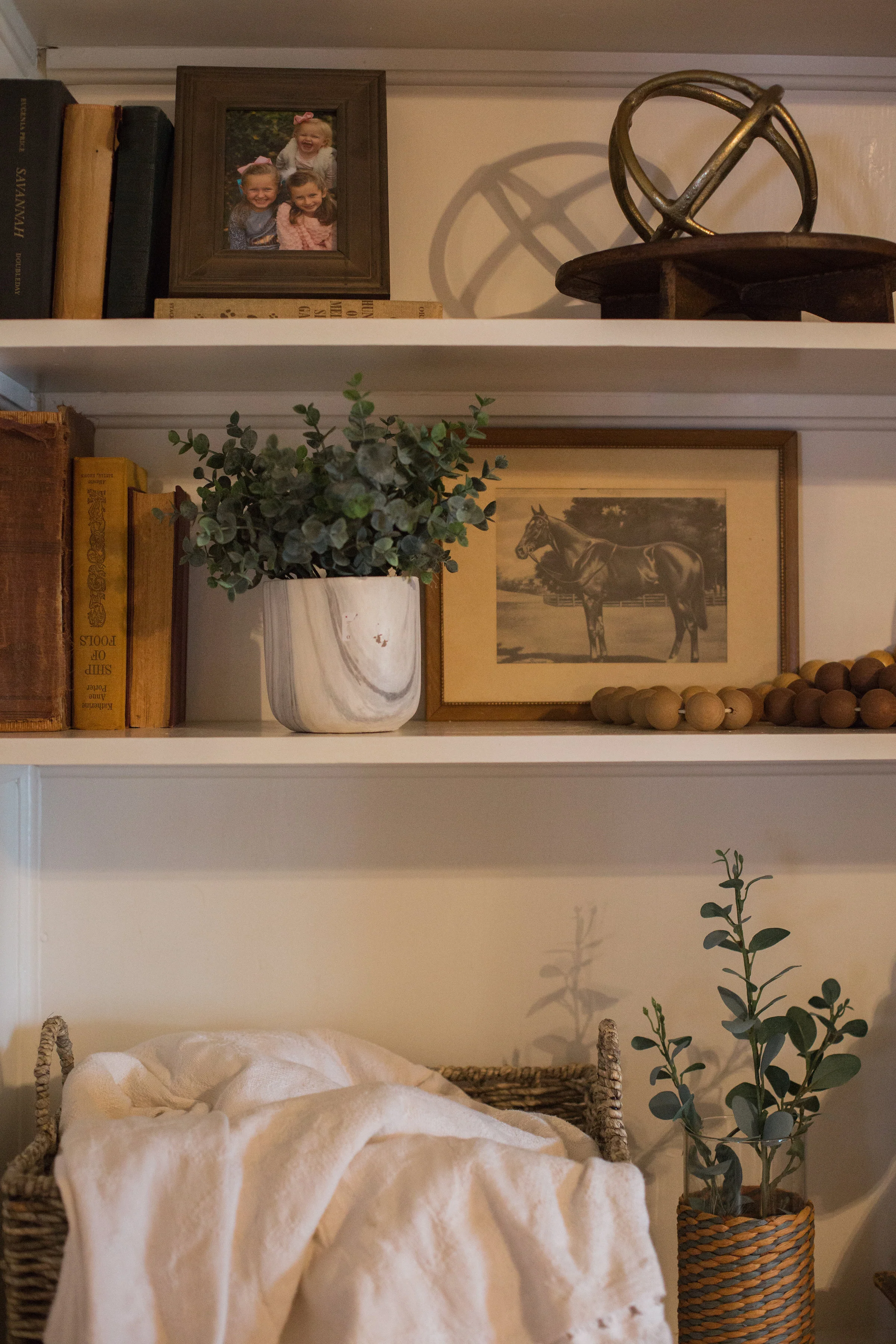 After packing up my holiday decor, I was definitely ready to keep these built-in shelves super minimal + clean. I removed a lot of extra, unnecessary decor and kept plenty of space between items. I like this simple, clean look for spring and into summer especially with the bright white color of the built-in shelves. I use a mix of old books (turn them around if the spines are too bright or the colors don't match your decor), small accessories, faux plants, and vintage framed photos.