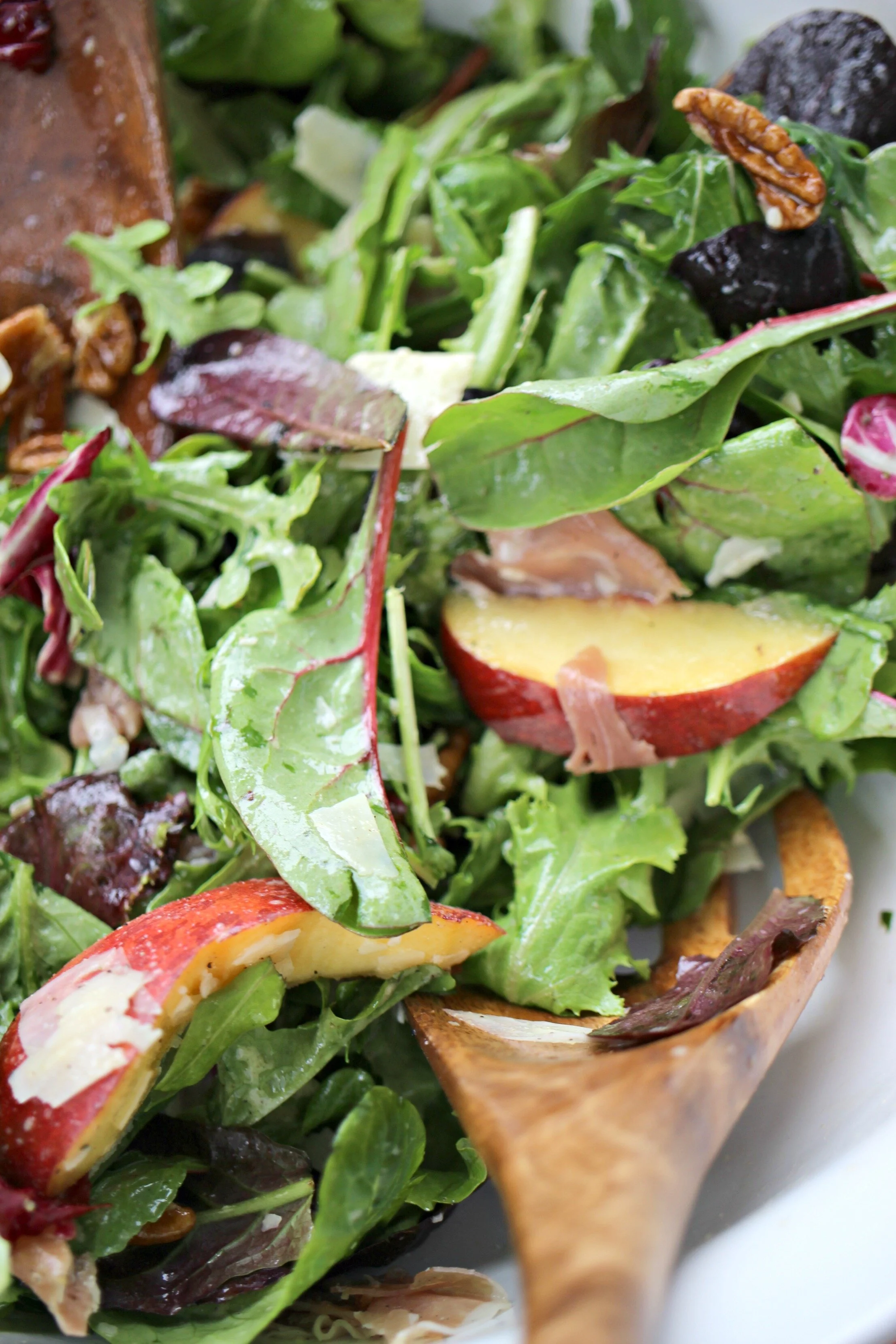 I'm typically not a huge fan of fruit in salads but something about spring puts me in the mood for this combo.  This salad has a few of my favorite things: Parmesan, prosciutto, peaches, and pecans.  The flavors work together perfectly, especially the sweetness of the peaches and pecans with the saltiness of the prosciutto and Parmesan!  The lemony vinaigrette is a perfect light and fresh dressing for any spring salad and is the perfect topping for this one as well.  You can find all the ingredients + instructions for pulling this together below!