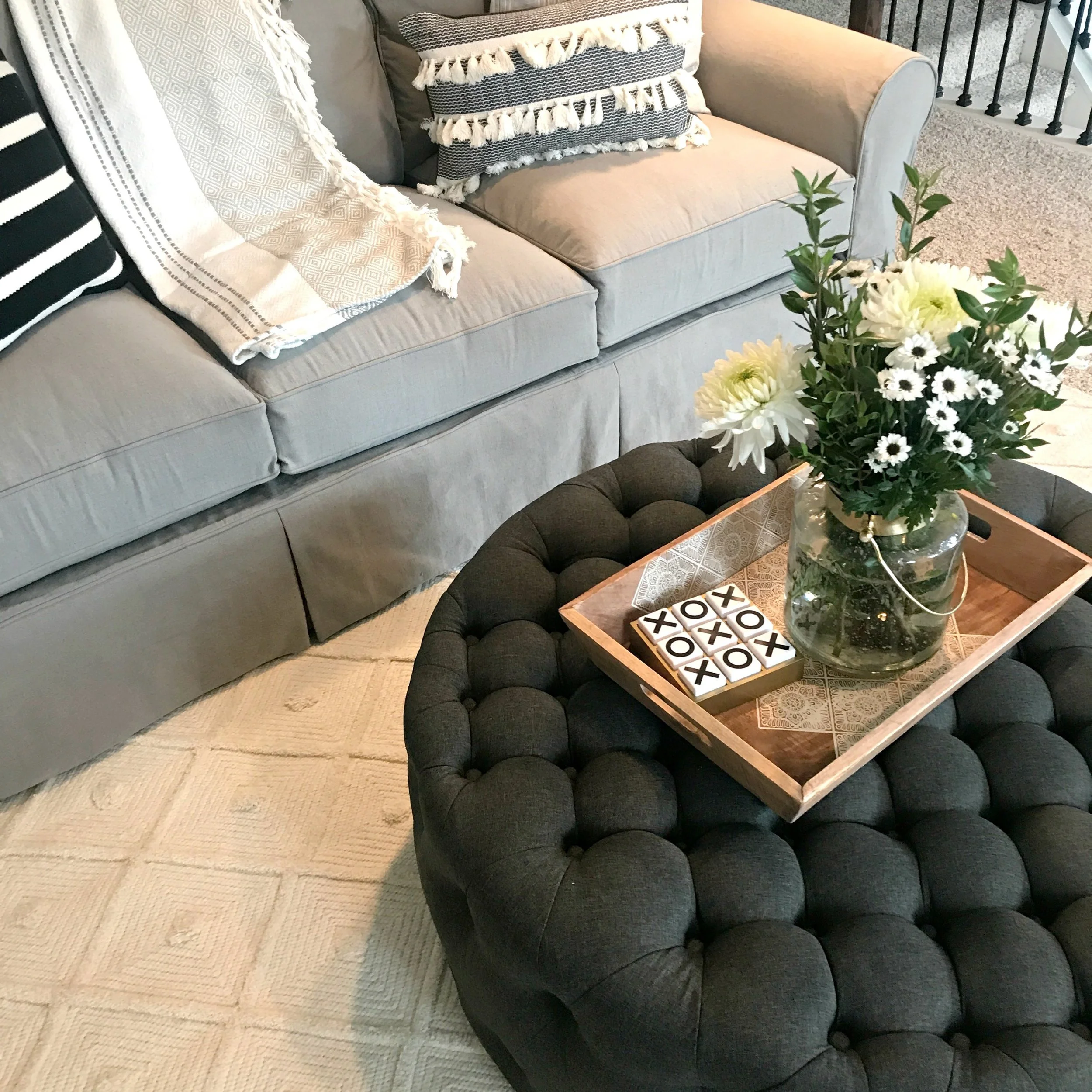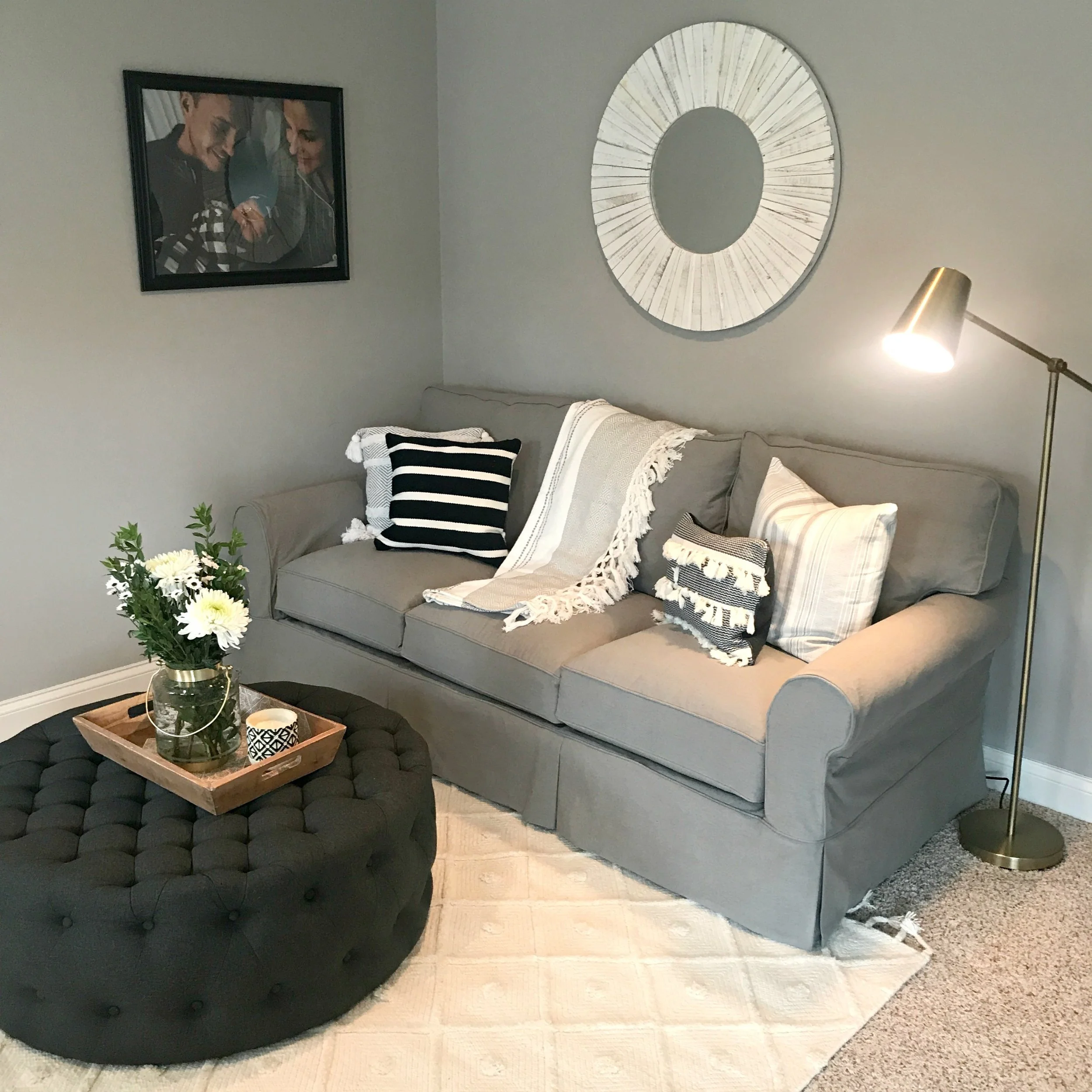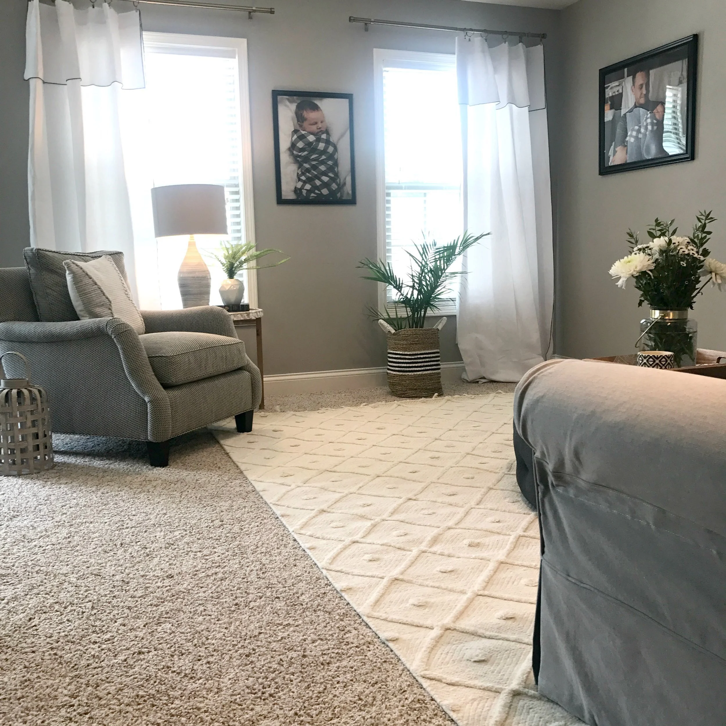 We started with a completely empty room in here. My clients found the furniture (chair and couch) at Arhaus soon after we put the design plan together. After the furniture had been delivered and before I had started installing anything, my client called me saying she hated all the furniture they picked out and was feeling totally down on the space as a whole. She felt everything was too big for the space and everything was too gray and blending in with the walls. So I made it my focus to make the space feel lighter and brighter so that you wouldn't even notice the gray. I had sent my client a lot of rug options to choose from, most all textured and fringey, but some gray and some white/creams. Ultimately she told me to make the decision on the rug and after mulling over all the options the decision to go with a light, cream rug really set the direction of the rest of my decor for the space.