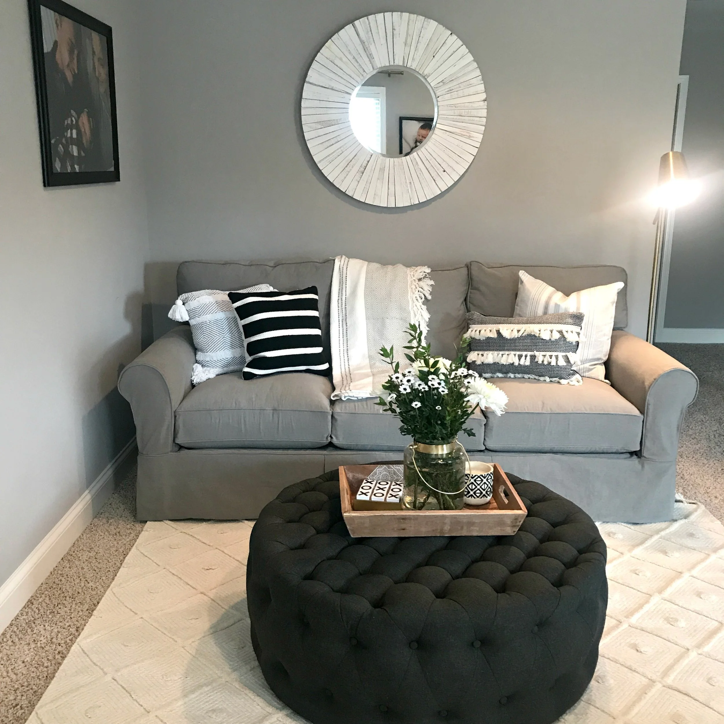 Next I went hunting for the perfect big mirror or set of mirrors to go over the couch! I narrowed it down to several options- most being more traditional/farmhouse style and then the round, distressed white wood mirror that I ended up choosing in the end. I decided to take a chance on the mirror, even though it was a little different than the style my client would typically choose. I could just picture it with the cream rug and thought it would add that brightness and texture the space needed. It ended up being the perfect size for filling the wall and once I chose that and the rug, all the other style elements just came together so easily for the space.