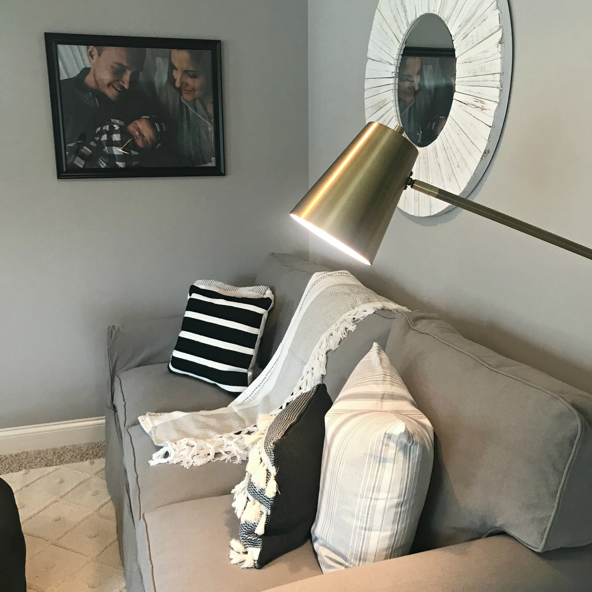 I found the most perfect side table to coordinate with the mirror at Homegoods as well as the cute gray and white lamp on top of it. Overall I kept the accessories pretty simple for now since there isn't a lot of surface area in the room and I didn't want it to feel too crowded. I definitely wanted to fill in the walls as well so we enlarged family photos into poster size prints. This young family definitely has room to continue adding to the space as they need to in the future. The last few things we are going to do to complete this space are: