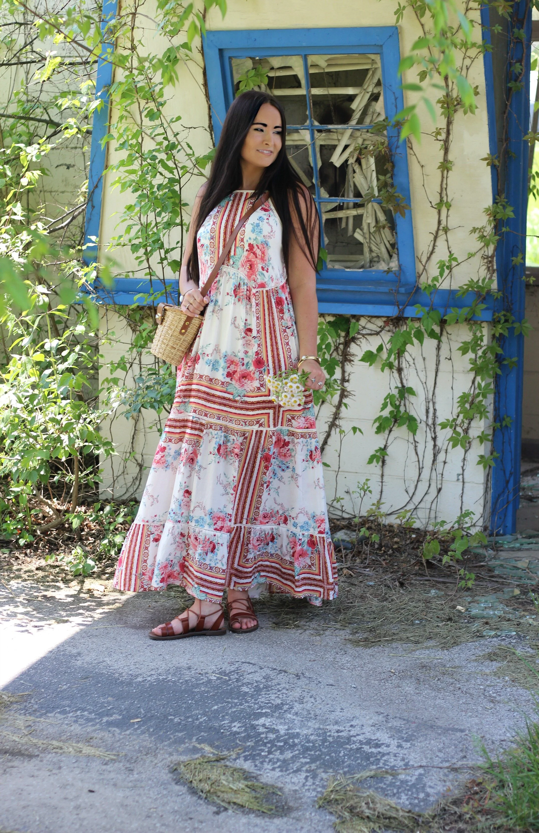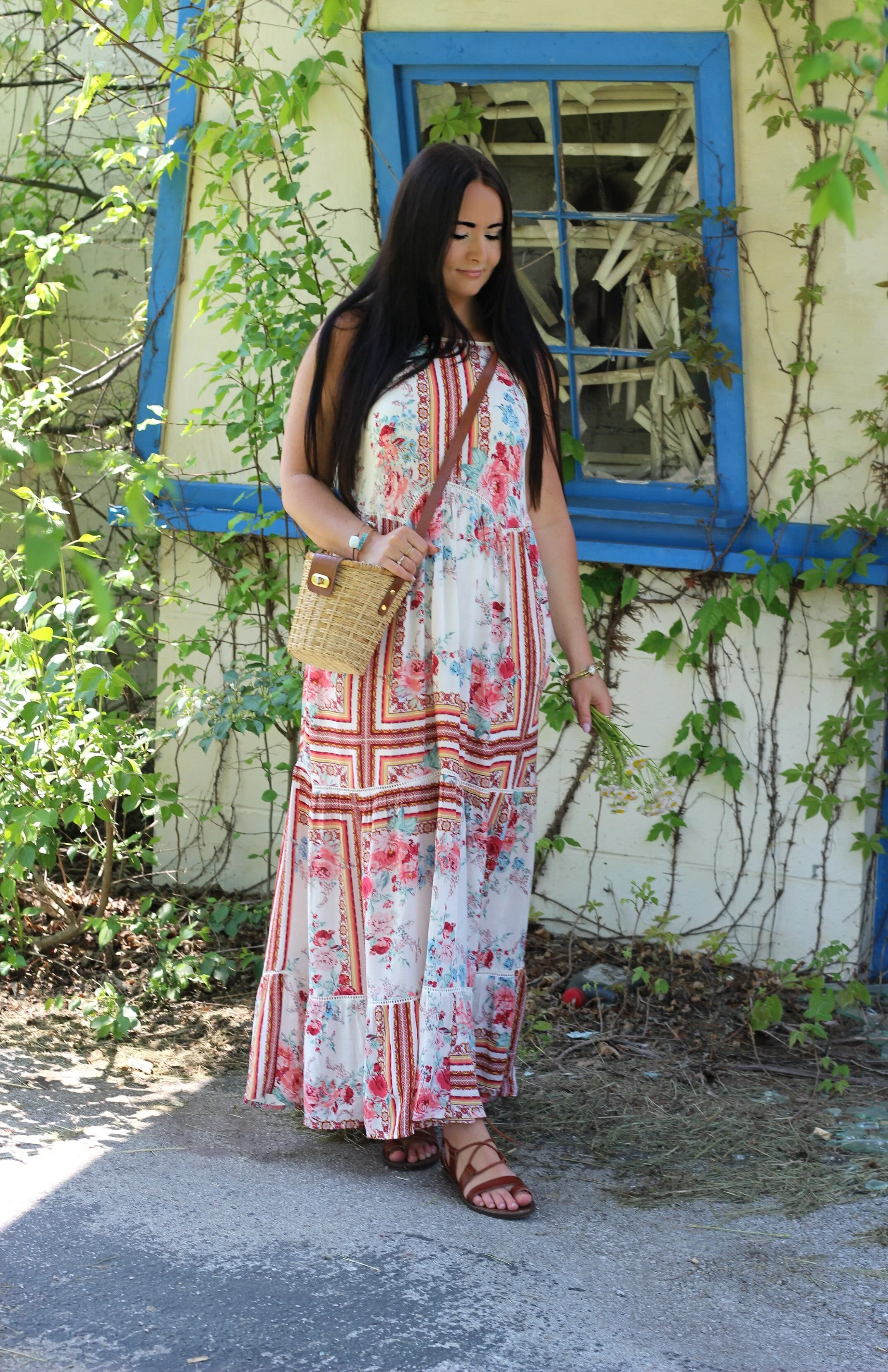 This maxi dress is definitely one of my favorite finds of the spring! I first spotted it on two of my favorite local bloggers: Shelby of Glitter + Gingham and Melissa of Memoir of a Preppy Mom. I fell in love with the flowy silhouette and gorgeous Anthropologie-style print! When you see this dress in person and all the beautiful details, you won't believe it's under $30 and from Target! It's such a steal and such great quality for the price, plus the silhouette is so flattering on a variety of body types. This dress fits pretty true to size but I would recommend sizing down if you are trying to decide between sizes! I've linked all my outfit details for you to shop including my dress, sandals, + straw purse above + below!