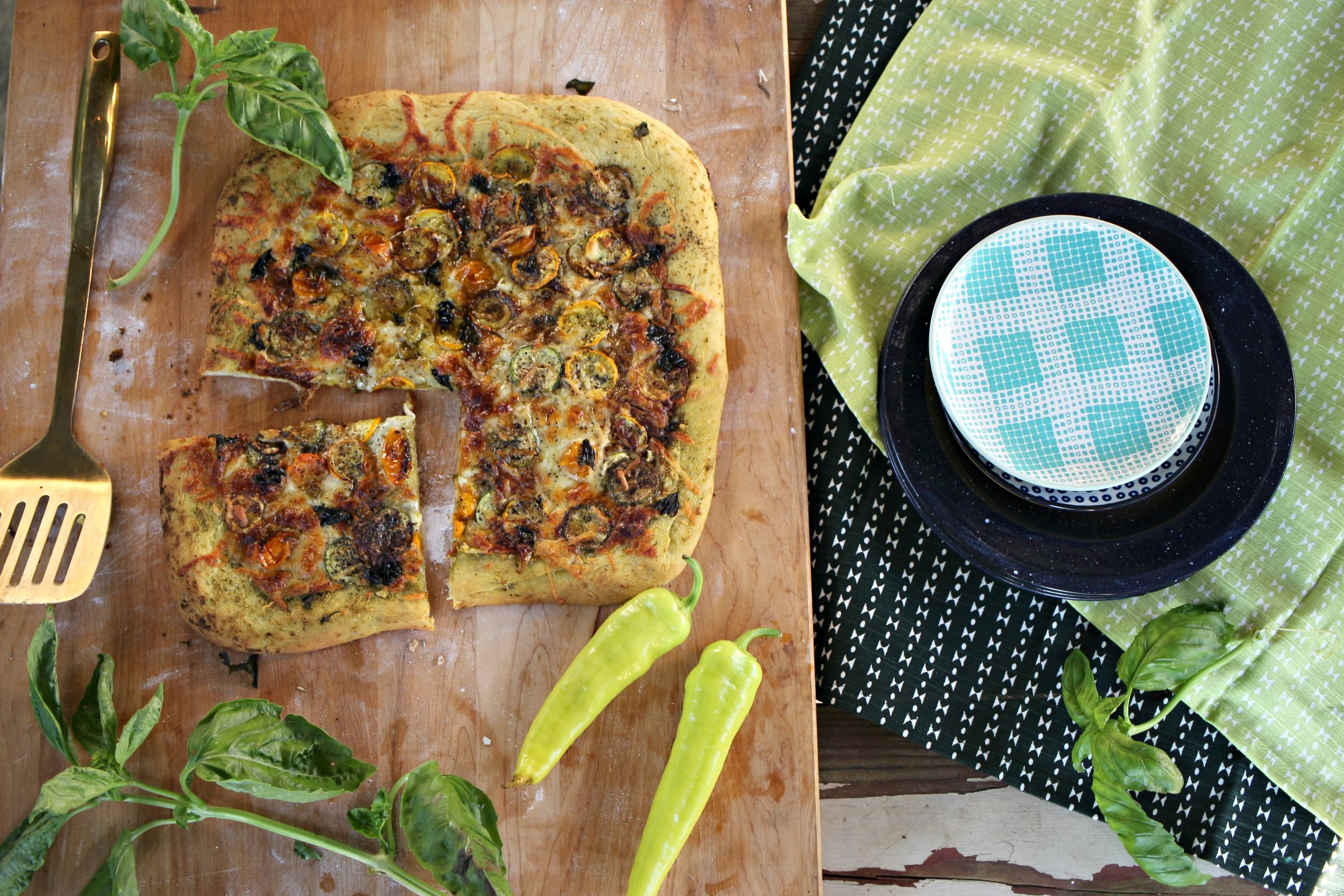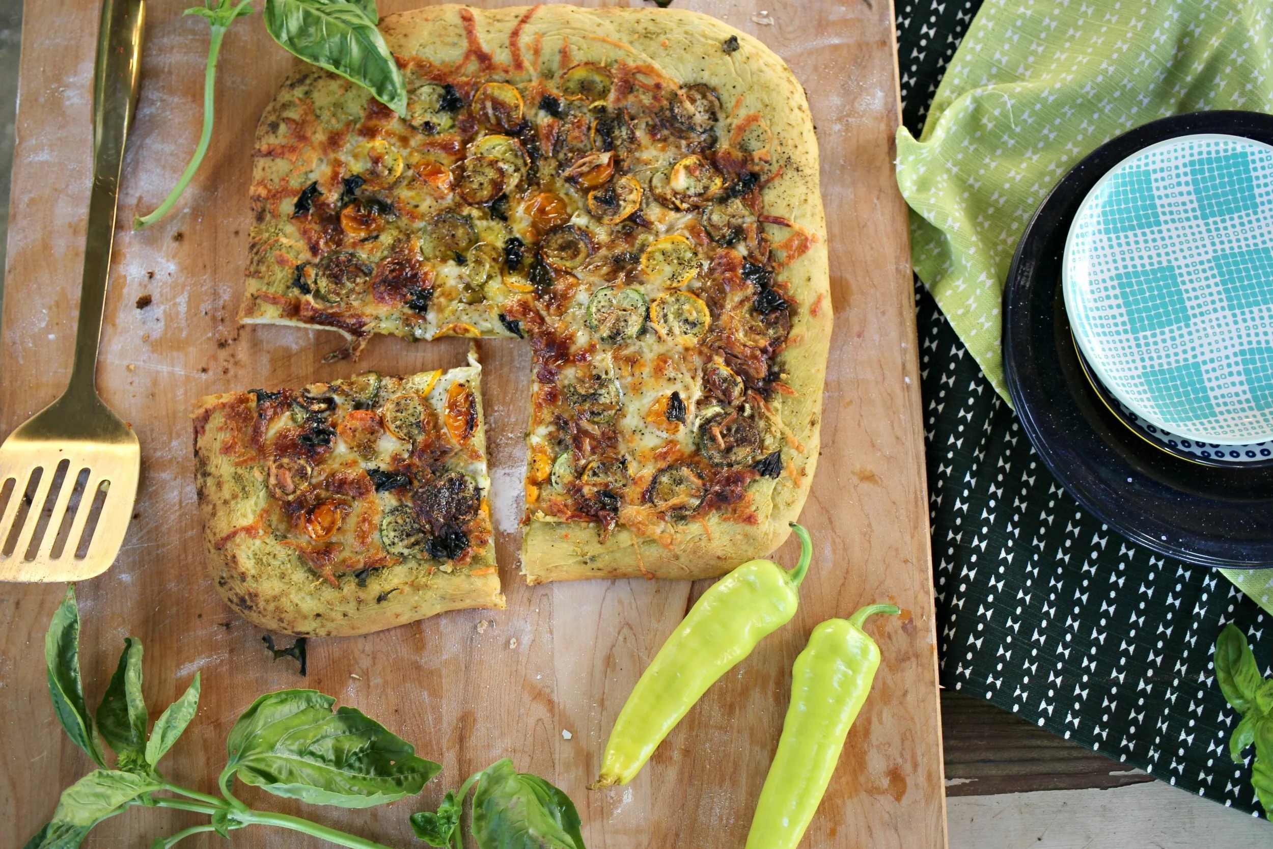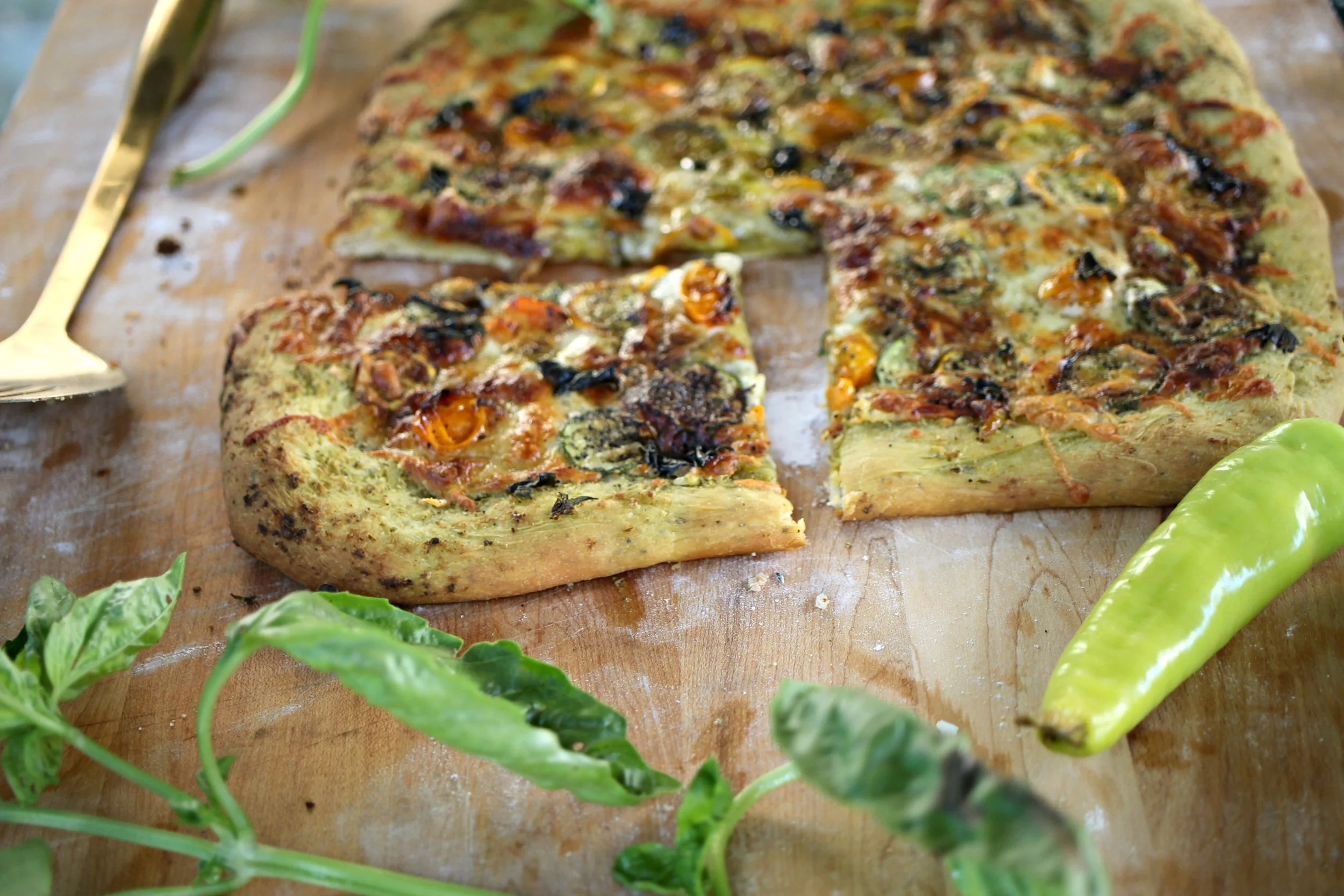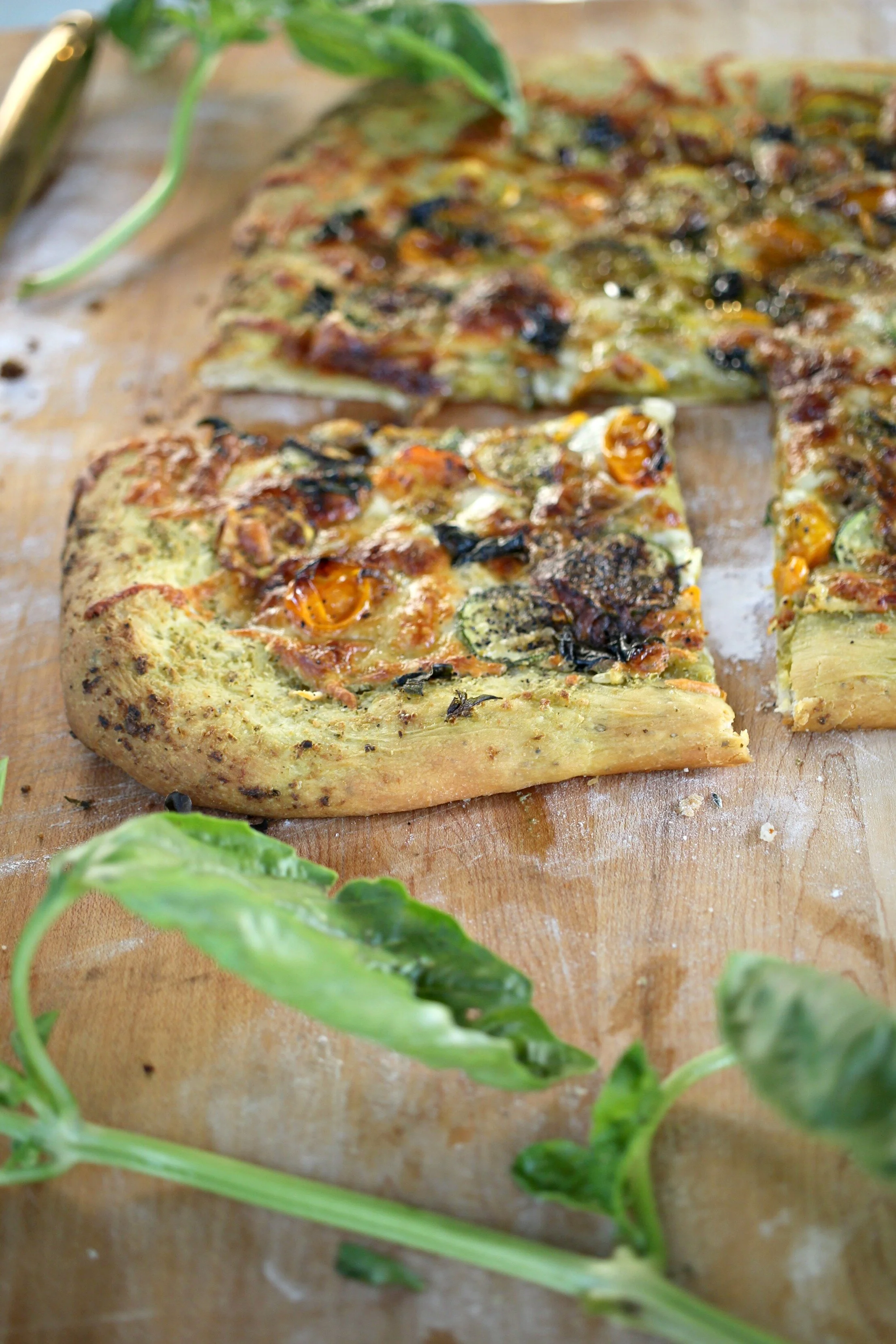 Summer is the perfect time for homemade pizza piled high with fresh produce from the garden! This summer pizza features fresh roasted vegetables on top of a garlic butter pesto sauce base and smothered with plenty of melty cheese. I also added some bits of fresh basil on top for extra flavor and color. Overall this pizza is super light, flavorful, and bright and so perfect for an easy summer dinner! We got all our vegetables and basil from the local farmer's market and I used Trader Joe's fresh garlic and herb pizza dough which makes at-home pizza making so easy and delicious! You can find all the instructions and list of ingredients needed for making this fresh pizza below!