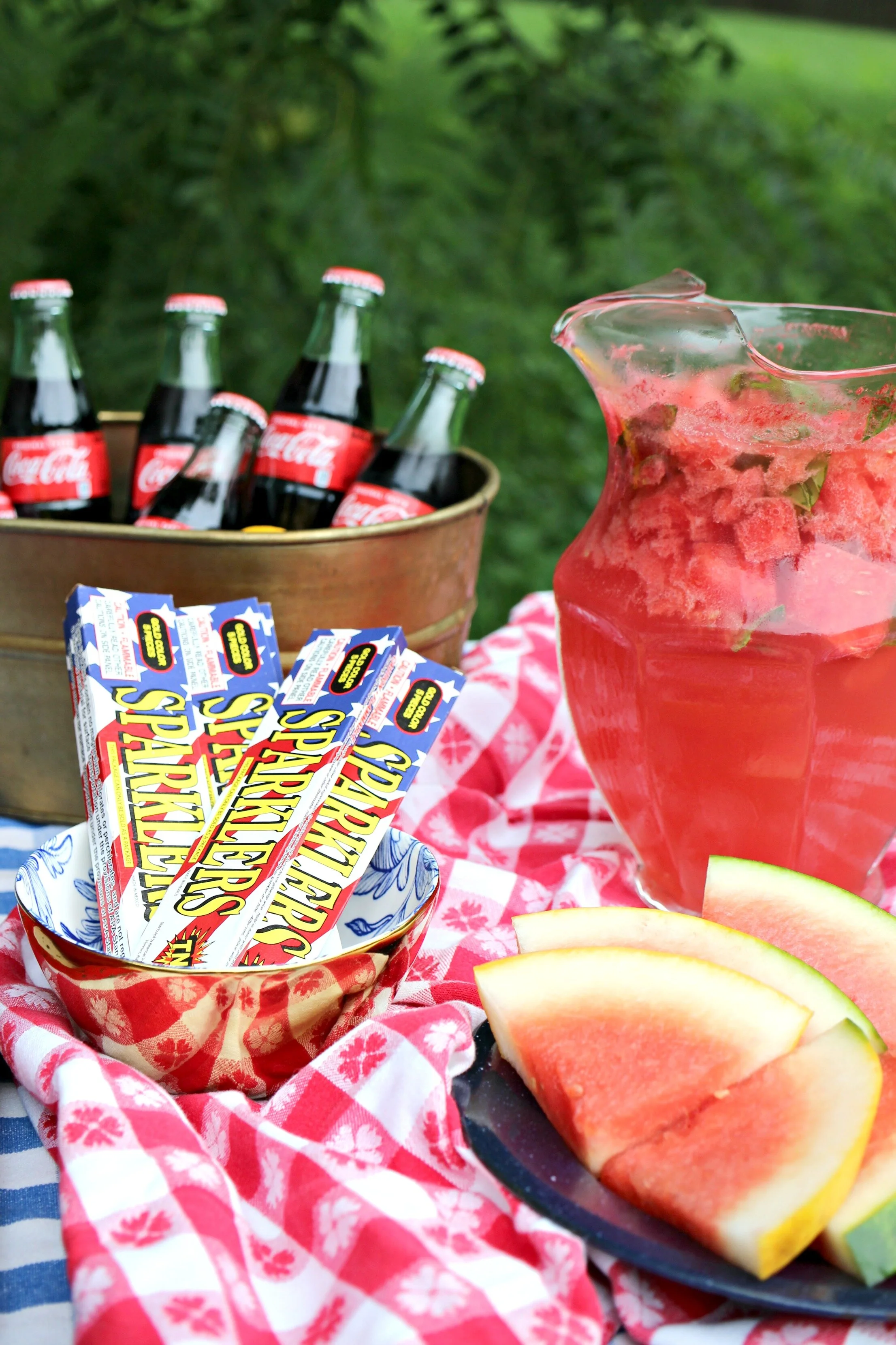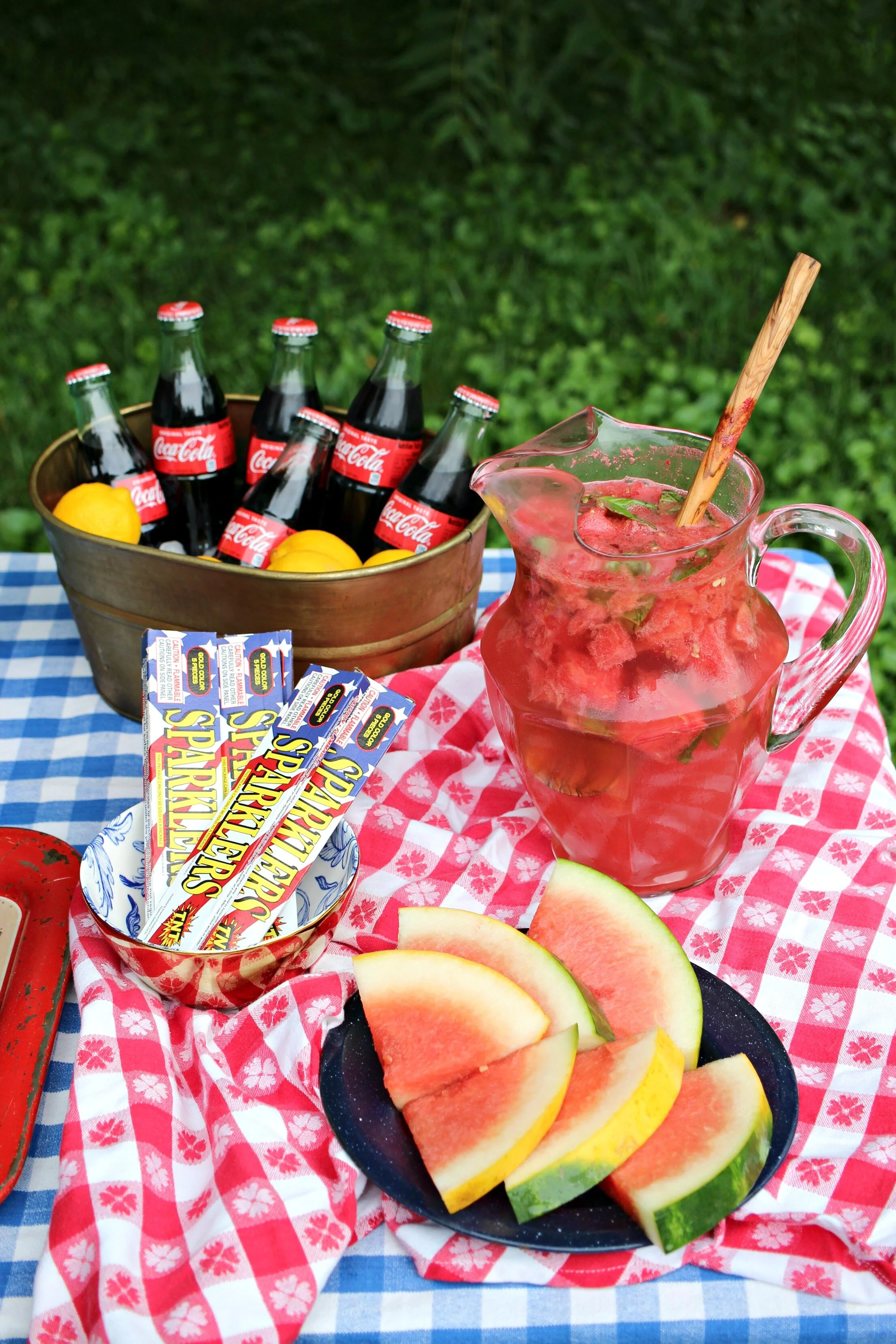 I put this 4th of July inspired beverage station together using all Kroger ingredients and decor that I had around the house. I made 3 different drinks for the station including summer berry lemonade; berry, watermelon, and basil sparkler; and fruit infused waters. All these drinks were super easy and quick to make and only took about 10-15 minutes total for all 3. I also added bottled cokes on ice, fresh fruit for garnish, straws, and cups to the station so guests have everything they need within reach.