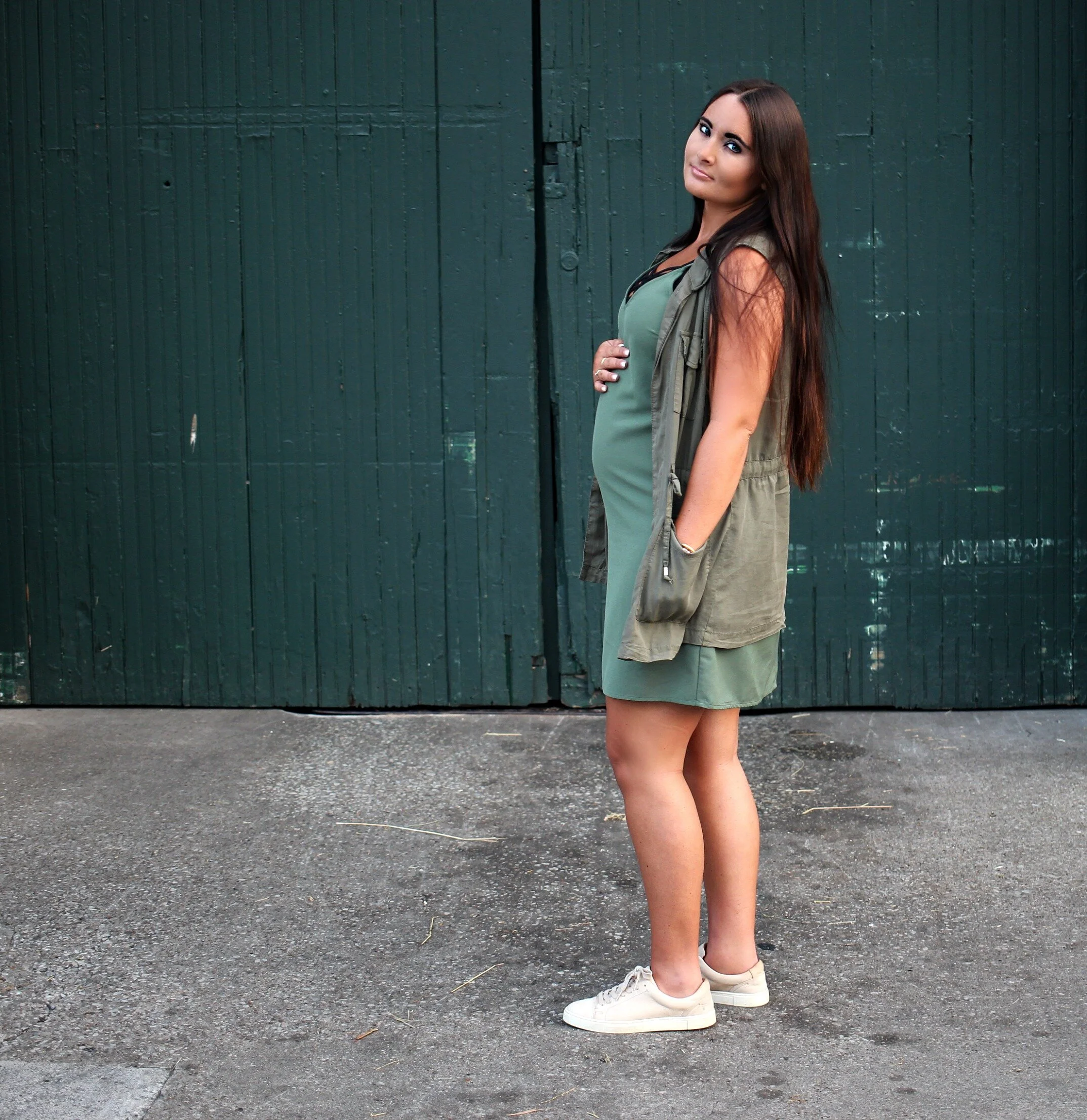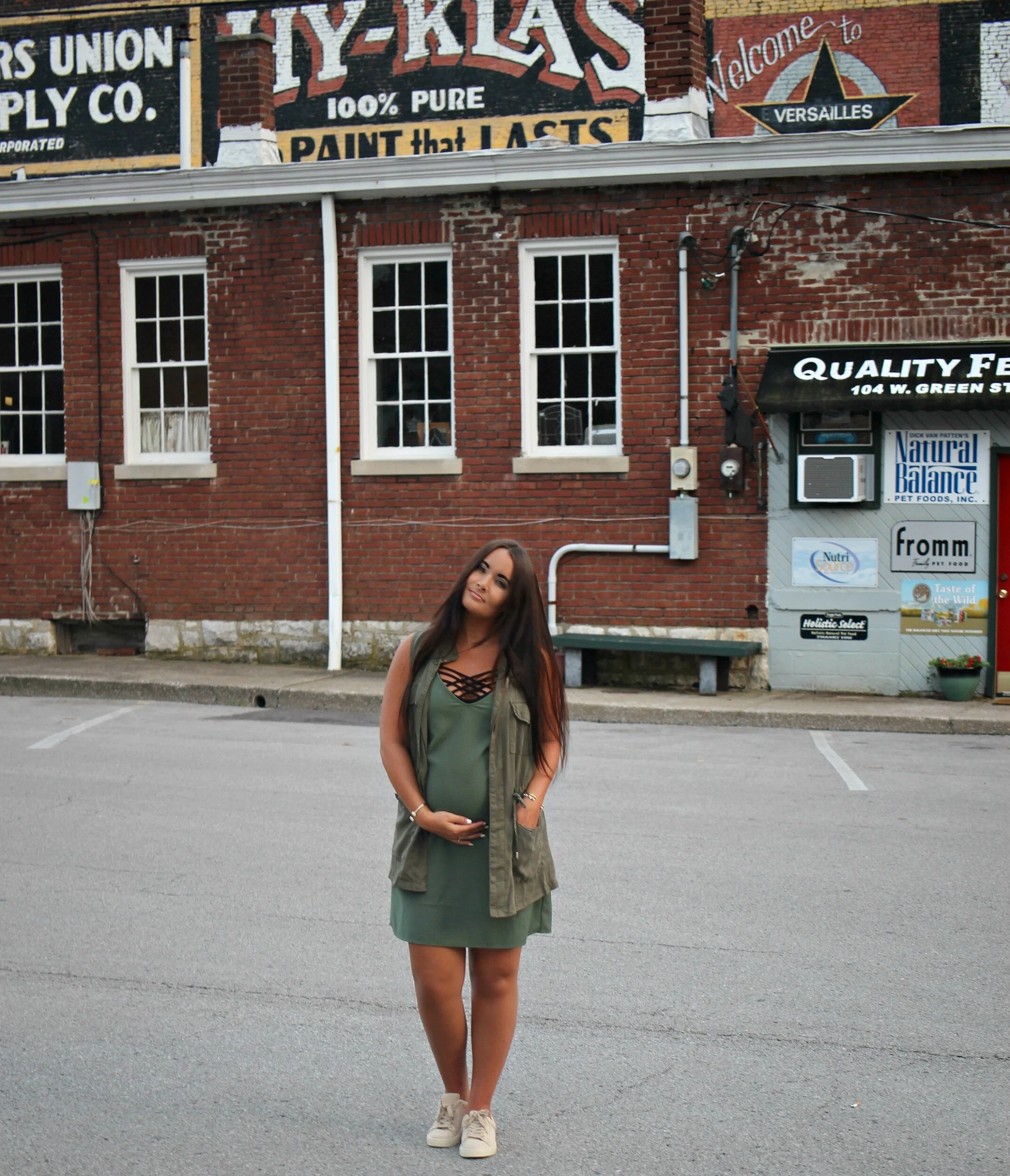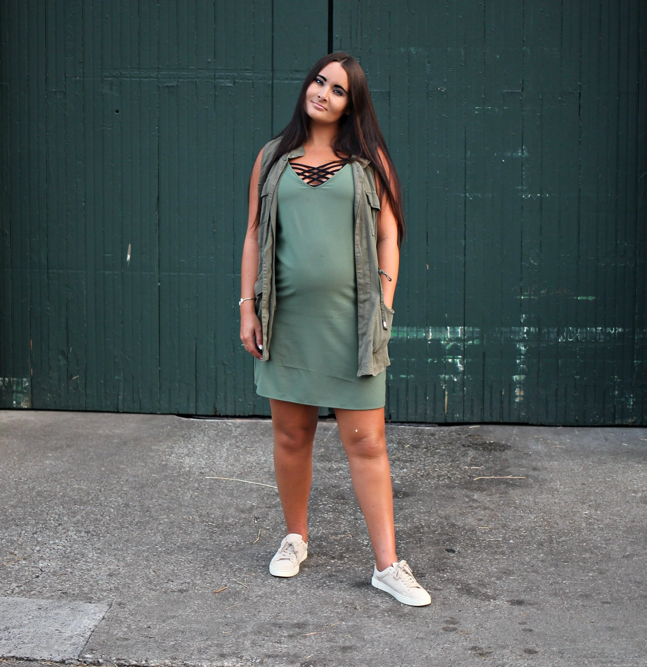 Today marks 27 weeks in my pregnancy and I am officially running out of "regular" clothes to wear. These are a few of my tried and true pieces that have been getting me by until I absolutely HAVE to buy maternity clothes (still putting that off because I'm stubborn!). This simple slip dress can be worn so many ways and has enough room to fit this belly too (for now). I've also been layering a lot and this vest is perfect for throwing on over dresses, tees + shorts, and more. I pretty much wear it year round and I definitely see a lot of vests and kimonos being worn throughout the rest of my pregnancy. I really have been into layering tone on tone colors lately and these two olive tones are great for late summer and into fall. I've linked all my outfit details for you to shop above + below!