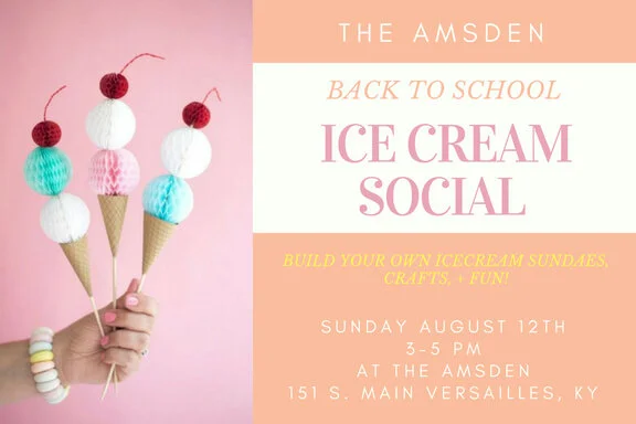 Join us this Sunday for a Back to School Ice Cream Social at The Amsden! Bring the whole family to take part in our build-your-own ice cream sundae bar for just $5! We'll also have coffee milkshake specials, free crafts for kids, + party favors (while supplies last)! This event is for ALL ages: adults, kids, highschoolers, + college students! Find all the details below!