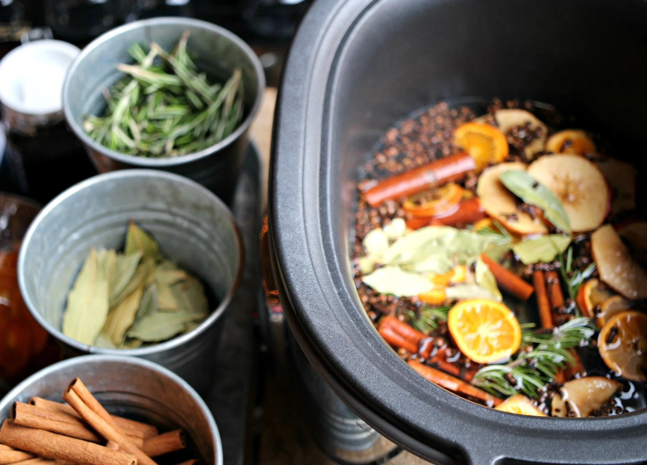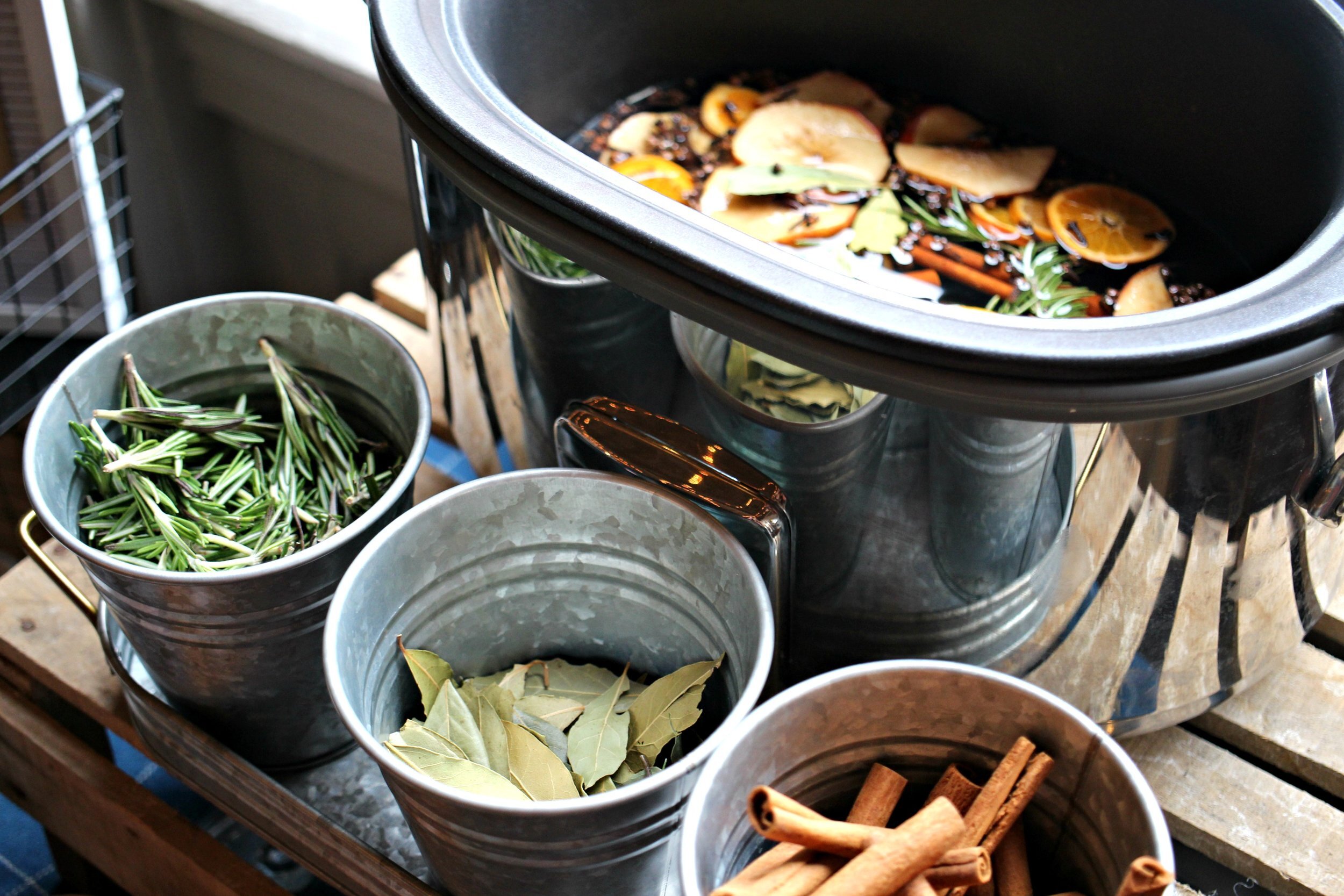 6. Create a batch of simmering scent by taking a handful of each ingredient: 3-5 slices of each fruit, 6-8 cinnamon sticks, 1/4 cup cloves, 2-3 small sprigs of rosemary, and 2-3 bay leaves. Top with a couple of drops of vanilla.