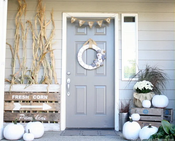 An all-white and super natural look with a handmade pallet sign as the focal point. Add height with foddershocks behind your sign and then balance it out with a stack a crates, pumpkins, and mums on the opposite side of the door.