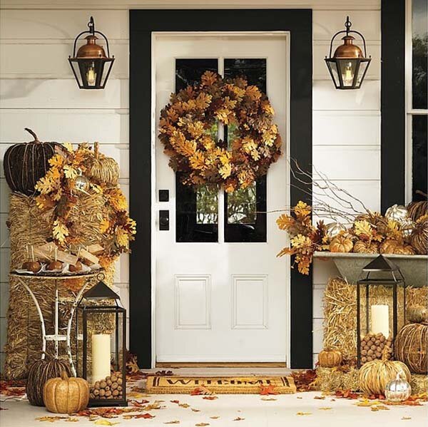 A beautiful fall color scheme full of coppers, golds, ambers, and browns. You can turn haybales two different ways on each side of the door to create different heights for stacking items on top. Faux leaves, foliage, and sticks becomes perfect filler for both sides of the door as well.