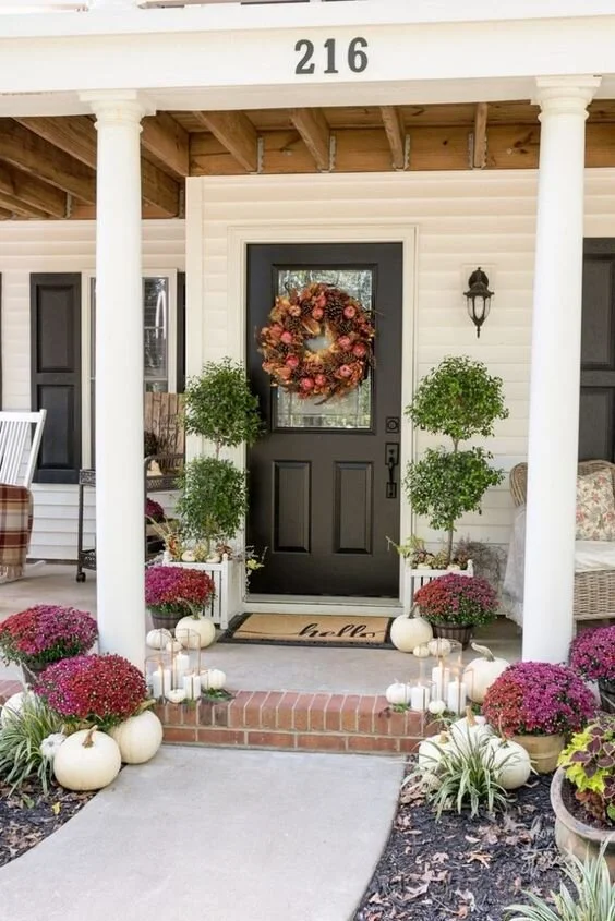 Another gorgeous green + white set up with garland adorning the doorway and pumpkins accessorizing the topiaries. A more scattered look aligning the stairs helps break up the simple symmetry happening on each side of the door.