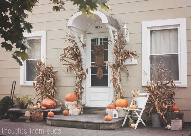 Make use of your steps to fit the most decor on your small porch! Hay bales make a perfect platform for stacking pumpkins or mums and garland is just another way to adorn your door!
