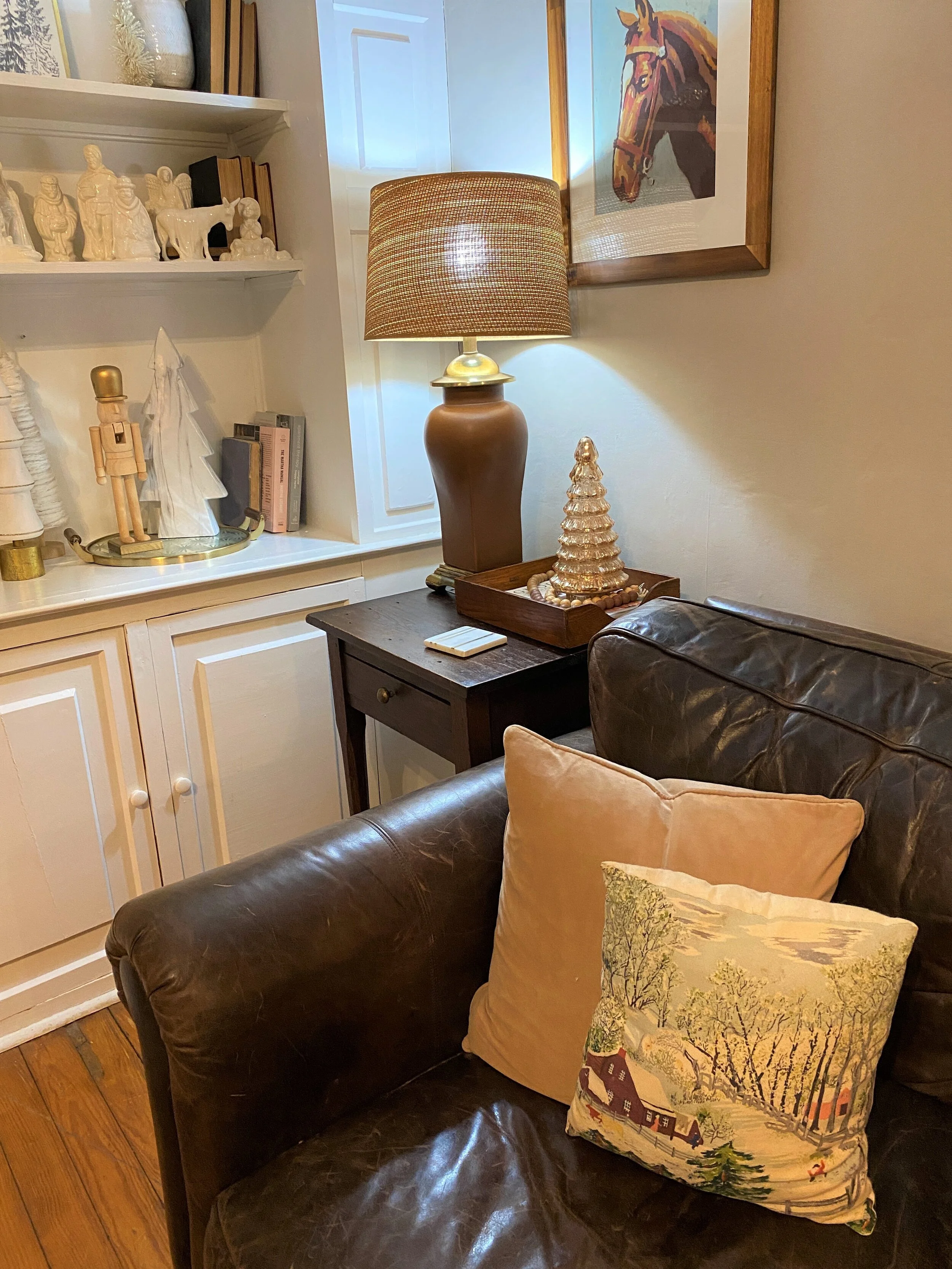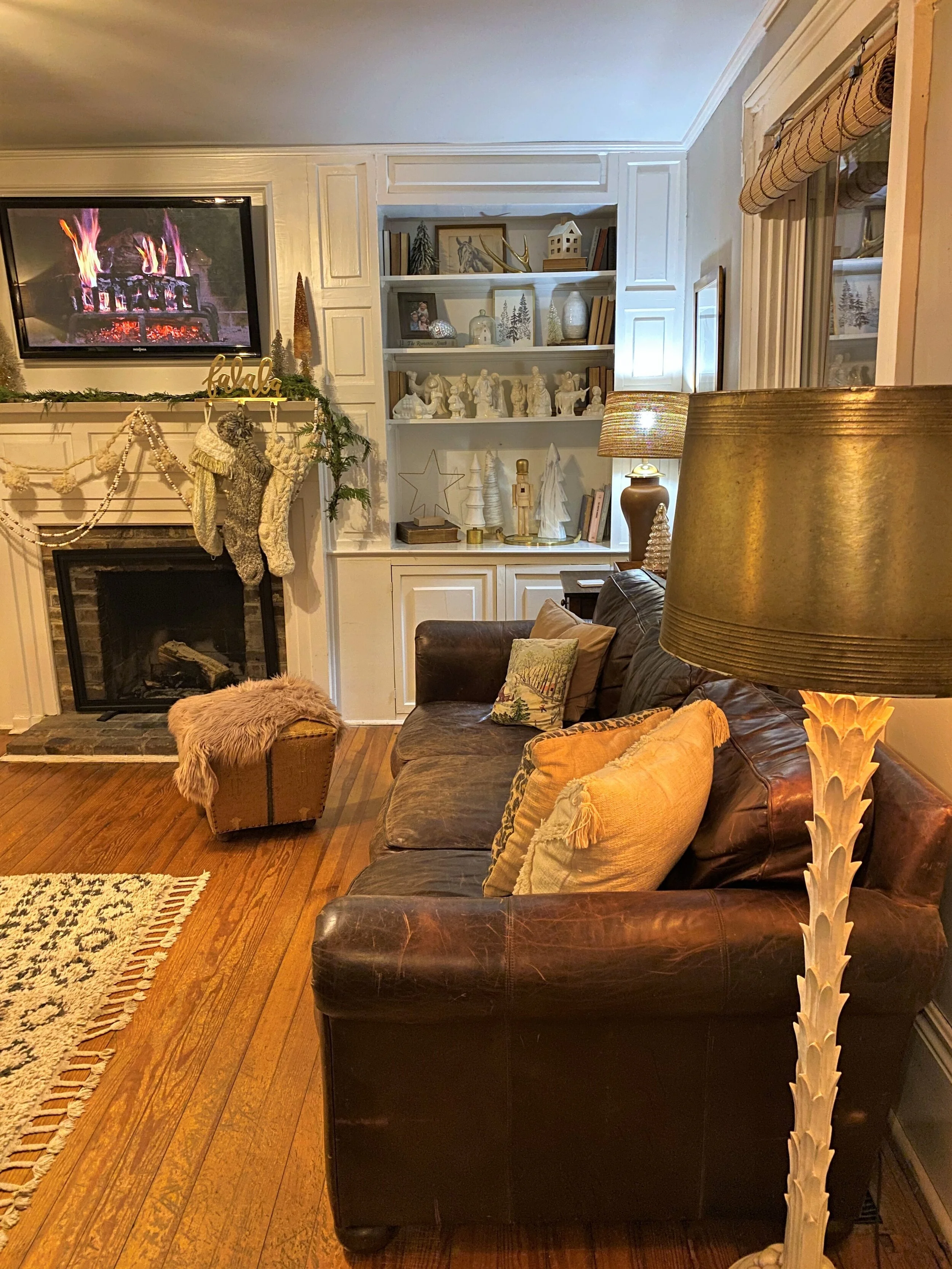 My favorite part of this room is always the tree- I love the mix of colors and different size ornaments- from the giant stars and pom poms to small glass globes and layered lights and garlands. I also usually switch out a lot of items on the built in shelves so I can fit plenty of my Christmas trinkets in there too. This year I also added an all-white vintage ceramic nativity scene to one shelf which I really love! I really enjoy decking out the mantle in here too and this year I kept it pretty simple- layering a few garlands and adding my stockings off to one side with lots of bottlebrush trees grouped on each side of the TV.