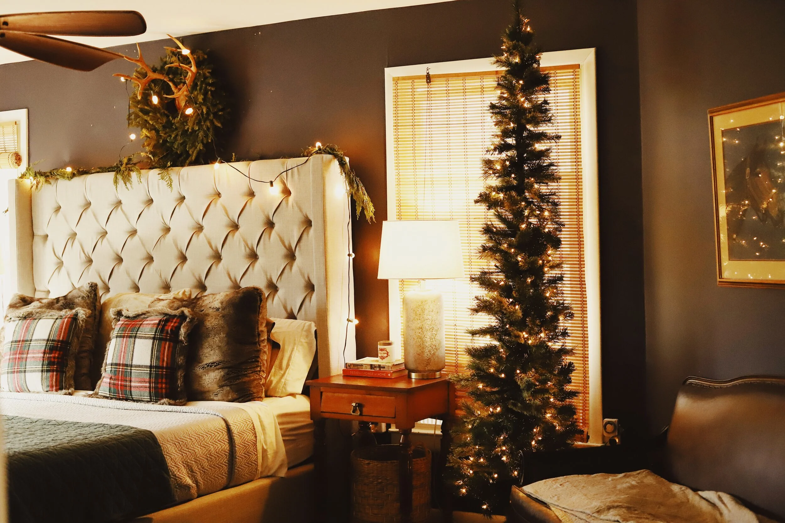 Bedrooms can be extra magical when decorated for Christmas and the epitome of cozy! I love adding a small tree and some twinkle lights to our bedroom every year. The antlers above our bed made the perfect base for layering a wreath (this gorgeous fresh wreath is courtesy of Hillenmeyer’s Christmas Shop) and stringing some bulb lights, and I also added some fresh garland along the top of the headboard too. I also usually switch out our bedding for the winter and add some heavier layers, like this velvet quilt, and mix in some faux fur and wool pillows too. The end product is a space so cozy you never want to leave! You can shop my bed and other bedroom decor linked below!