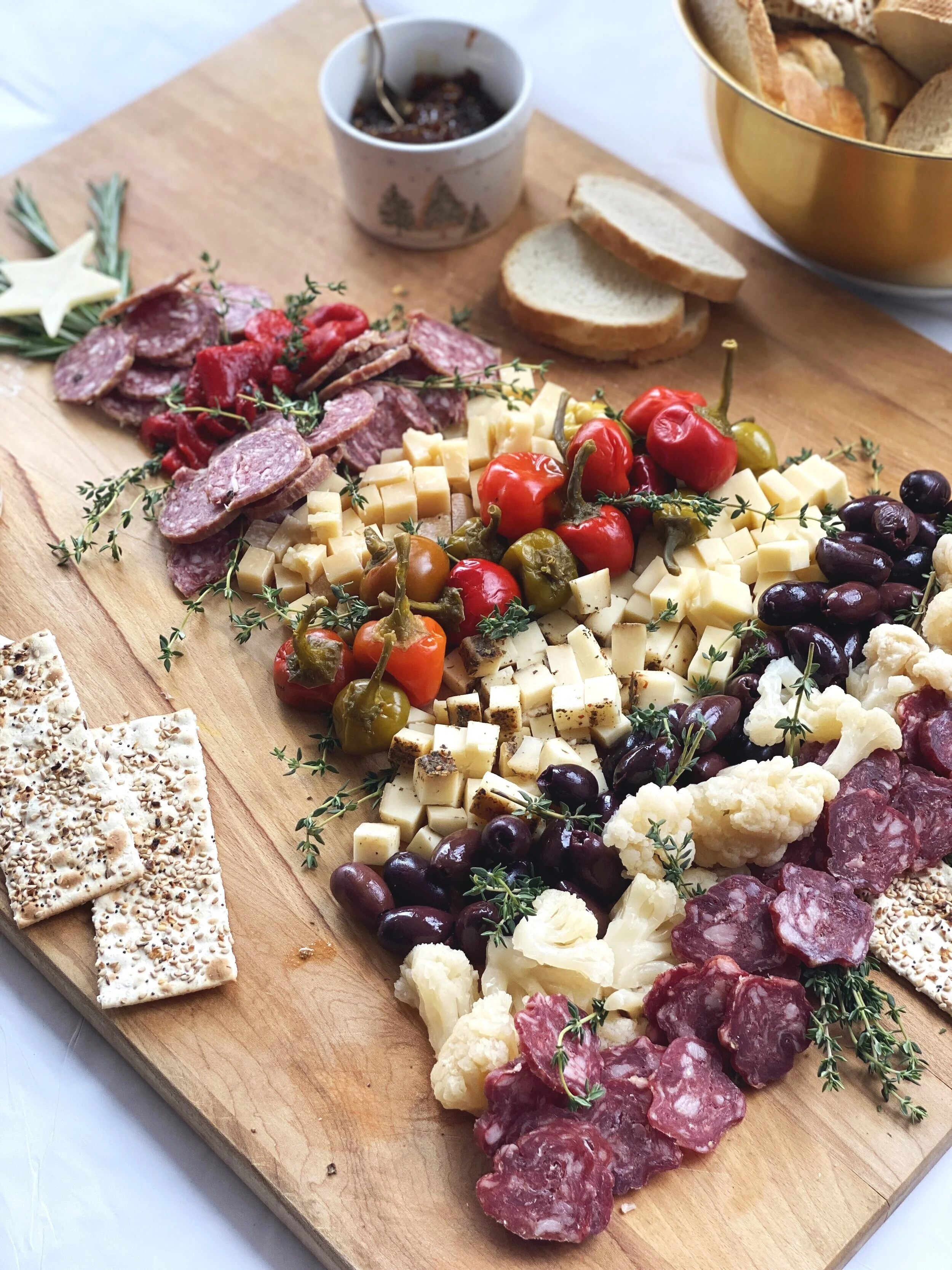 What’s more festive (and delicious) than a Christmas tree antipasto platter? It’s so quick and easy to put together and perfect for your holiday entertaining! I’m listing all the ingredients and instructions below but you can totally customize this one with lots of different ingredients! I choose a couple salamis, 3 cheeses, olives, and peppers and layered into a Christmas tree shape! Finish with some fresh thyme and rosemary spread throughout for garnish and use a star cookie cutter to cut out a piece of cheese for the top! Find everything you need to know about putting this together below!
