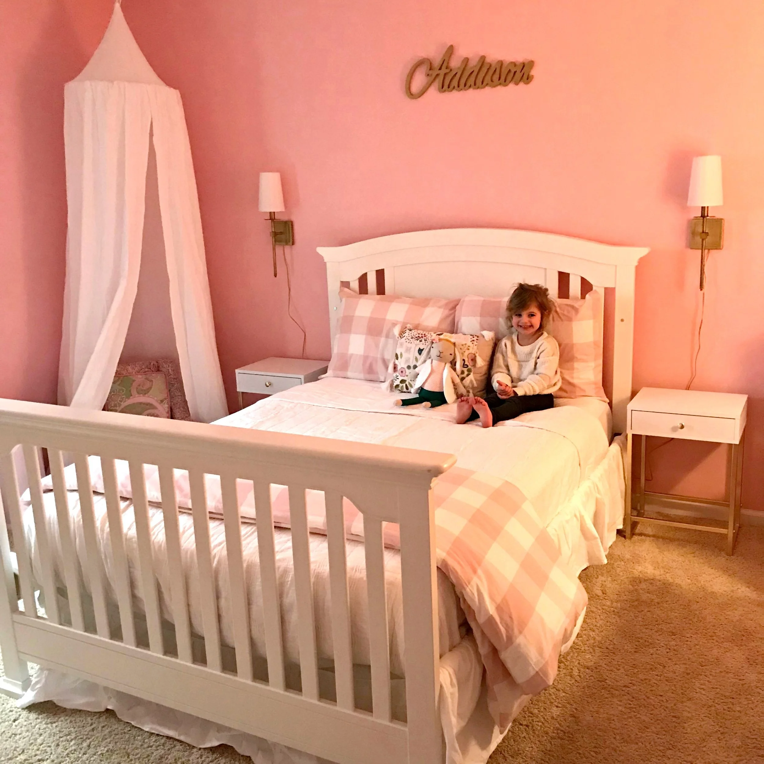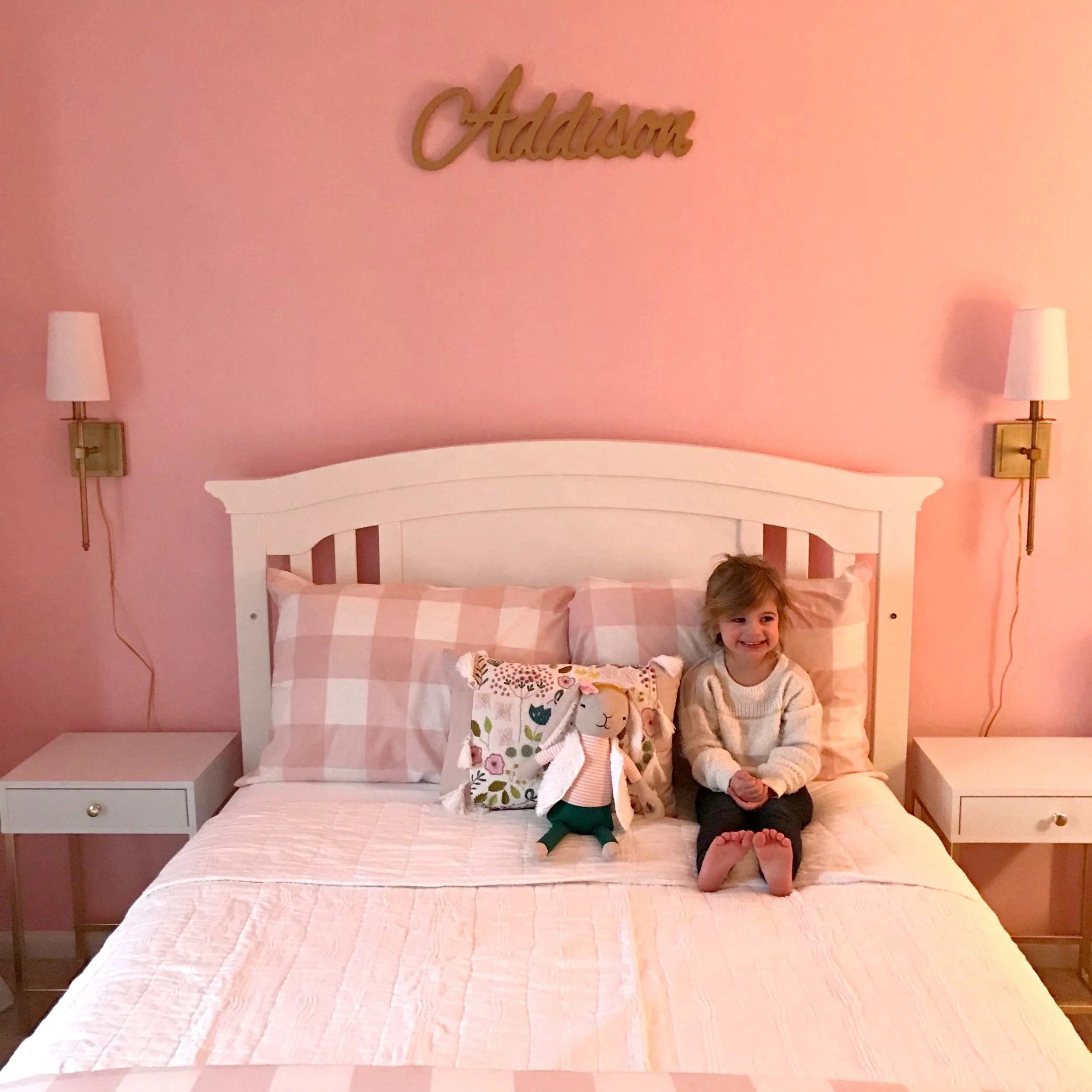 Last week I installed phase 1 of this sweet preppy girl’s room project that I have been working on. My client wanted to update her daughter’s bedroom and make it more of a “big girl” room. Her toddler bed was converted to a full size bed, so she needed all new bedding and bedside tables to go with it! We started by changing up the bedding, adding bedside tables and wall sconces, and new curtains. I’m in love with this gingham bedding which is so girly and fun, but also something she’ll be able to grow into and keep using for years to come. We are also planning on wallpapering the wall behind her bed and adding some more accessories and pillows as well to finish off the space {updated photo above featuring wallpaper!}. You can shop every item I used to update this space below!
