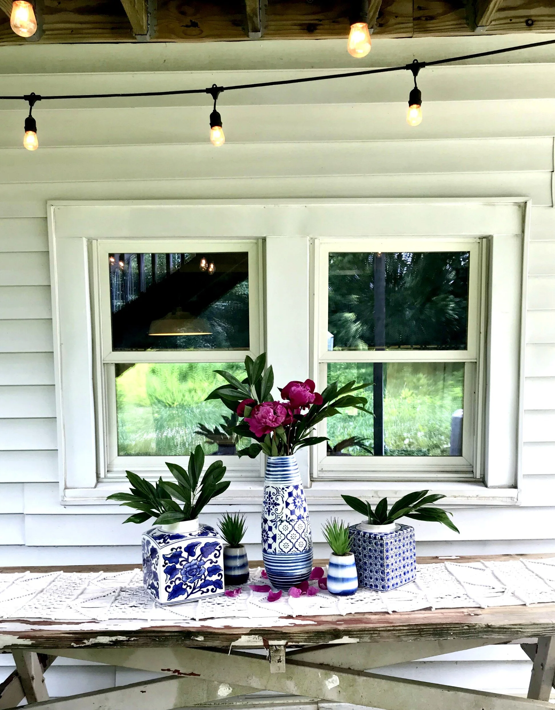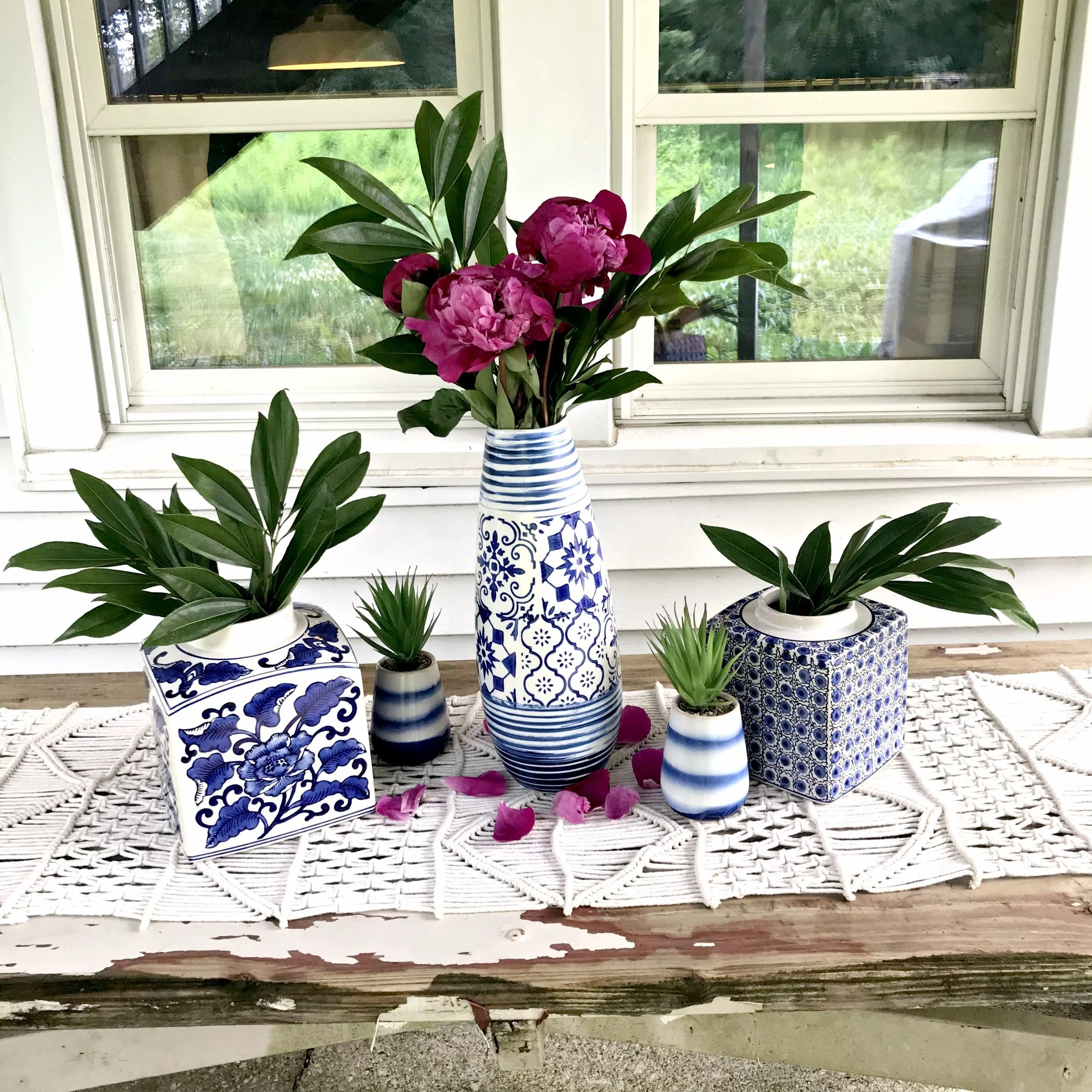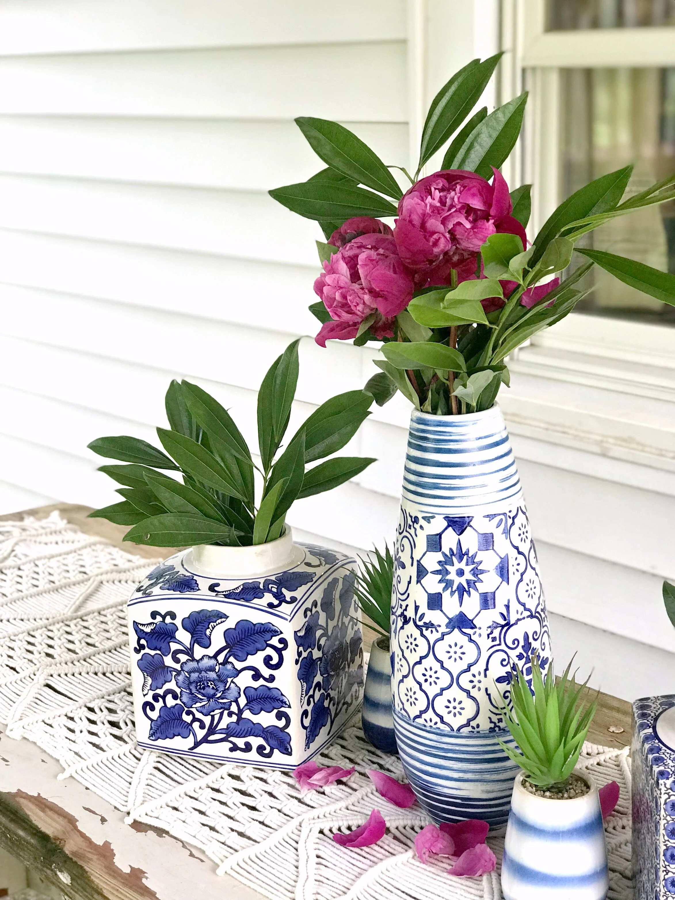 I was so inspired by the variety of gorgeous blue and white jars I found at my Gordmans store so those became the focus of this arrangement. Some bright, colorful fresh flowers really pop against the blue and white, but you can use any kind of fresh or faux stems or greenery to fill your jars and vases. I sprinkled a few of the pink petals around the base too for an extra pop of color. The smallest blue + white pots came with the little faux succulents already inside and were just $5.99 each!