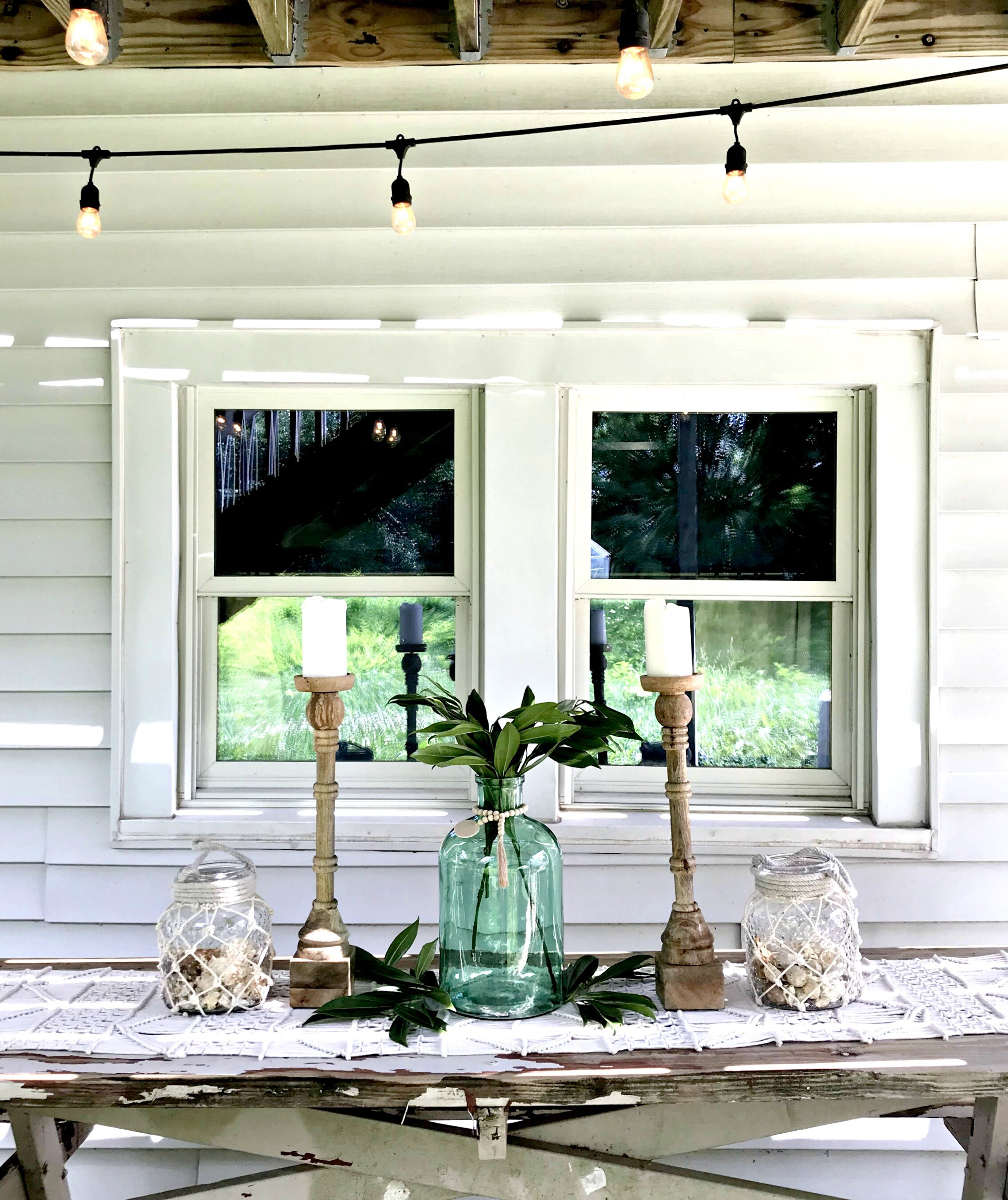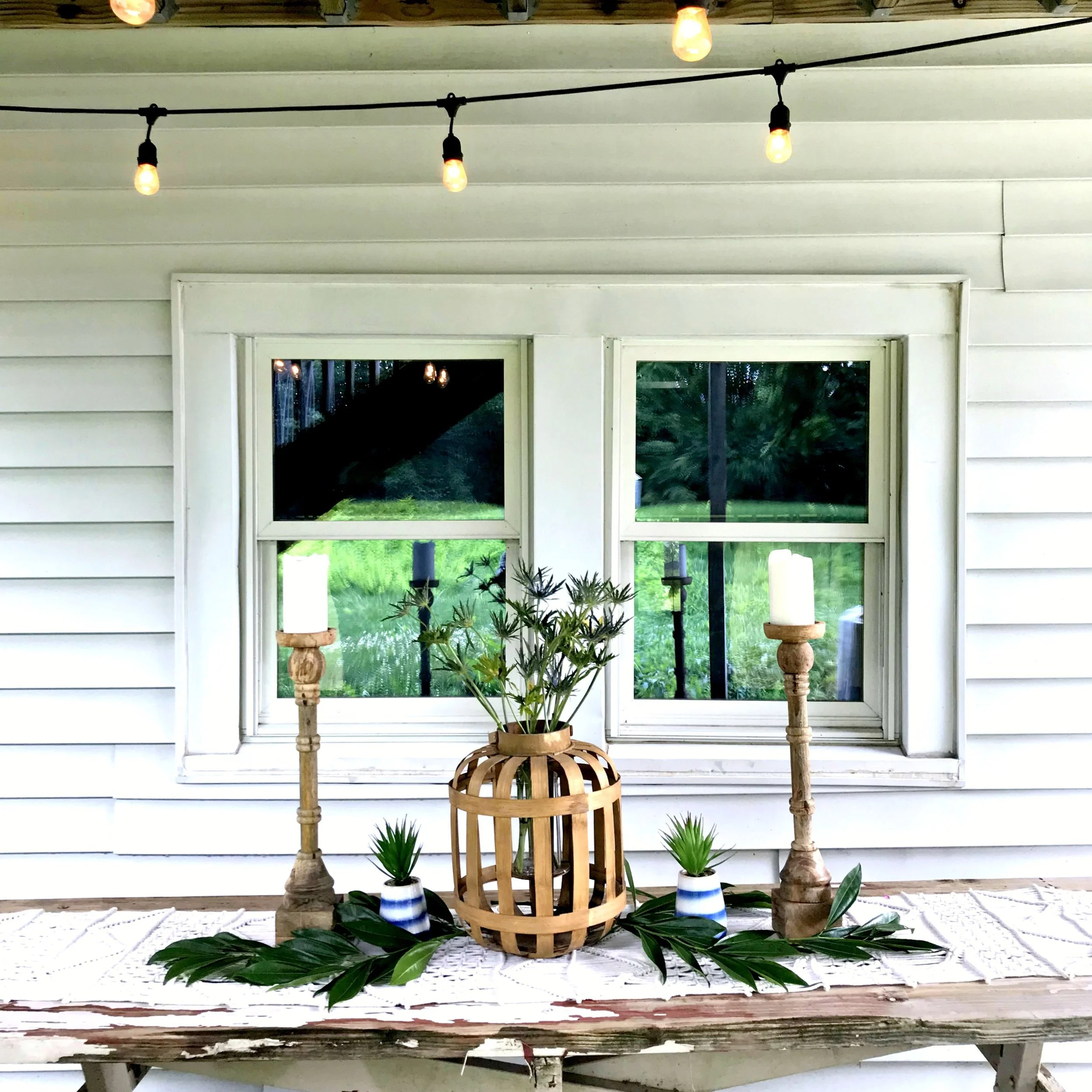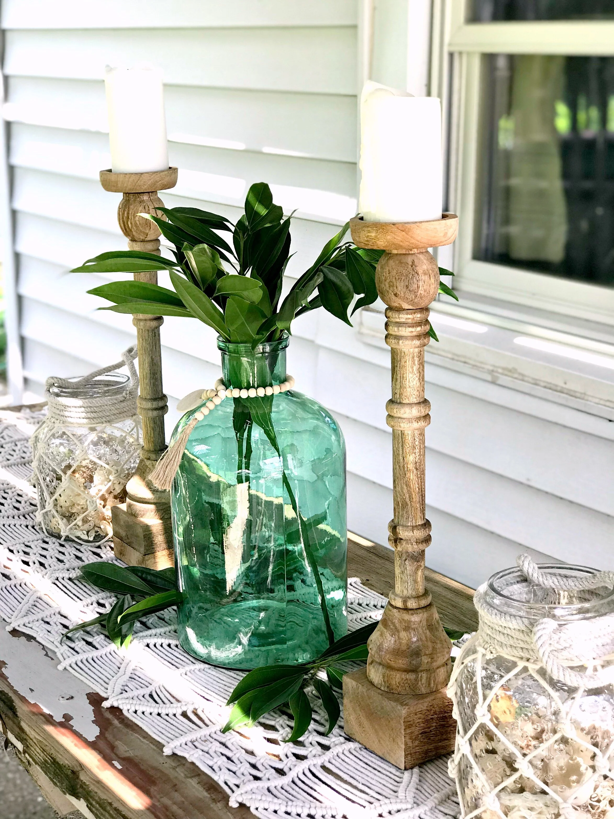 Gordmans also had so many fun nautical and beach themed accessories for summer, so I figured a modern, beachy arrangement was a must! I love this beautiful glass jar that came with the wooden beads and tassel around it (just $16.99!)- add a few leafy stems and it becomes a perfect vase! I reused the wood candlesticks again here then also added these great glass rope lanterns on each side. I filled them each with seashells (the entire bag was just $2.99!) and you could easily add a candle or more stems on top!