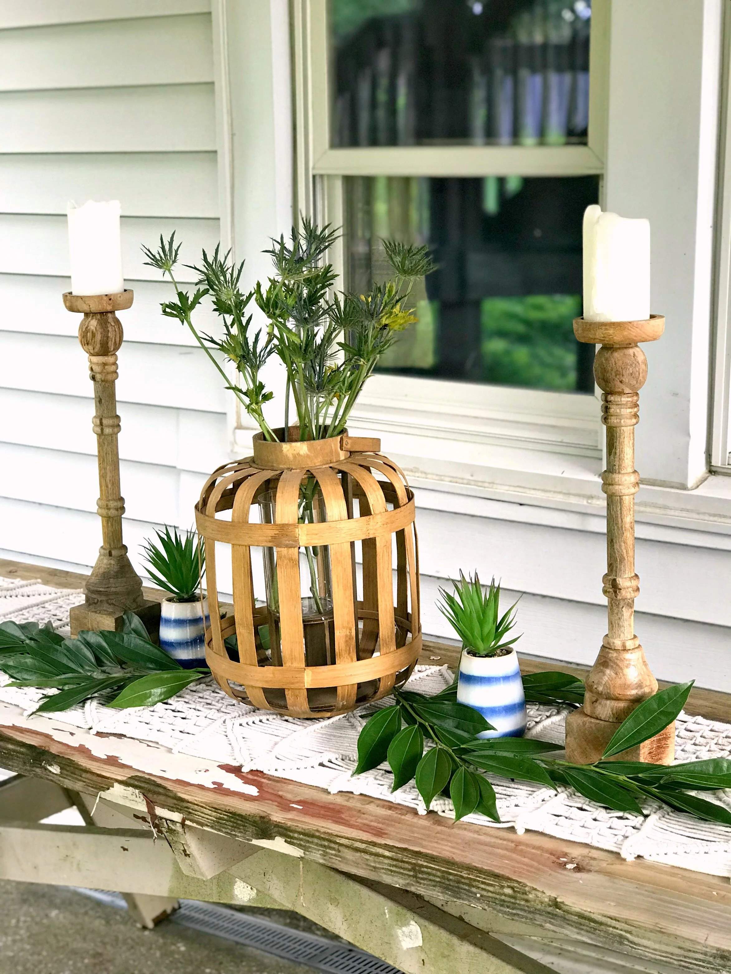This is such a simple arrangement that would really work for any season! I loved these warm wood accents and decided to do an arrangement centered around these beautiful tall candlesticks and fun lantern. I ended up using the lantern as a vase and put some thistle inside. I reused the mini succulents again here and added a few fresh leaves around the base to fill in.