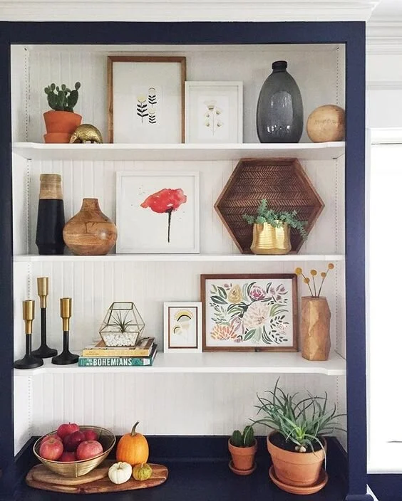 Some of my favorite items to use for styling shelves: old books, framed photos, trays, candles, vases, planters, plants (faux or real), jars, artwork, prints, lanterns, candlesticks/candleholders, bowls, orbs, + baskets.