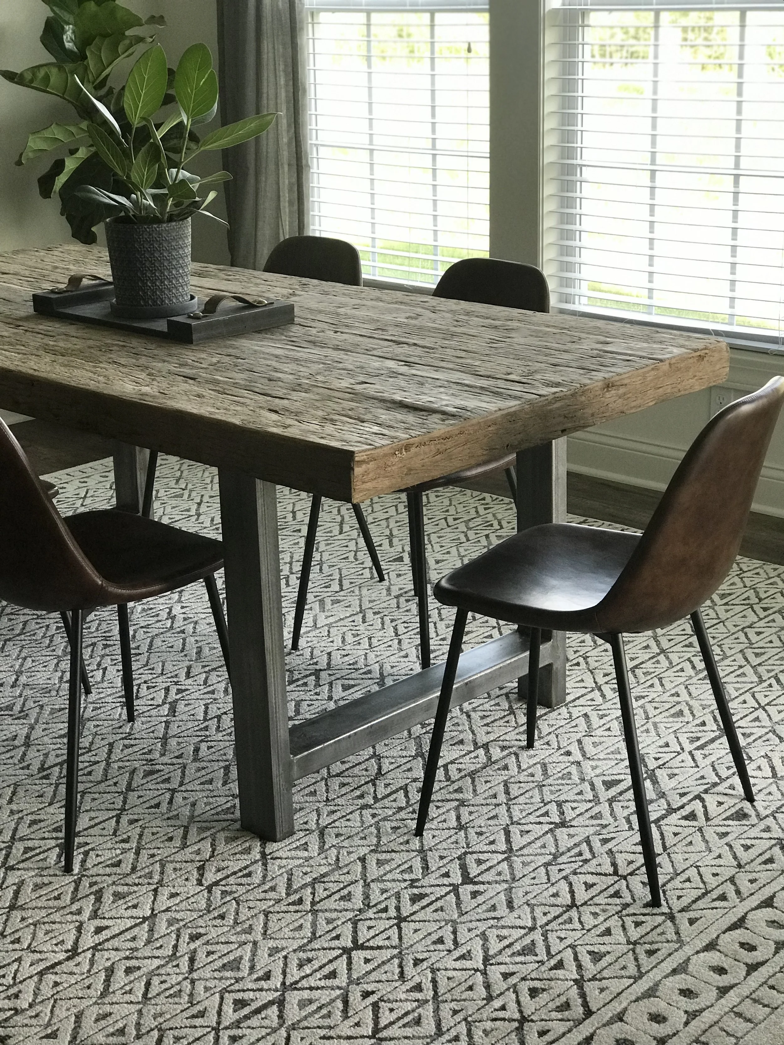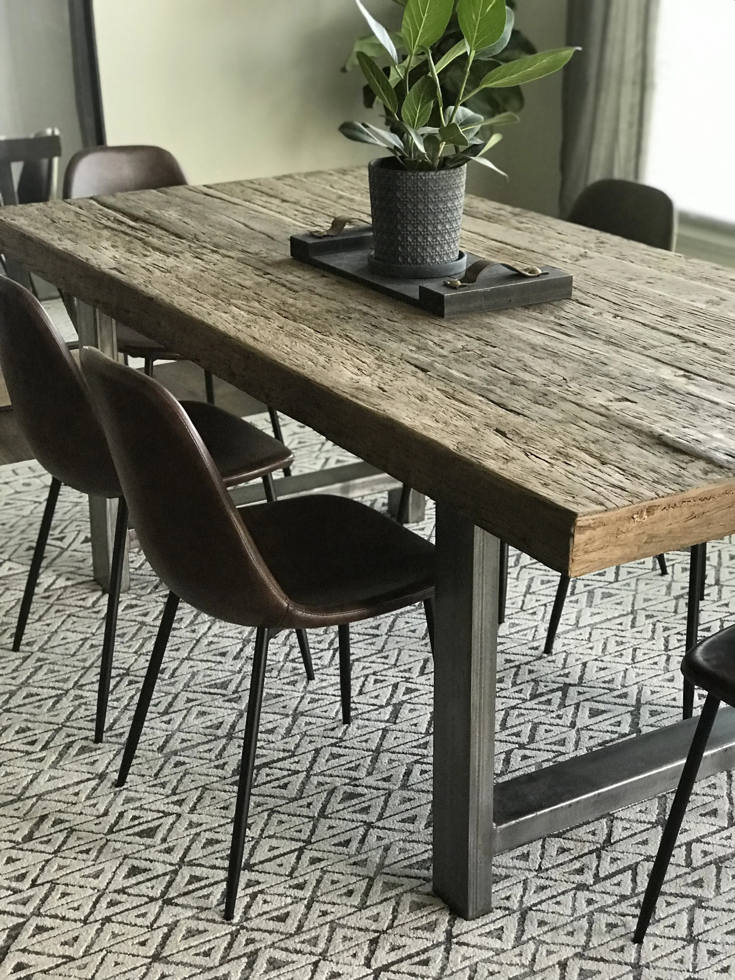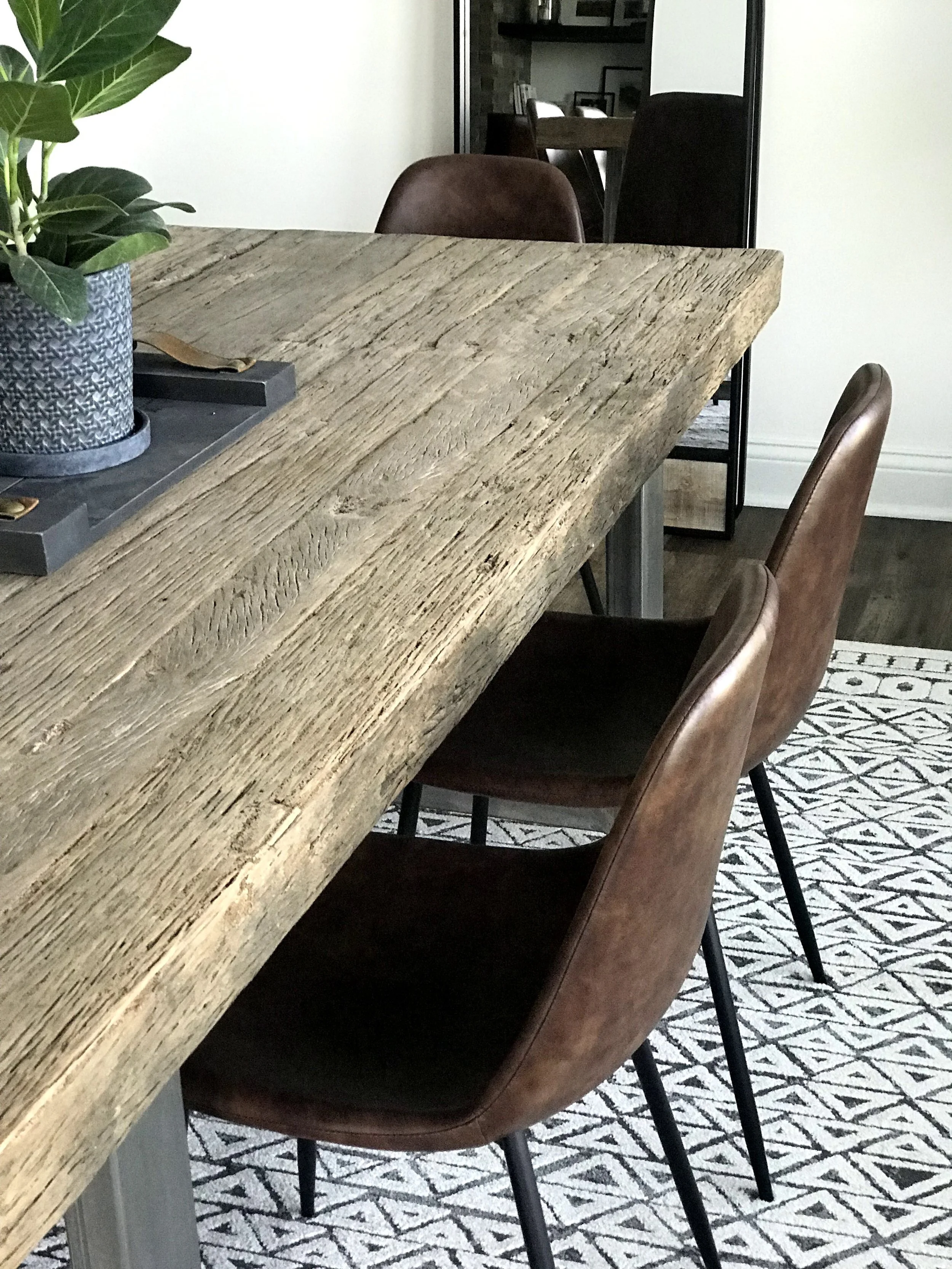 I absolutely love how this table looks in this room especially paired with the clean-lined leather chairs. This table h. What is your favorite part of this room?as a giant chunky reclaimed wood top set on two equally chunky and heavy geometric metal legs. It’s the perfect combination of modern industrial and rustic. As far as accessorizing, we kept it pretty simple- sheer gray curtains, a geometric print rug, and a tray + plant for the centerpiece. We also added a leaning mirror to the center of the wall and a fiddle leaf fig plant to fill in the corner space. We are going to add a bar cabinet to the left of the leaning mirror soon and possibly some additional shelving/artwork above it, which will really complete the space. Now this space is totally functional and comfortable but also looks completely pulled together! You can find a complete budget breakdown, shopping links, + all the details for all the items I used at the end of this post! What is your favorite part of this room?