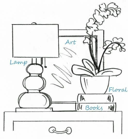 If incorporating a lamp, place that first - usually towards the back center or back side of the table.