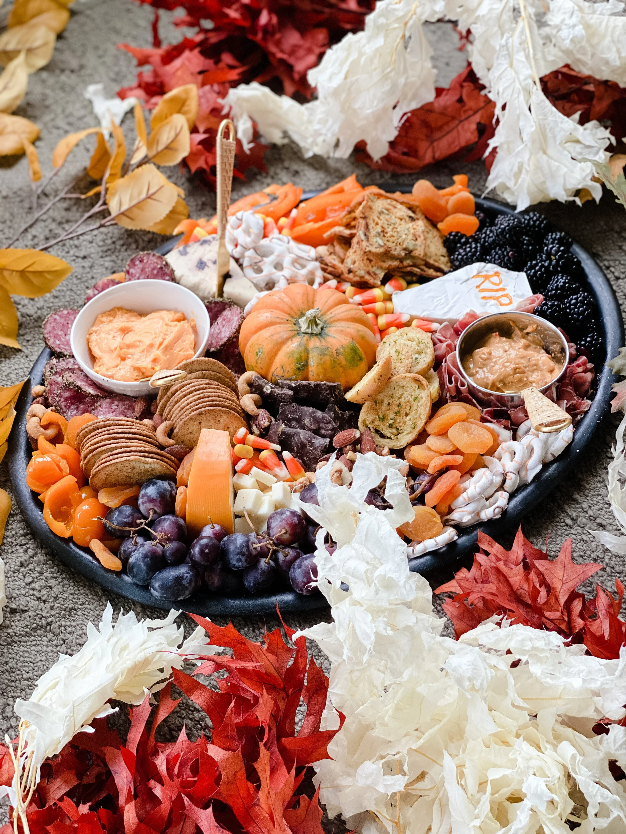 I can’t stop, won’t stop with the Halloween boards and this one is more of a classic cheeseboard with some fun additions! It is so tasty + festive for your Halloween party or activities and has a great mix of sweet, salty, and savory! Everything used can be found at Kroger on this one, but feel free to substitute items and make it your own! You can find the full list of ingredients and instructions for assembling below!