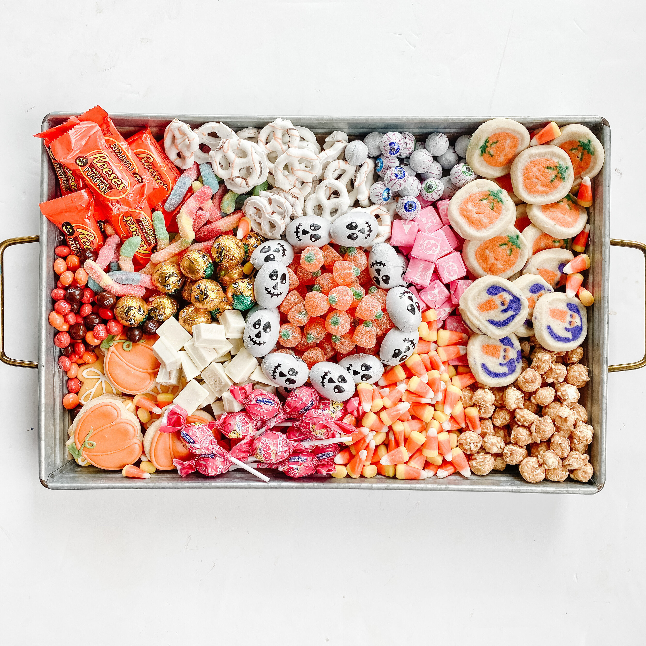 I couldn’t let Halloween pass without one final themed board….a candy board! This is fully customizable- you can use whatever candy, desserts, and sweet treats you have on hand to make your own. This is one of the easiest boards to throw together, and it is sure to be a hit for kids and grown-ups alike! Find all the ingredients and instructions for putting your own together below!