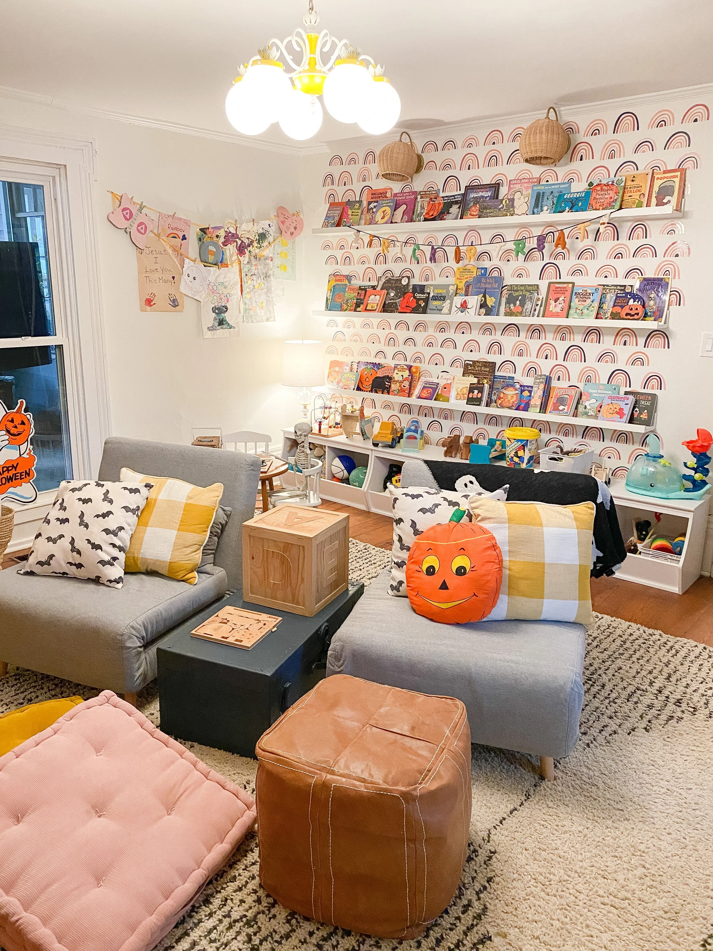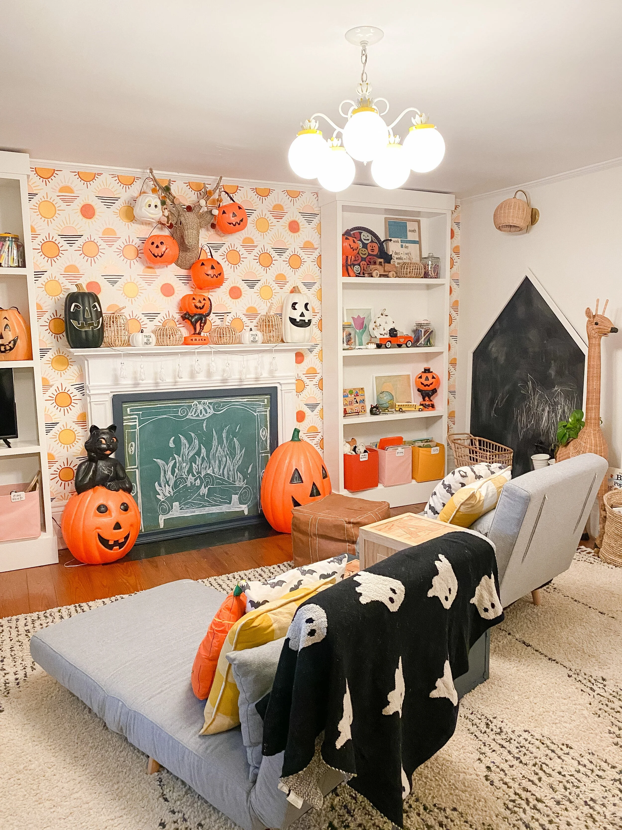 Halloween may be over but I wanted to be sure to share one last space with you on my fall home tour, the playroom! If you were following along this summer, I participated in the One Room Challenge to makeover my son’s playroom. This entire room came together in 8 weeks, and it was full of DIY projects and vintage finds. You can read more about the playroom makeover and any sources for the space here. Now that the holidays have arrived, I’m having SO much fun adding in seasonal decor. I’ve been collecting vintage decor for years, but I’ve linked several options below so you can recreate this look!