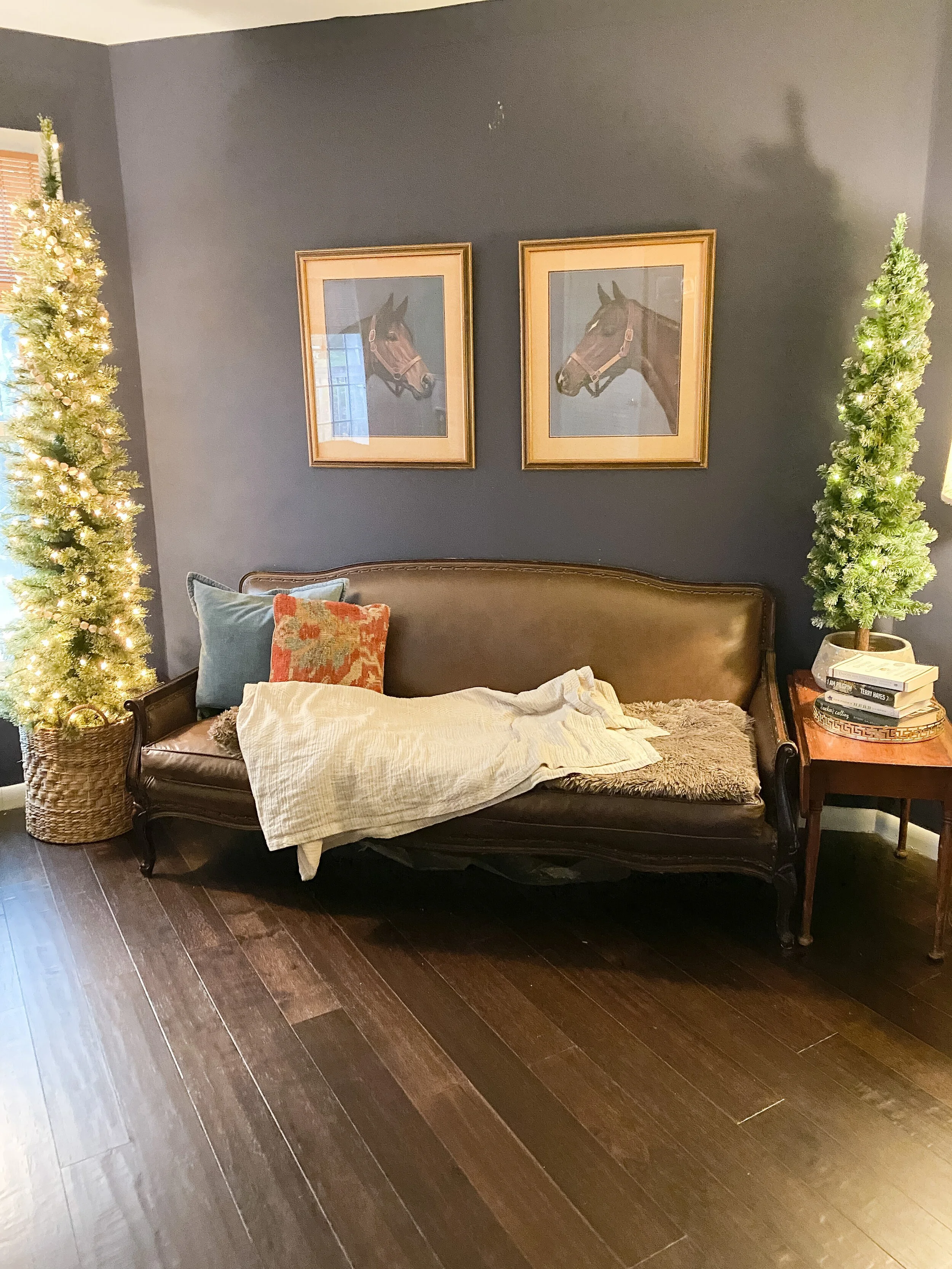 Christmas time means my master bedroom is at its peak coziness level! I’ve been slowly chipping away at refreshing this space. So far, I’ve added new bedding and nightstands, and I’m excited to jump into more updates in the future. For this holiday season, I jumped on the chance to do double trees in another room, with a pencil tree on either side of the bed. I love the size of these trees- you can add one to just about any space for instant coziness. I kept the tree decor pretty minimal with some wood bead garlands, and added warm tones to the bedding for subtle holiday touches. I spruced up my antlers and bed frame with greenery to complete the look! I linked my decor below but if you have any questions about anything else- just ask in the comments below!