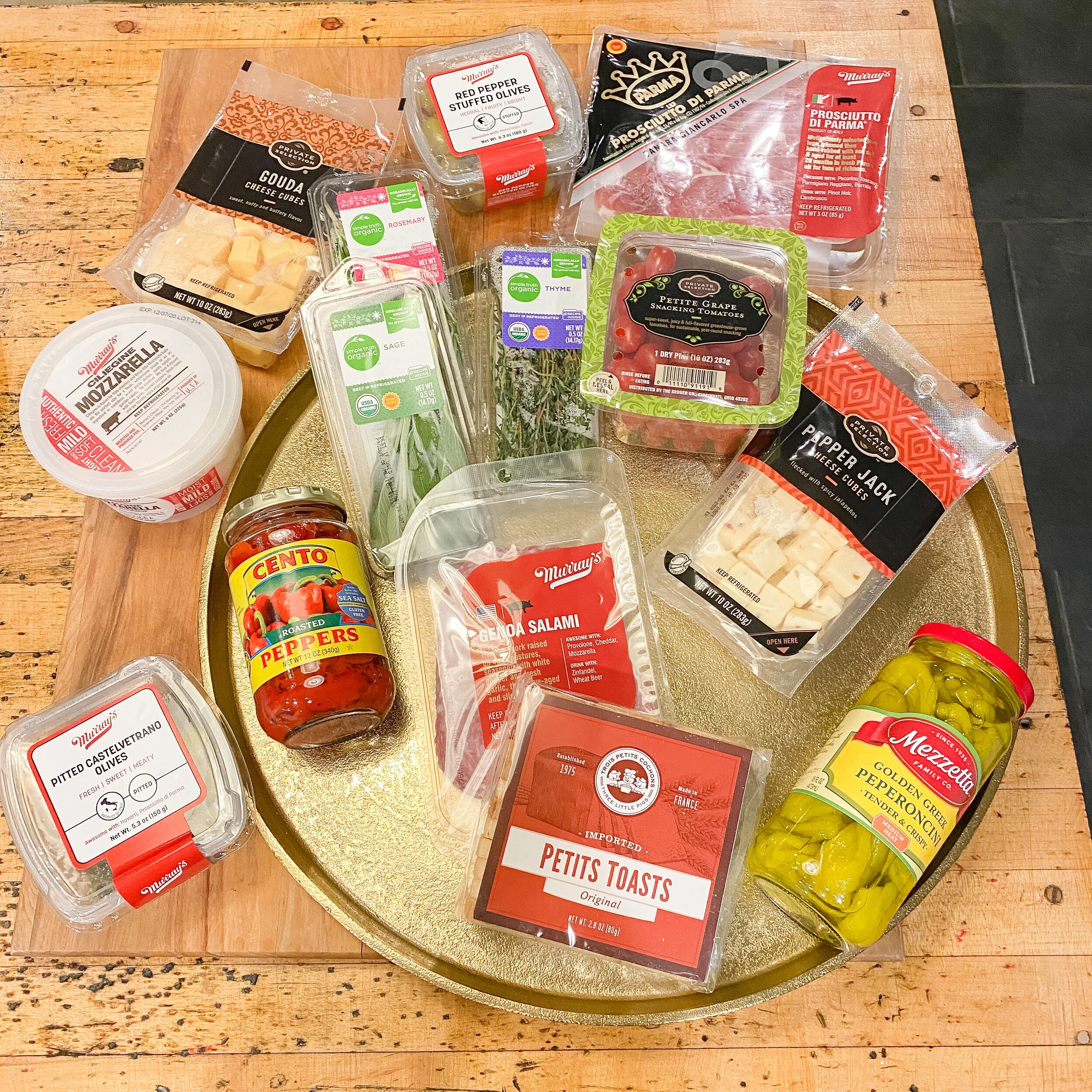 Start with an empty board, platter, or tray. If you have a round tray, even better! Lay a sparse circular wreath pattern using about half of your fresh herbs around the perimeter of your tray.