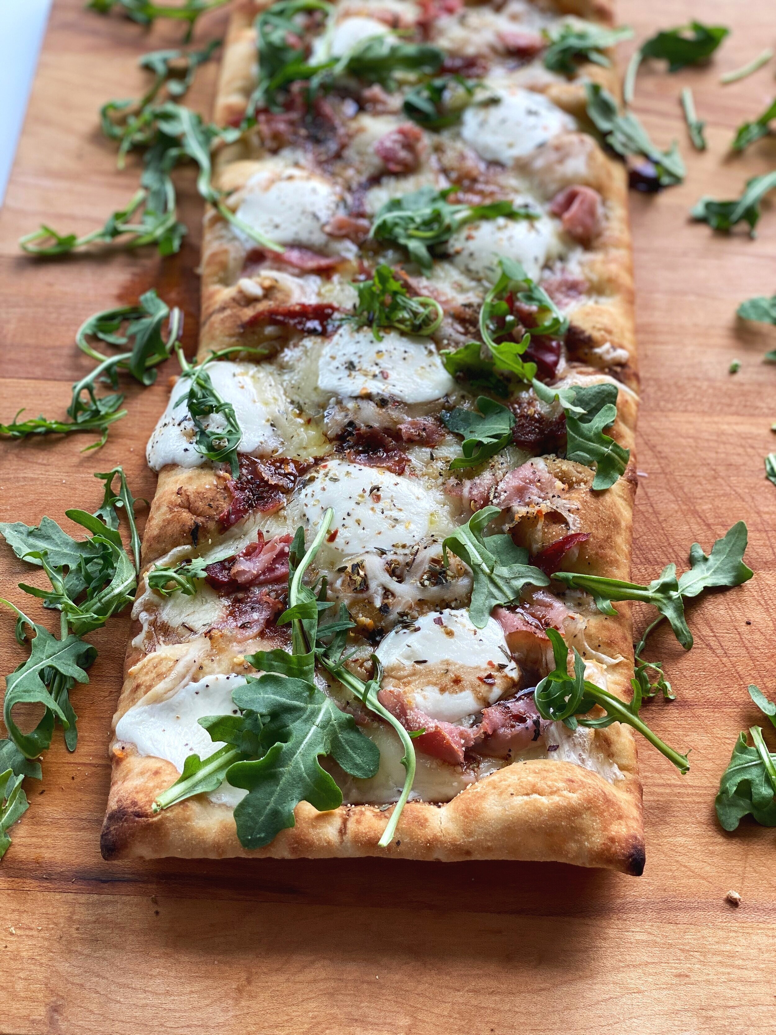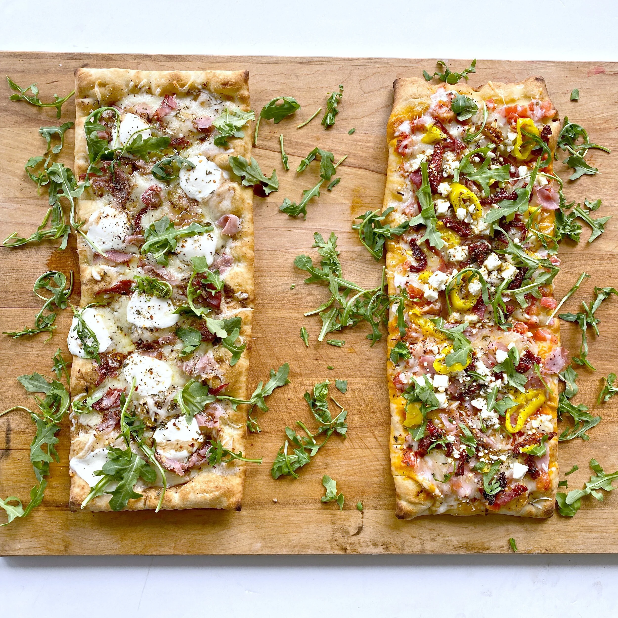 I wanted to share an easy and favorite recipe that you can easily make using whatever leftovers you may have in your fridge and pantry! There are a couple of options for the crust. I used Trader Joe’s pre-made flatbread pizza crust (available in the bread section). However, Trader Joe’s also has great pizza dough, but it will require an extra step when preparing these pizzas. If you don’t have pizza dough available, you can use any kind of French bread, baguette, flatbread, or naan that you have!