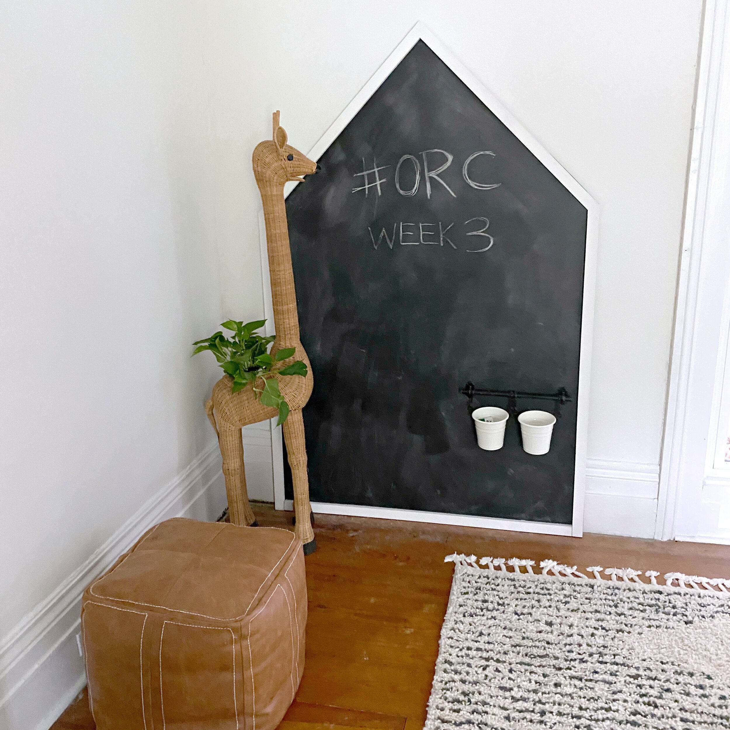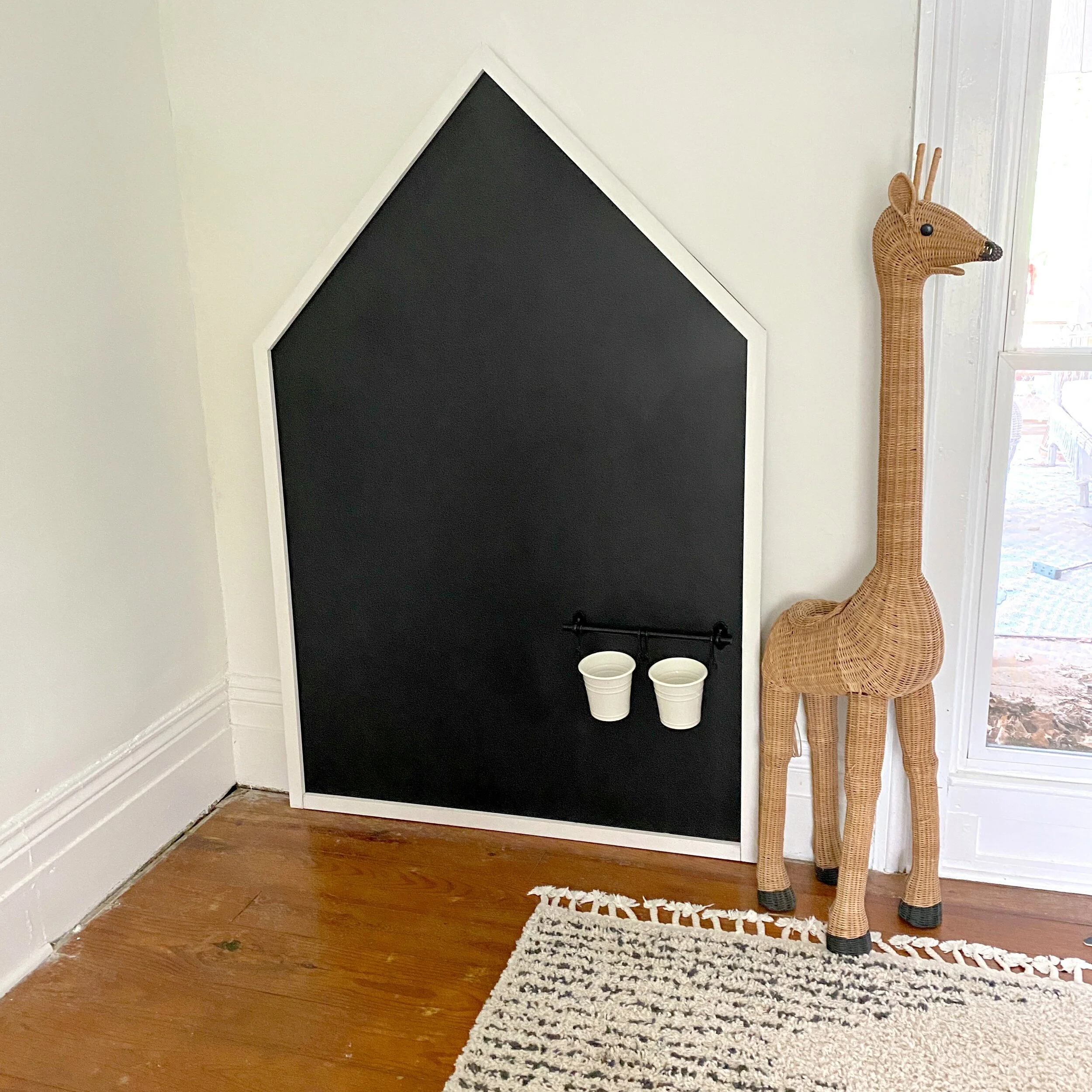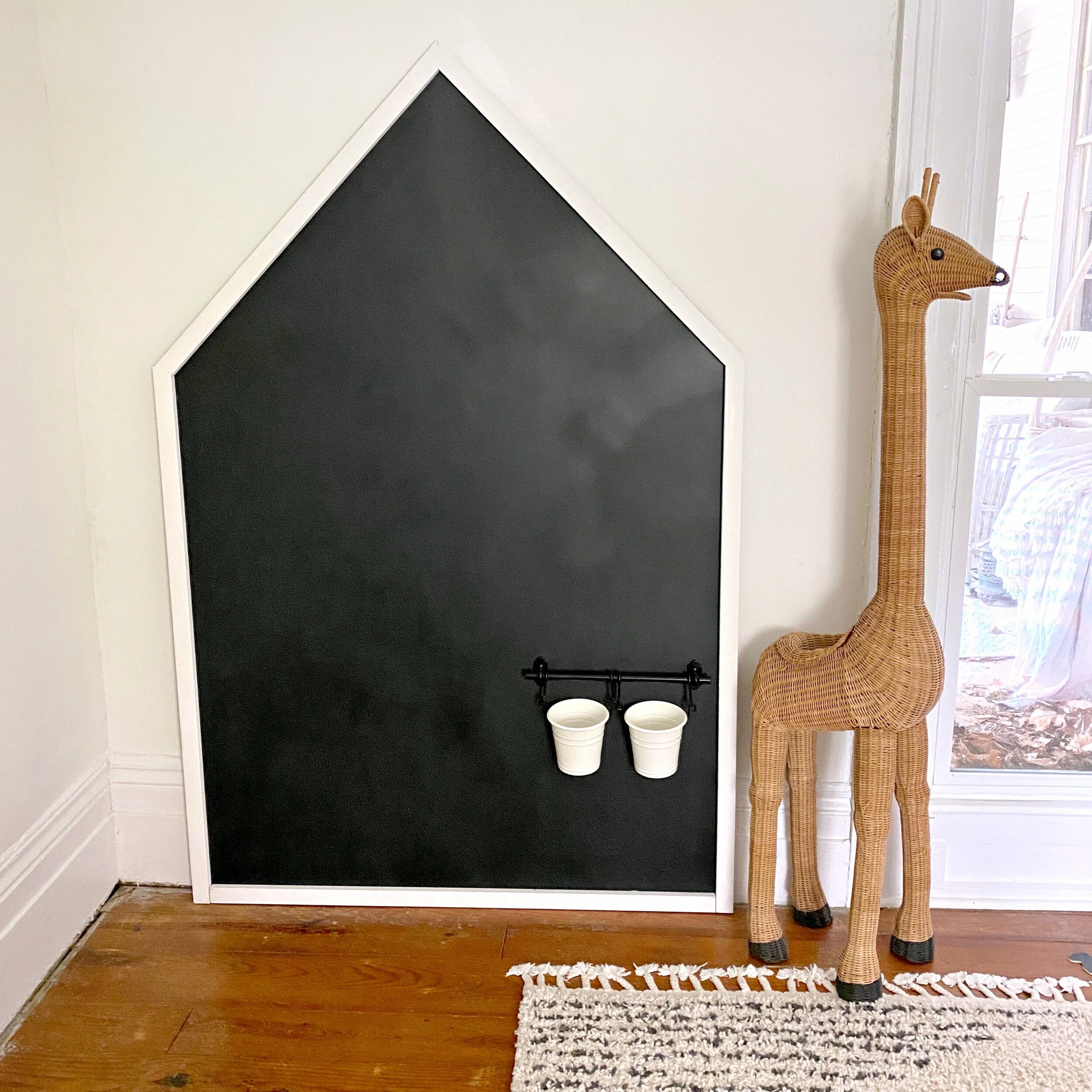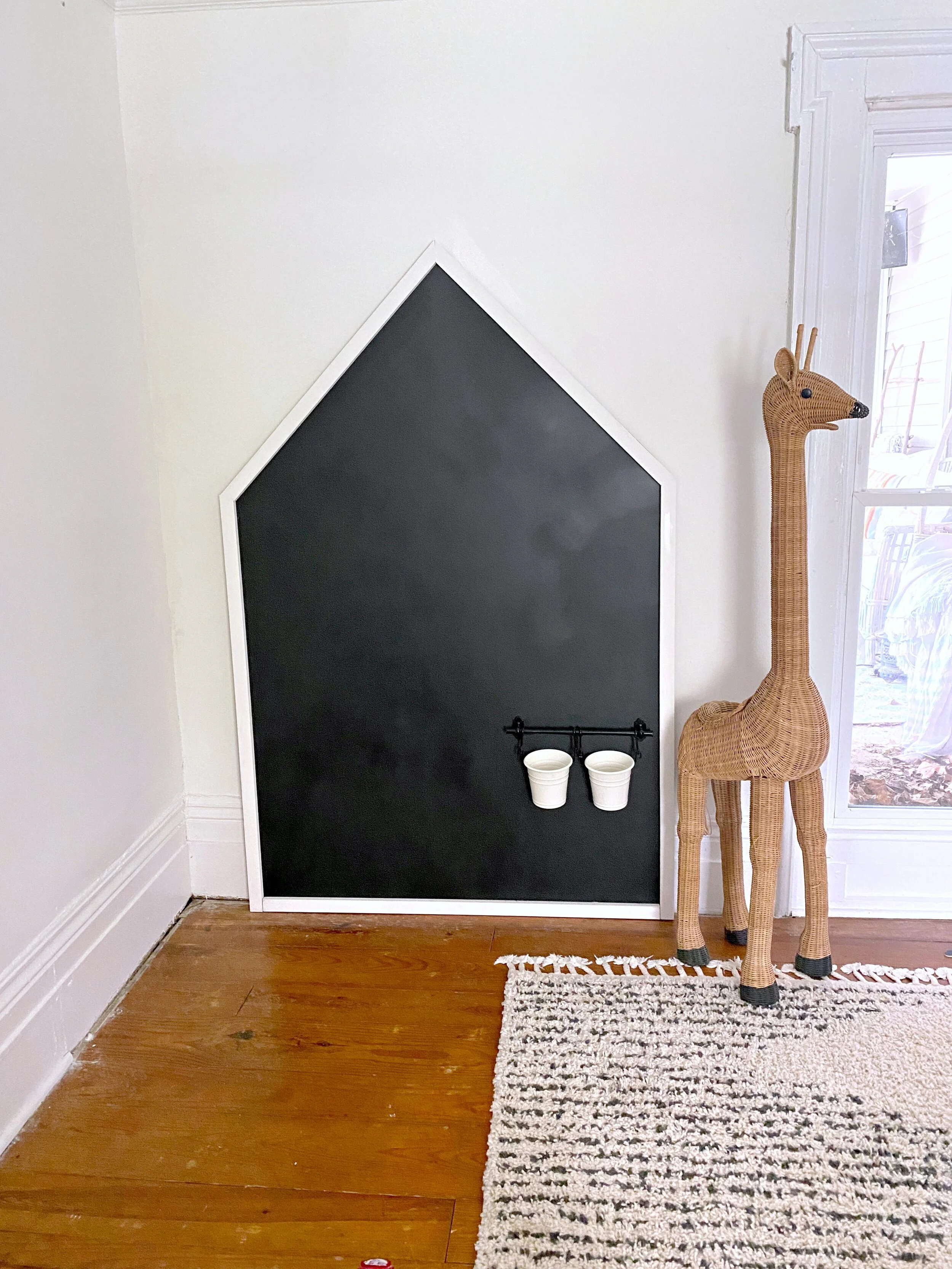 I kept seeing these cute chalkboard walls in the rooms I was saving for inspiration for our playroom makeover and fell in love with the idea of an oversized chalkboard to fill one of the walls. We decided to tackle this project ourselves, as I wasn’t able to find a pre-made chalkboard like this for a good price. This entire project cost about $30 to make (assuming you already have the tools you need!). Below I’m laying out what supplies you need and step by step instructions for this easy project! You really could make this other shapes as well besides the house shape if you want! It’s such a fun and functional way to fill an empty way in a nursery, kid’s room, or playroom!