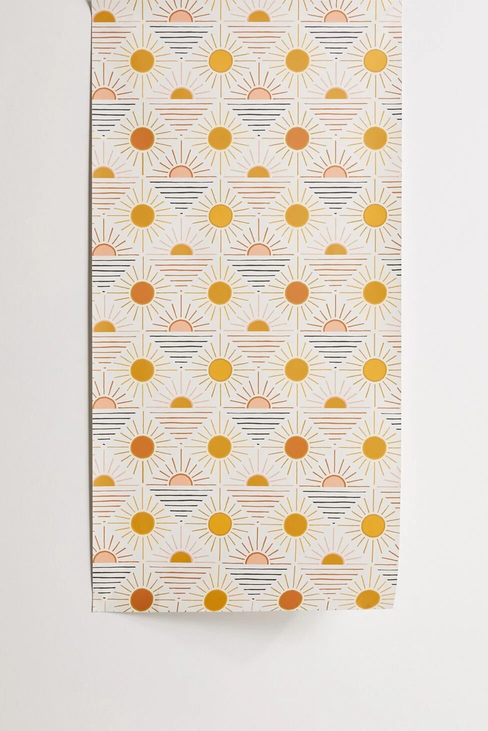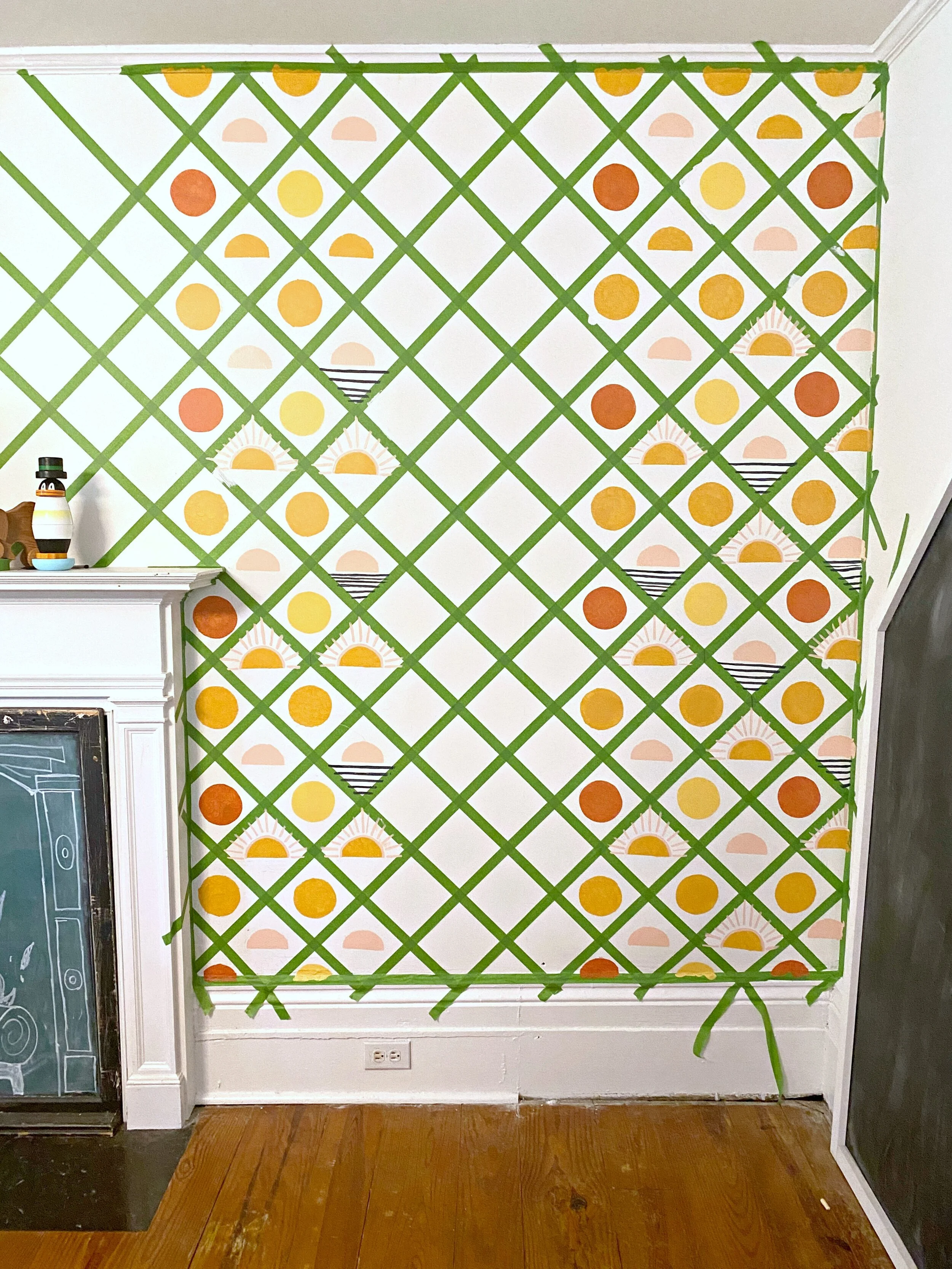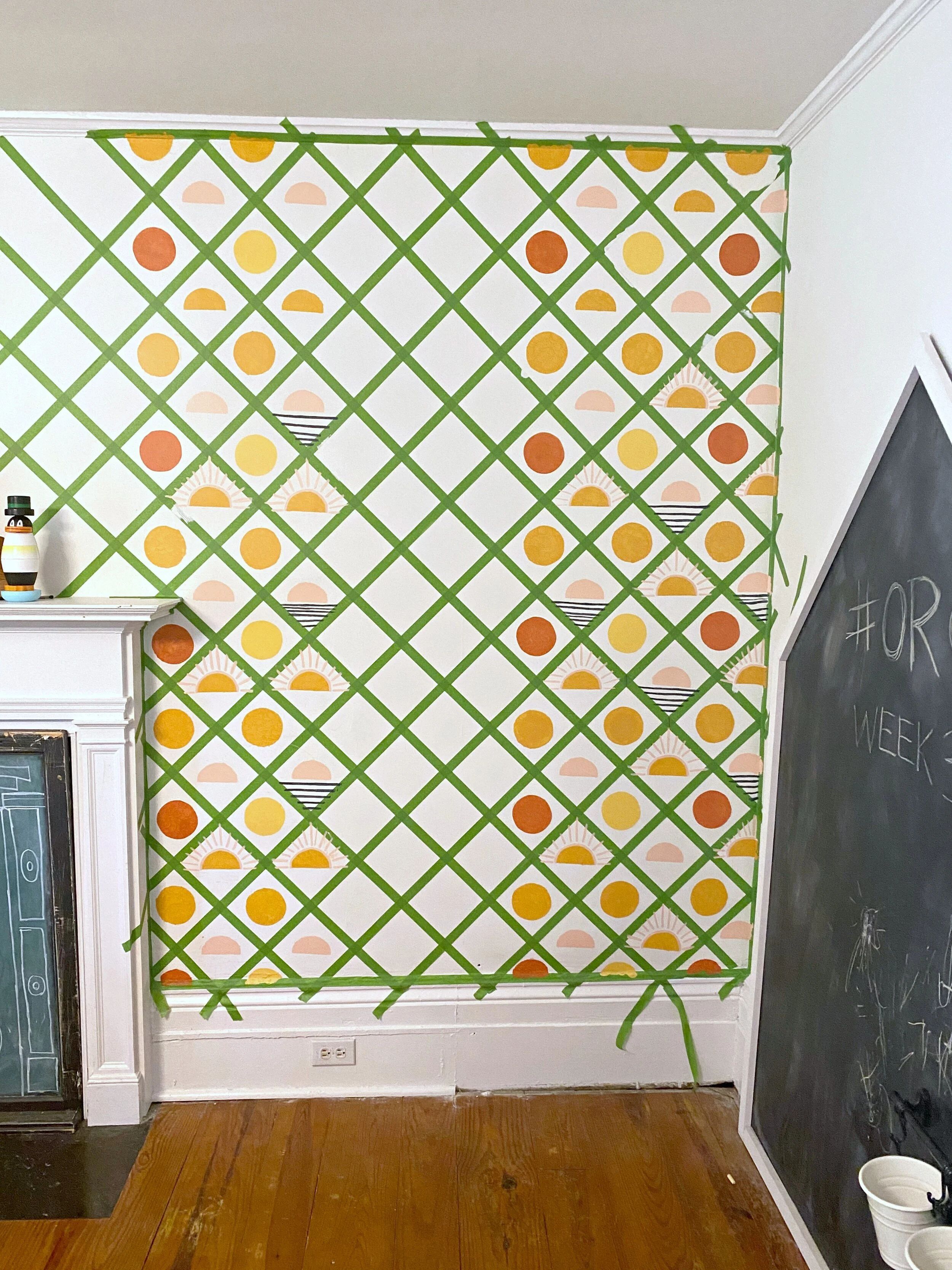 After we completed the taping, it was time to start painting! I started out with chipboard stencils but then tried the dura-lar again and it did produce a much cleaner design AND it had the ability to be quickly rinsed and washed off so I could use the same stencil for multiple colors. I did use painters tape most of the time to hold the stencil in place although a couple times I got brave and just held it with my hand. I still used the same round sponge stencil brushes and they worked well and I do think they hep provide a cleaner edge. So far I’ve completed all the circle/half circles which took me about 1 hour for this half of the wall. Next I’m going to do the rays/lines (all freehand) which I am estimating will take me about the same amount of time. I picked up some nicer, super thin detail paint brushes for that and tested out a few sections today. I think it’s turning out really well so far and I already CAN’T WAIT to peel that painter’s tape off and see the finished product!