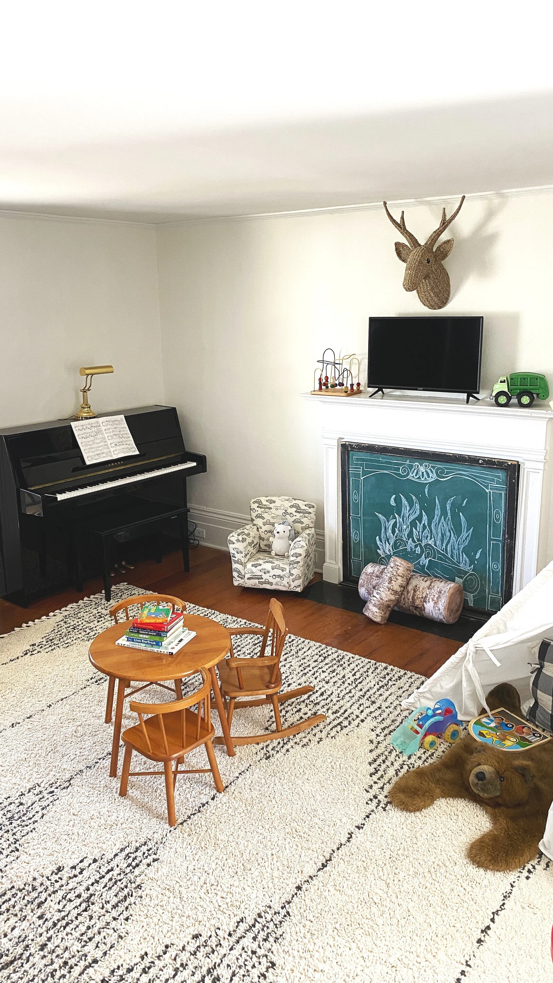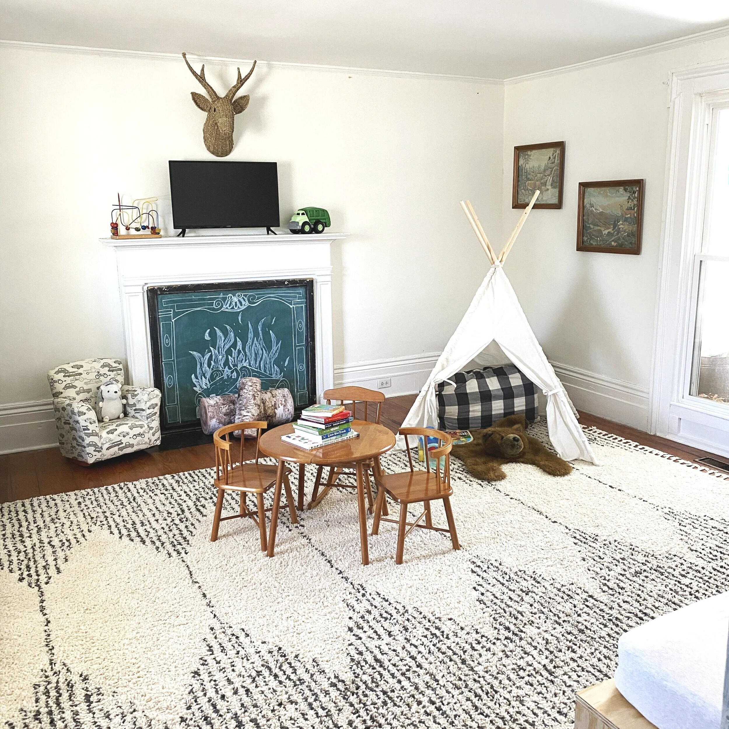 So as you can see, the playroom is a pretty boring, blank slate. I painted it all white and have a rug, but that’s about it. Everything else is makeshift using what we had. I have so many fun ideas for this space that I can’t wait to get going on! We need storage, seating, and accessorizing throughout! I want to add a lot of character using vintage pieces I have collected to make the space really unique + FUN! See more of the REAL before (it’s scary) of this space and the links to everything I have so far in this post here.
