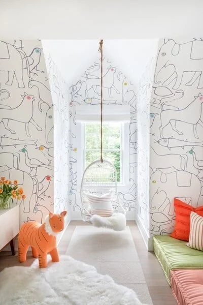 This wallpaper is not really my style but I still love this space- the brightness and hanging chair with all the white!