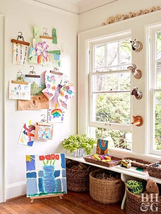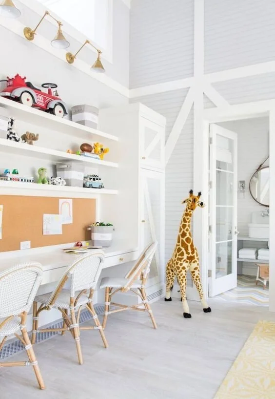 This space is geared towards slightly older children but I do love the built-in table/desk area so much (especially with the shelving/bulletin board above it). This may be something I keep in mind to incorporate later down the road in this space.