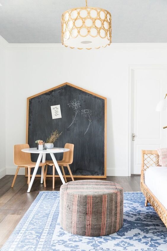 I love this little house shaped chalkboard wall and the use of a daybed in here for seating!