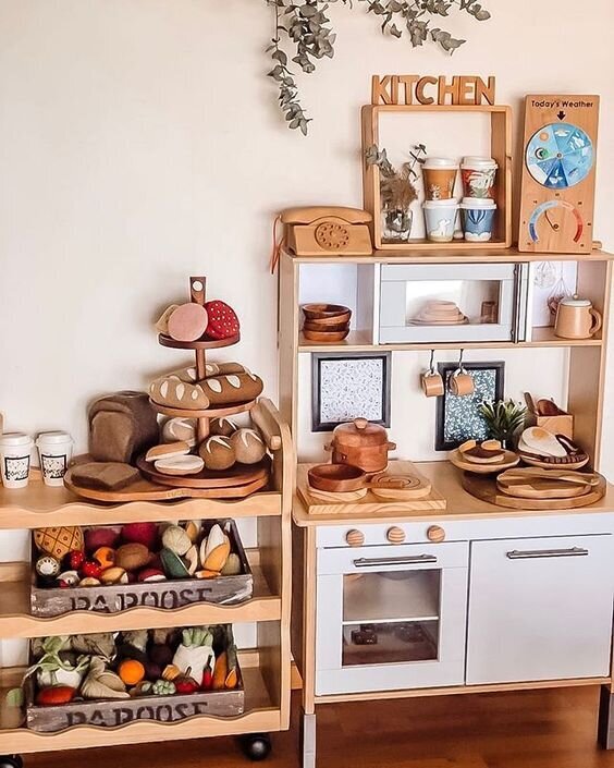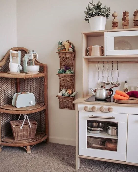 Love these sweet kitchen areas above and below. Not quite sure I will have enough room for a big area but I’d love to have something like this. I love the wooden kitchen sets and all the neutrals. I do have my old Playschool kitchen that I saved but not sure if it’s what I’m wanting for the space.