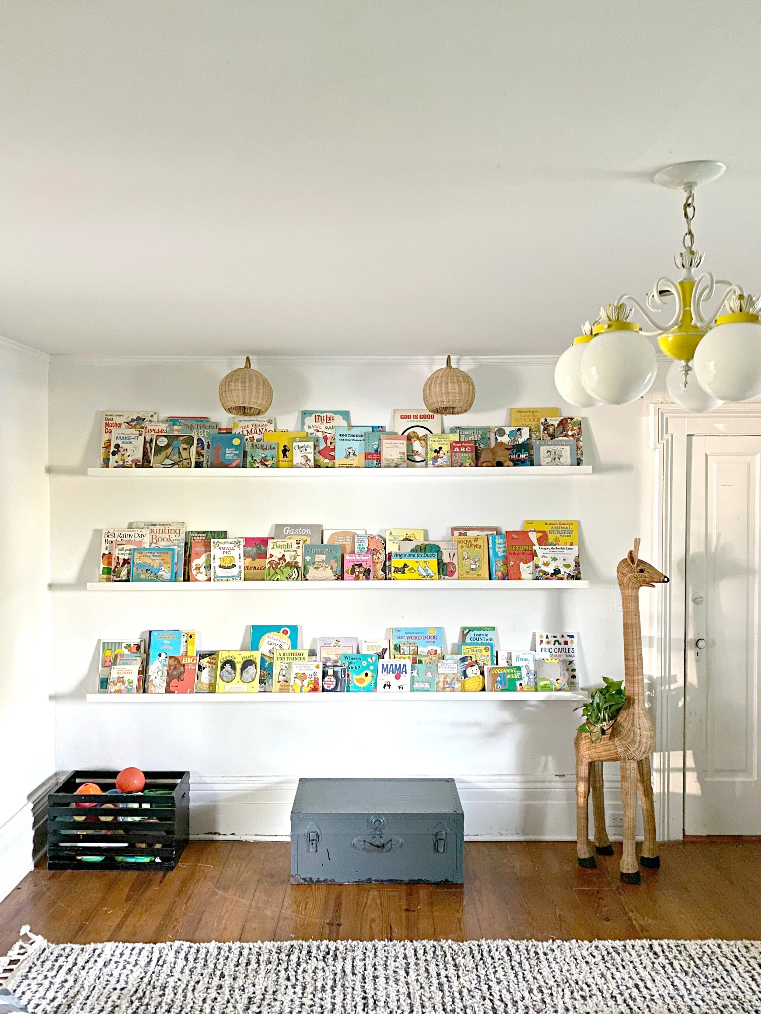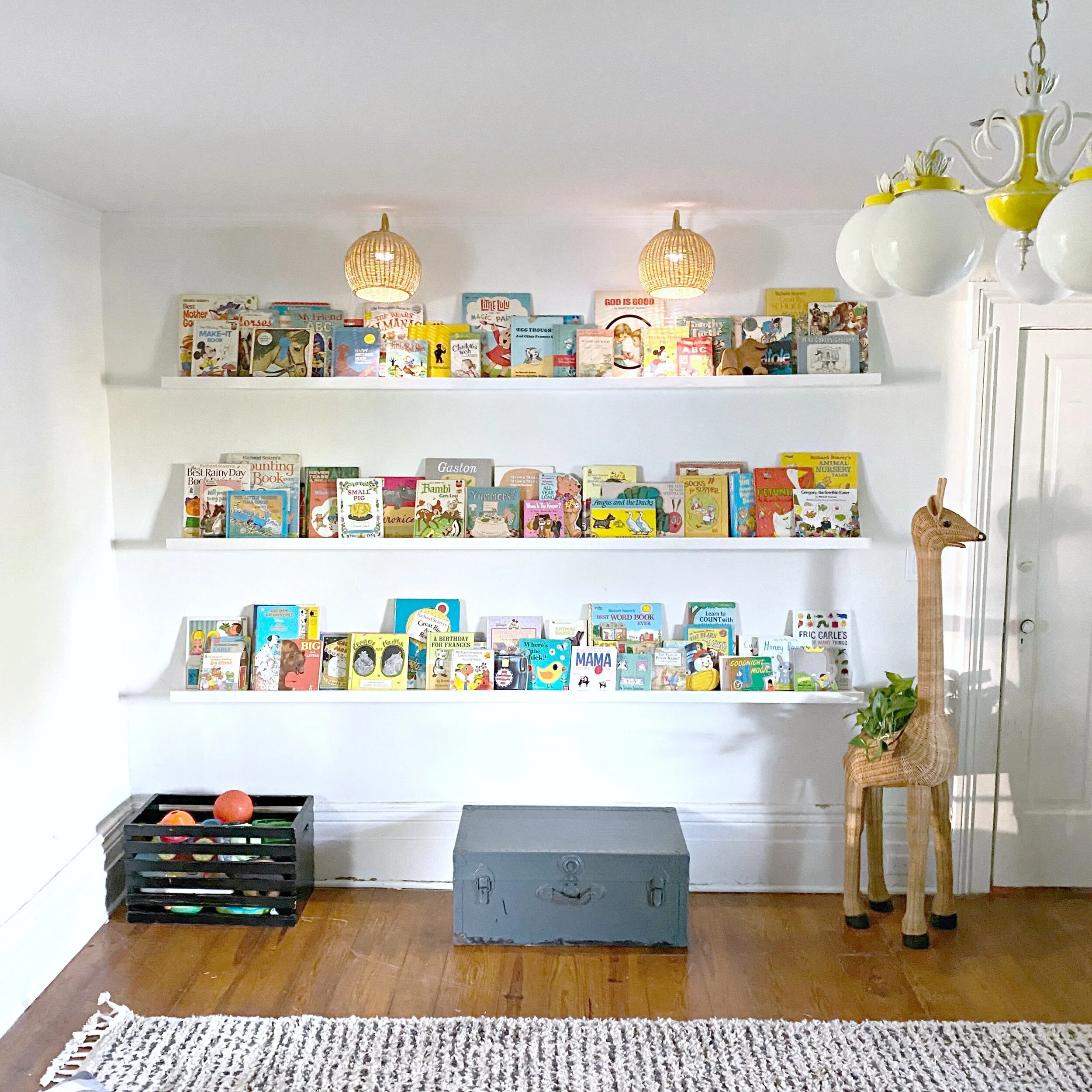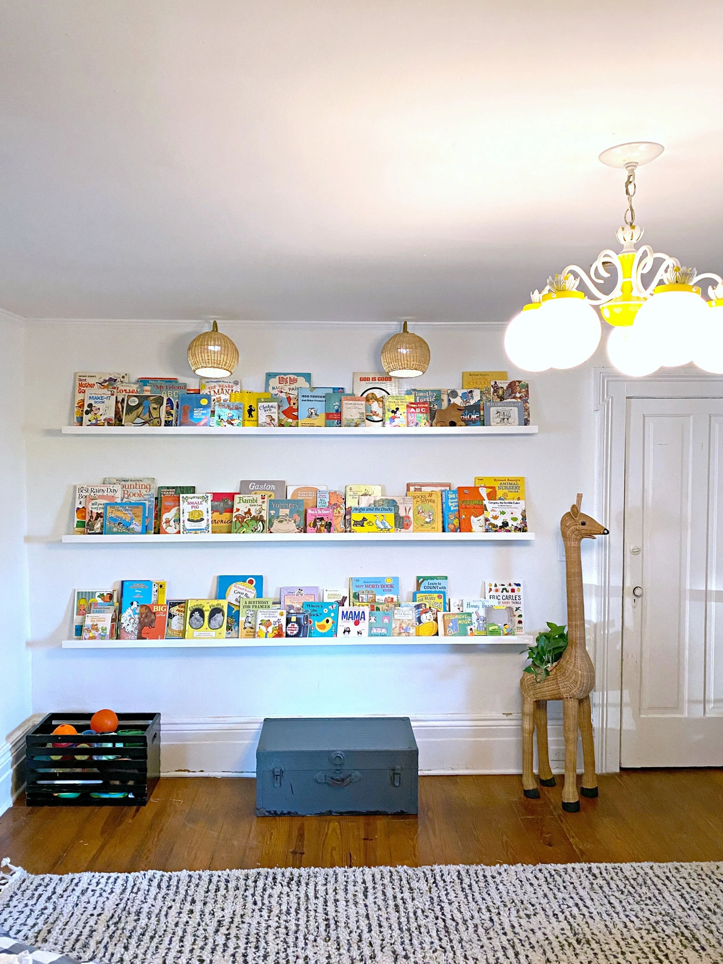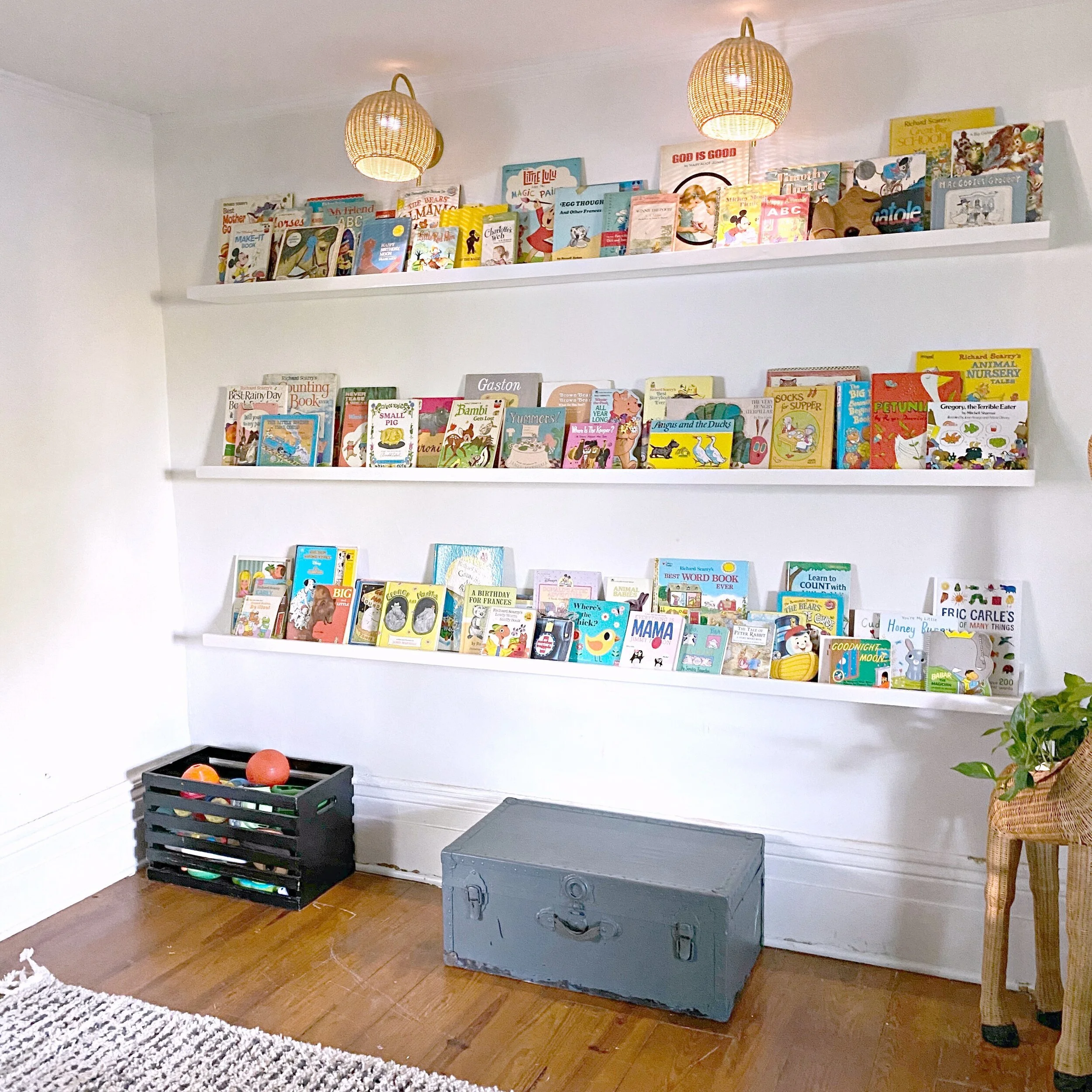 This week we finished up what will probably be my favorite part of the playroom: the book wall! I knew I wanted a large part of the playroom dedicated to books/reading and a spot to display our massive vintage children’s book collection. I decided to have some book ledges/shelves custom made to the exact dimensions I wanted as opposed to buying pre-made shelves and piecing them together. MK Farmhouse Furniture was able to custom build these for me so reasonably (seriously cheaper than I would have paid for store-bought shelves AND he installed them too). They even painted the shelves the wall color so that they truly look built in just like I wanted. The shelves are each 8 feet long and 6 inches deep giving plenty of room for lots and lots of books! I have tons of room to add even more depth wise but am being a little particular about having them all displayed just right!