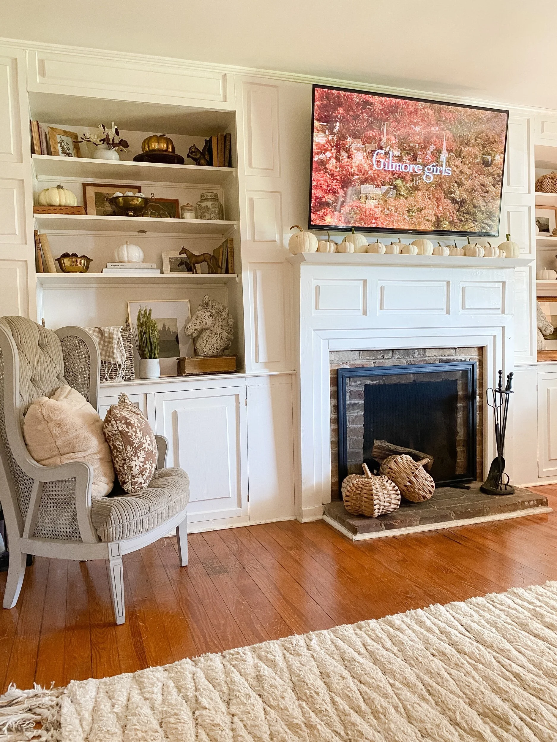 Our living room is the next space on my fall home tour! I chose to update my fall decor this year by replacing some of the textiles and built-in accessories with items from The Amsden as well as a few other stores, and you can also shop all of these items below! This room is a prime example of how you don’t have to break the bank to incorporate seasonal decor in your home. A few new additions like swapping out vintage autumn landscape prints in my existing frames, swapping a couple of throw pillows for some warmer tones and textures, and adding some new mantle decor (just plain white mini pumpkins!) were all small and affordable changes that made it feel like I had a completely new, cozy fall space!