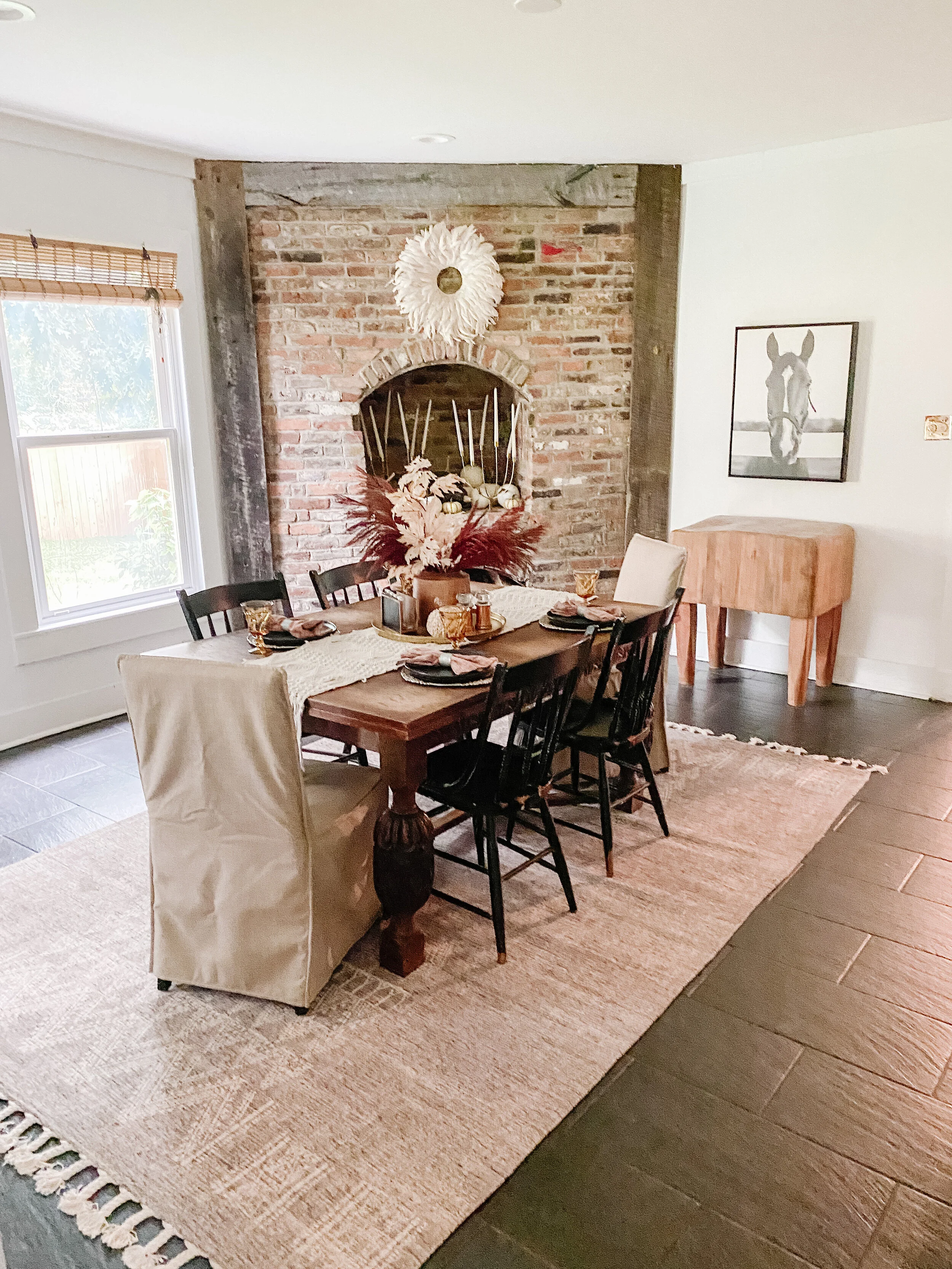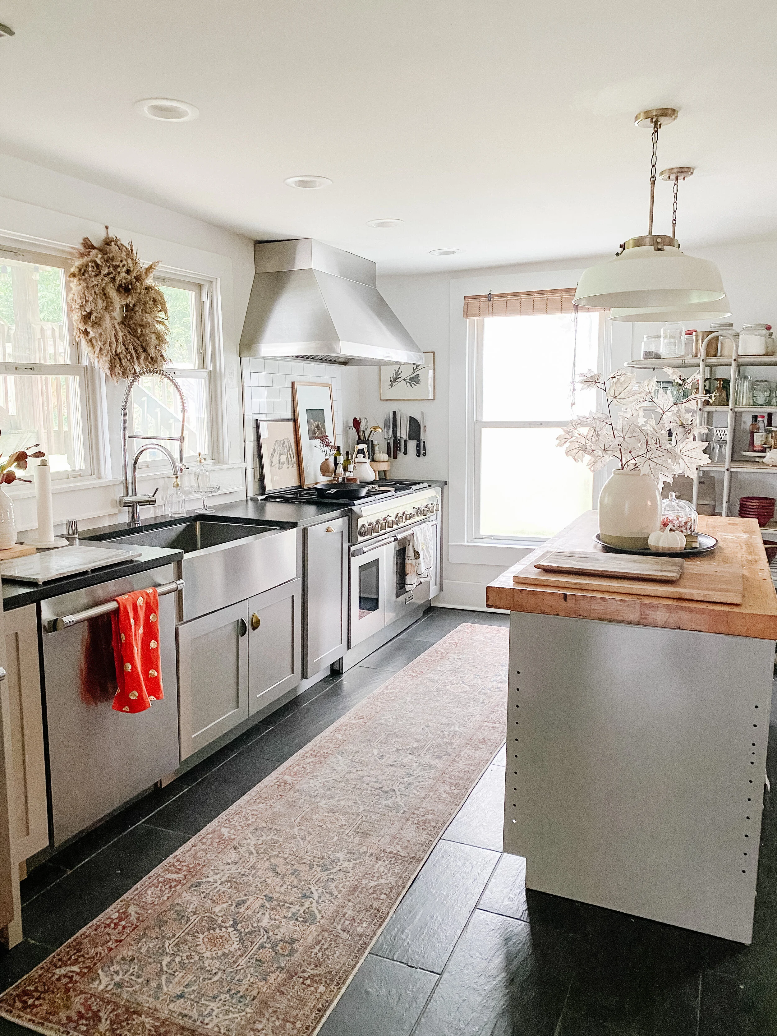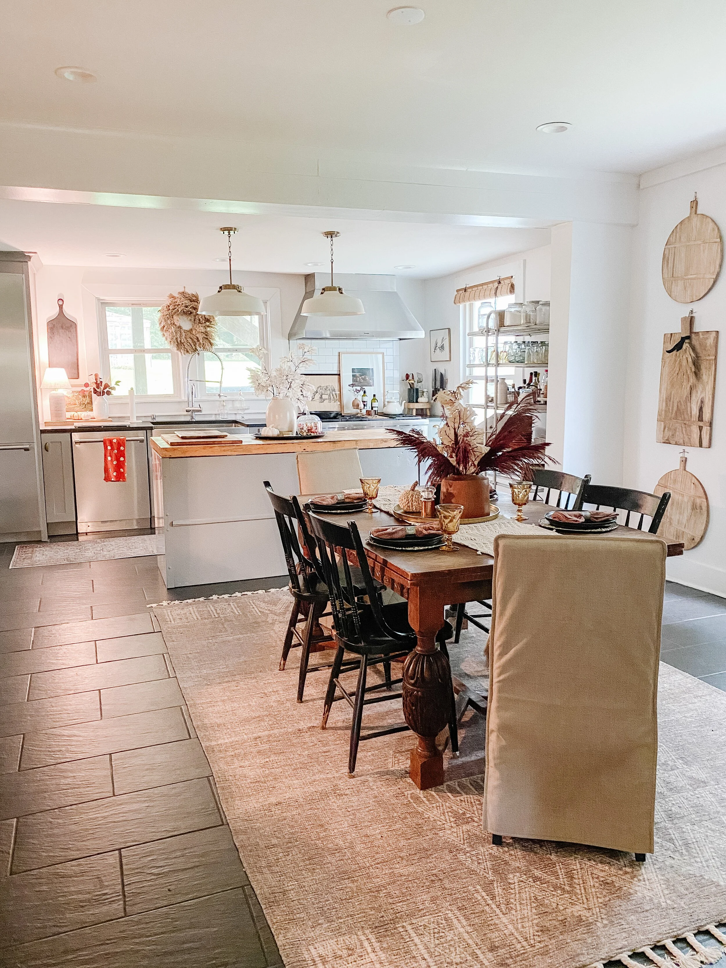 I love a cozy fall kitchen! Fall is the launch of the holiday season, and setting my kitchen up so that it’s a warm, inviting space really helps me set the tone for all the upcoming gatherings! I have a few new additions to the kitchen this year including a rug under the dining table, some lamps (LOVE a lamp in a kitchen- so unexpected but add so much coziness!), and some new framed prints throughout. I have linked all the items I used to decorate my space below as well as similar options for anything that is one-of-a-kind/vintage. Take a little tour of my autumn kitchen through the photos below!