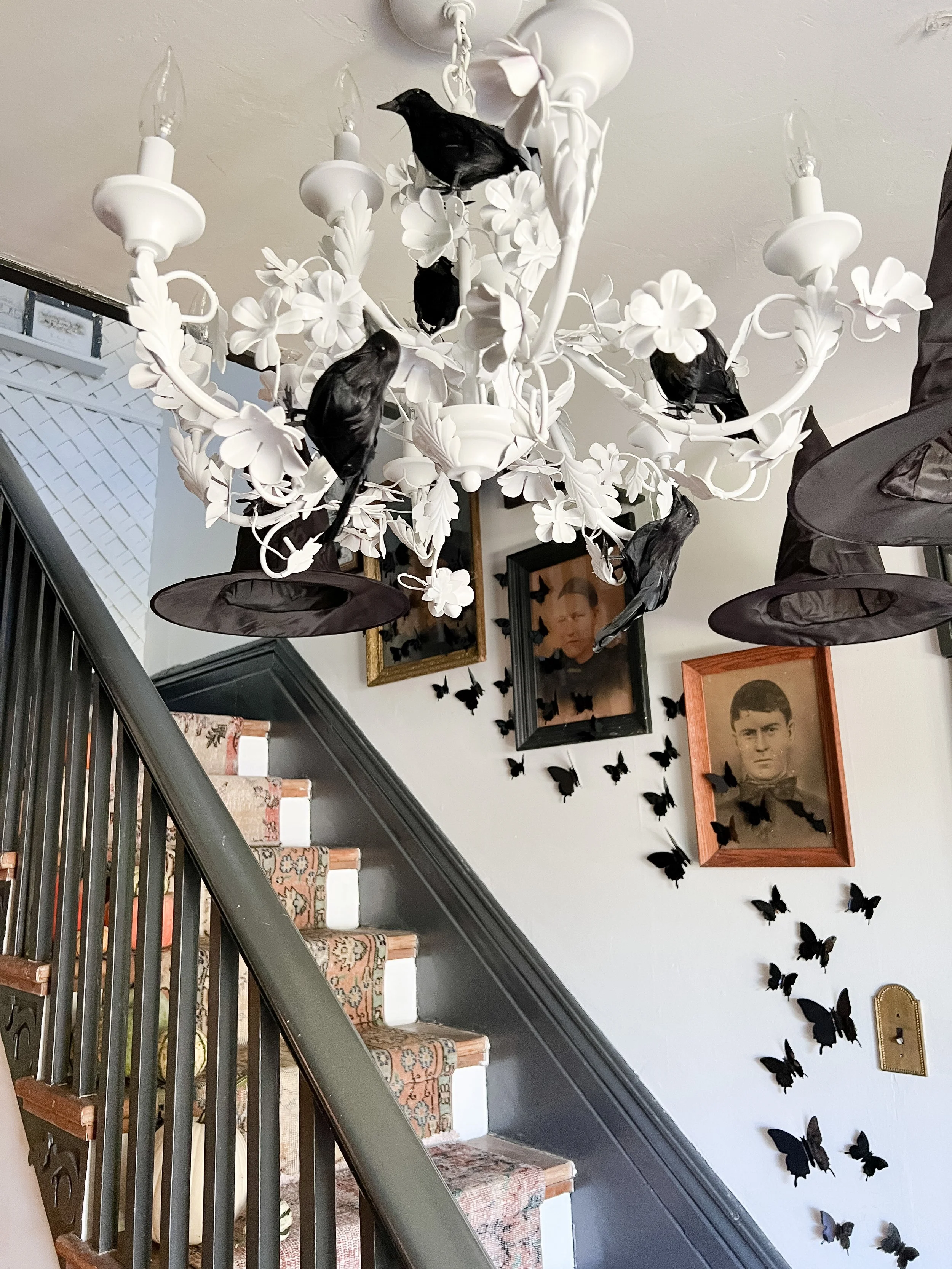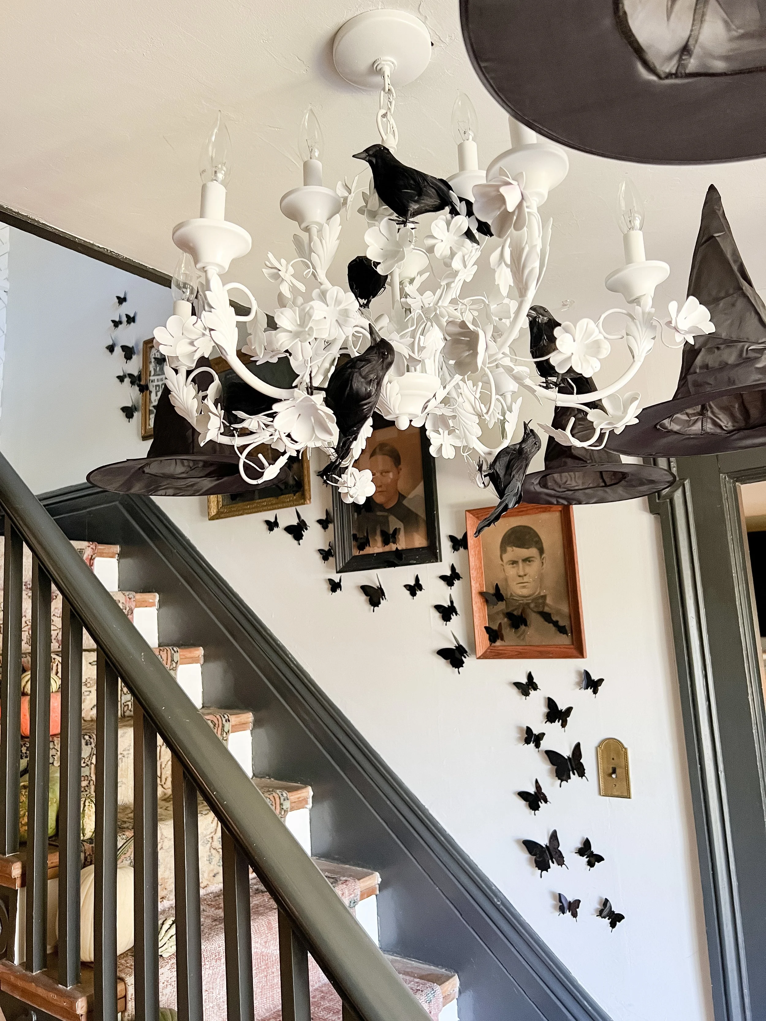 The entryway is always such a fun space to decorate for Halloween and fall! This newly redecorated space would be the perfect backdrop for some haunted, spooky decor! I love how it mixes in with the moody wallpaper and antique rugs- it truly feels like you’ve stepped into a haunted mansion! The witch hats make the biggest statement and are so inexpensive and easy to add to any space for a big impact! I have linked them below (I just used clear small command hooks to hang them with the fishing line that came with them!). Most of my other spooky decor is vintage/thrifted but I’ve linked lots of similar options below! Happy Haunting!