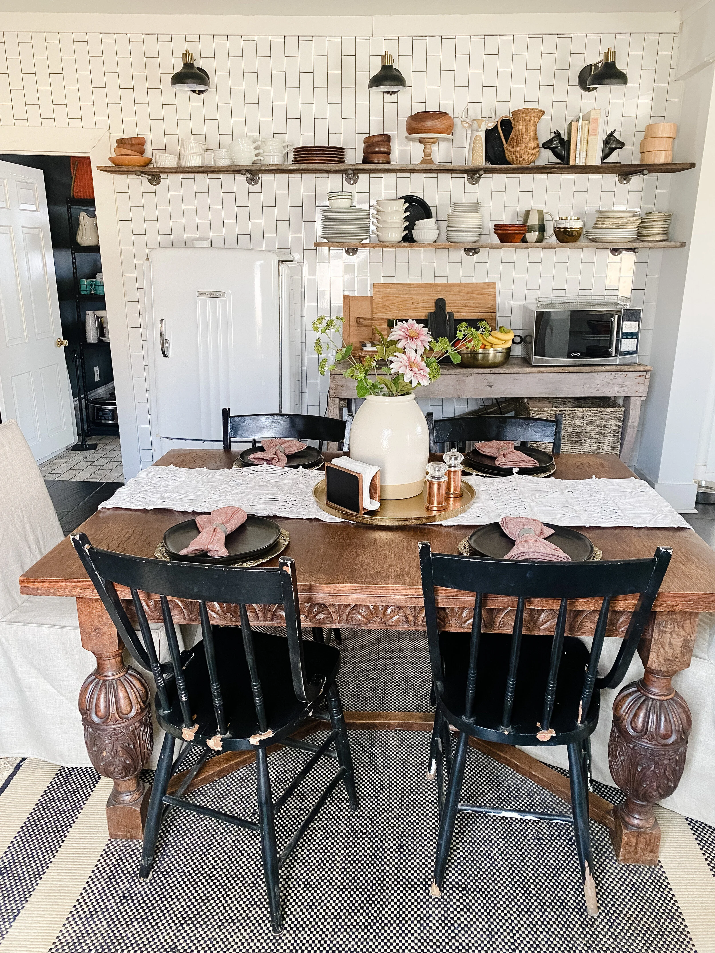 What makes our kitchen most unique is the large amount of open shelving options we have. It’s something I have always loved in a kitchen and still do. I enjoy displaying my items and styling all the shelves, so I’ve always been drawn toward open shelving! We have a few different styles in here from wall mount shelves, to rolling carts, and vintage furniture pieces- all function differently but every inch is used for storage!