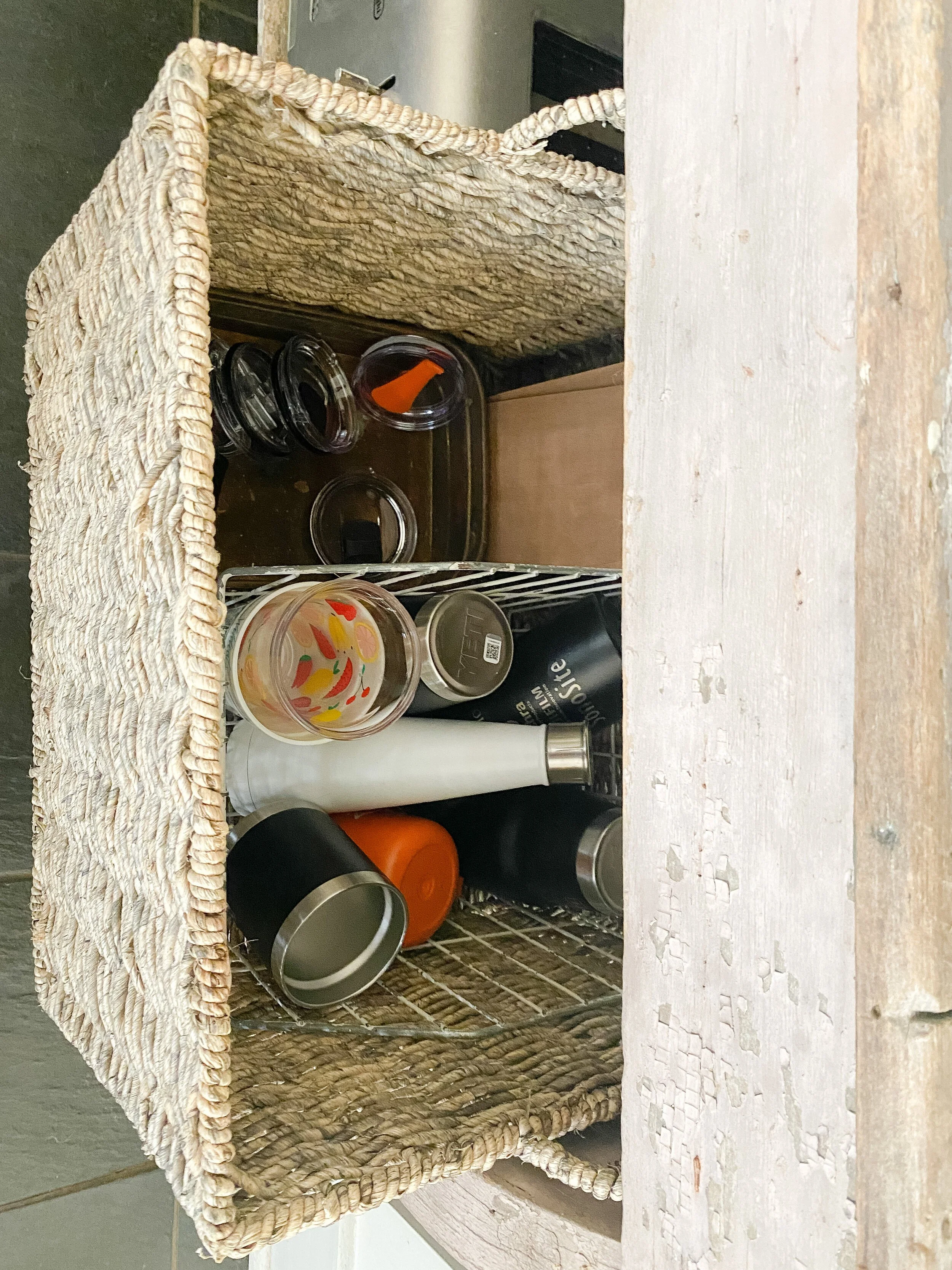 -use baskets or crates to hide less attractive items on shelves (plastic cups, water bottles, etc.)