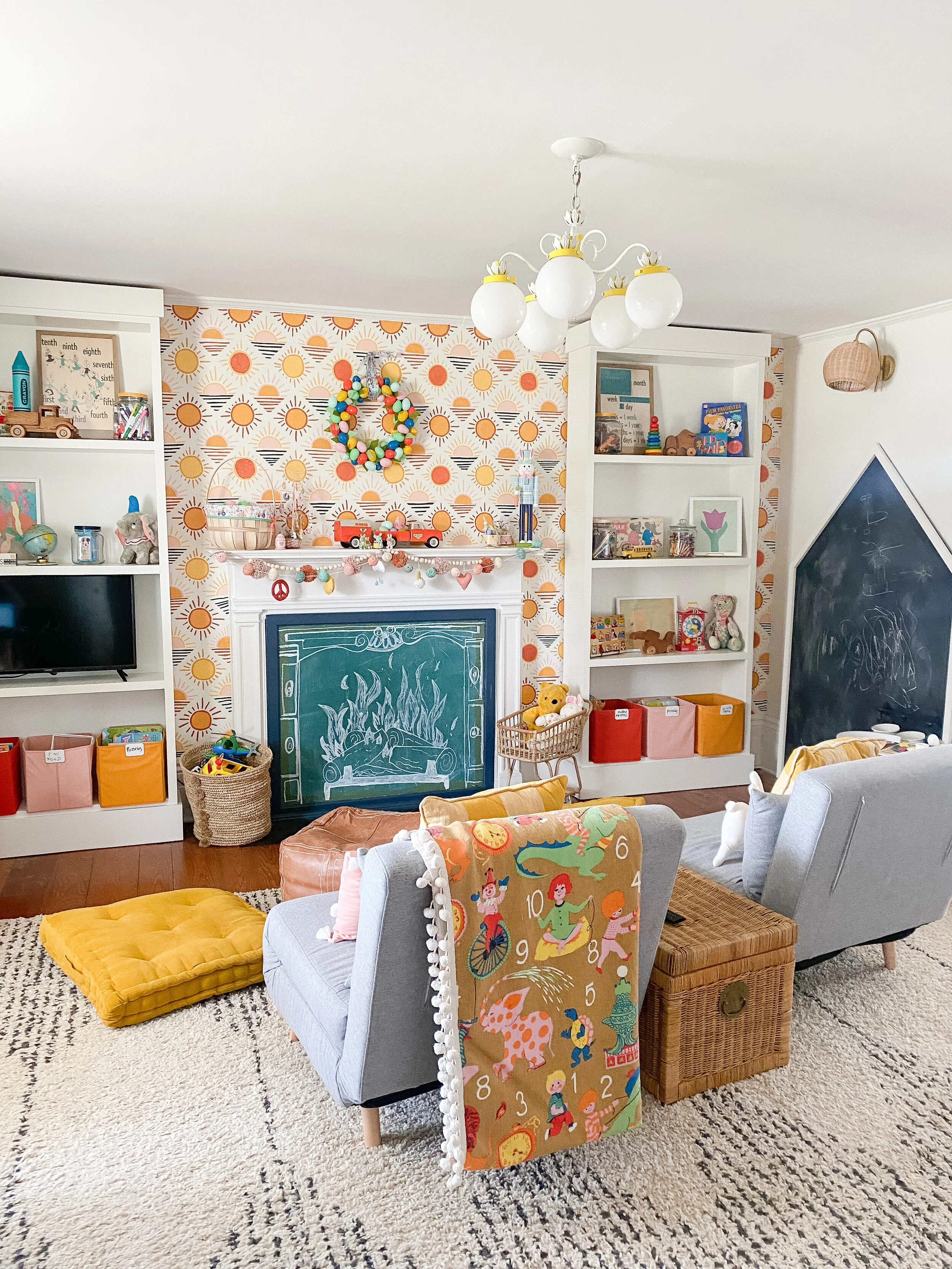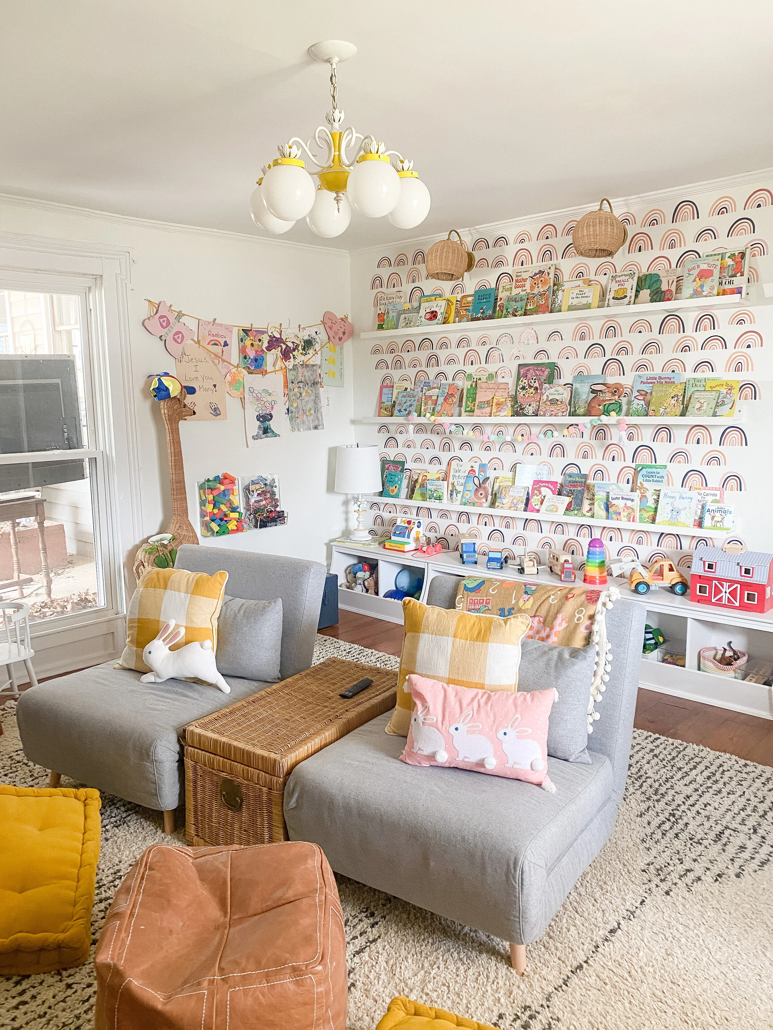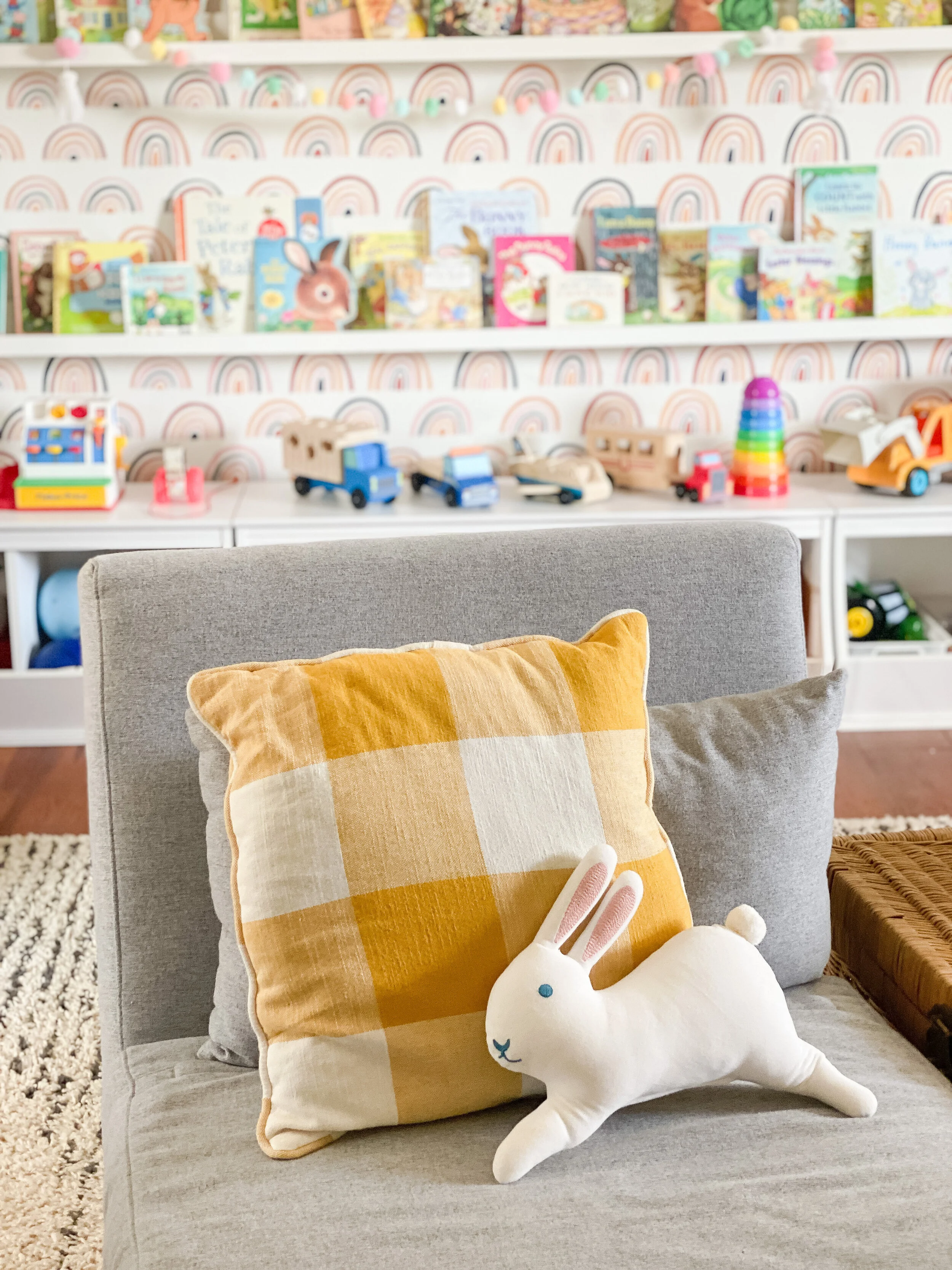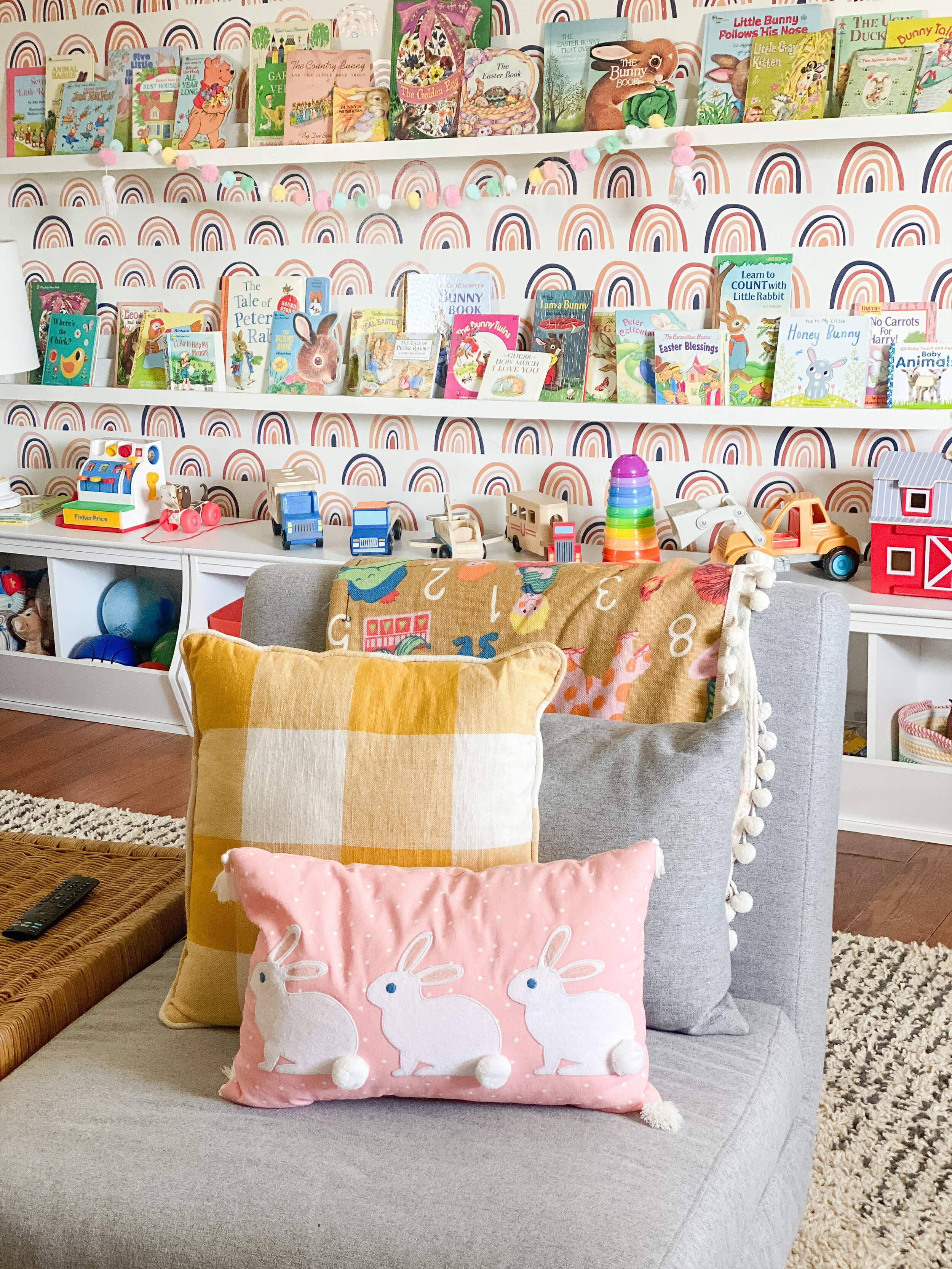 Today I’m sharing our Easter playroom with a few fun spring touches! I just couldn’t resist adding a little Easter decor in here especially since the colors match up so perfectly! I put out a few vintage Easter decorations that I’ve had since I was little and I also added all our Easter and spring books to the book wall. You can find all my favorite pieces linked for you to shop below!