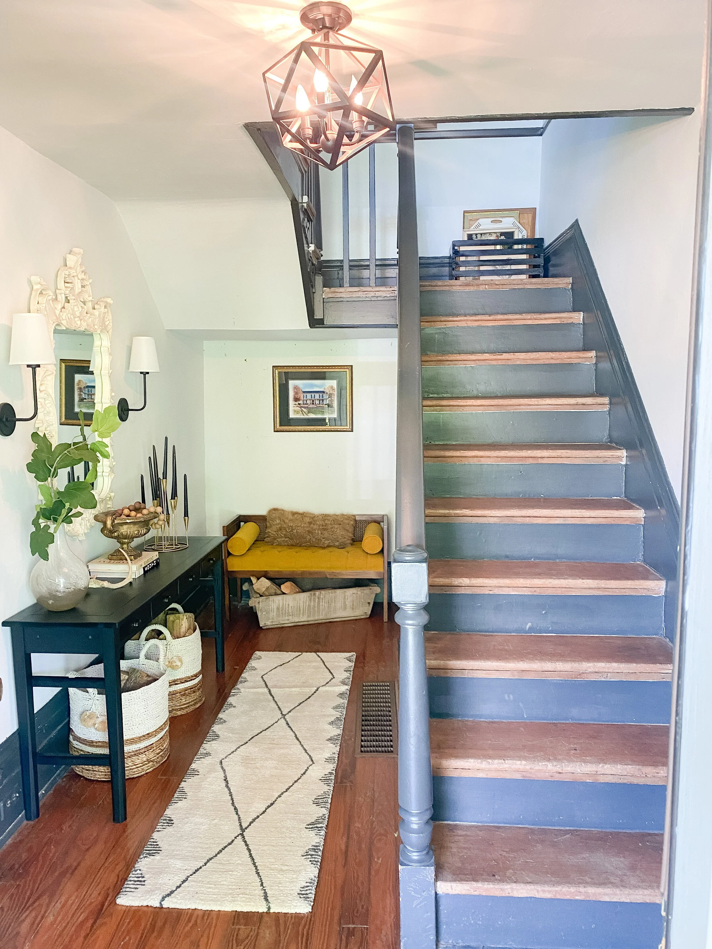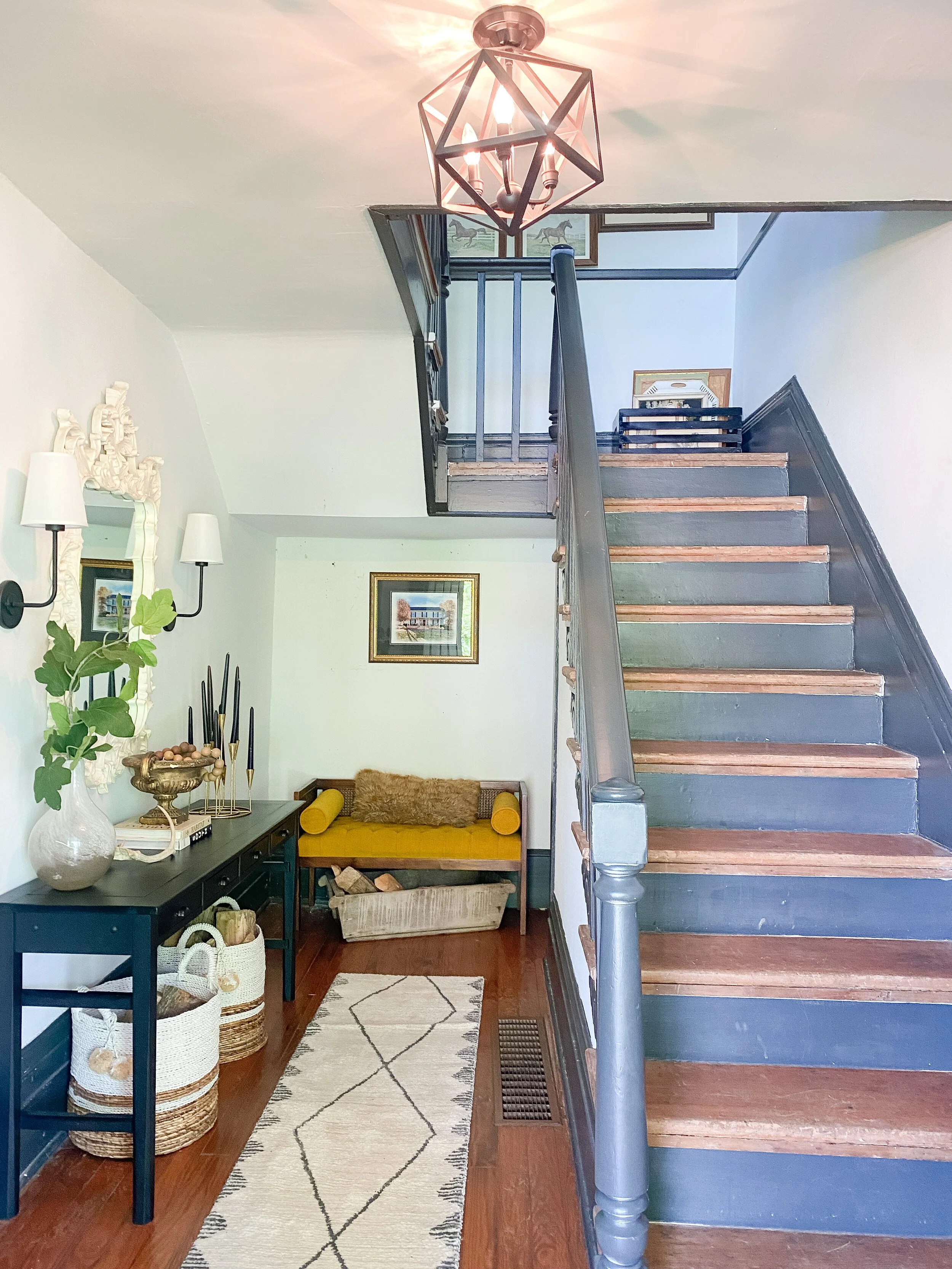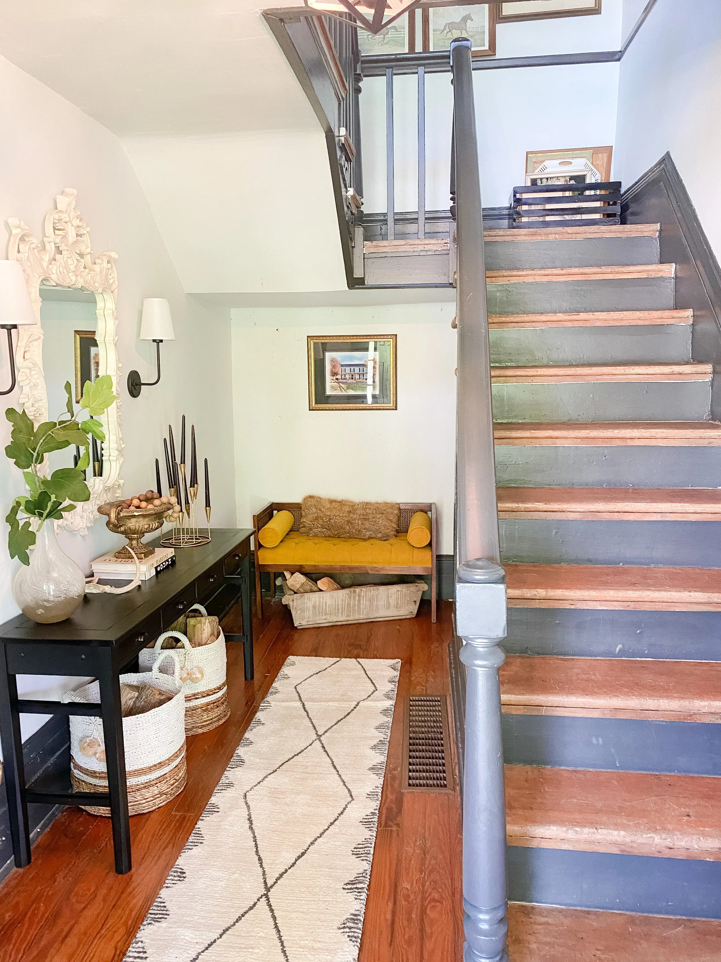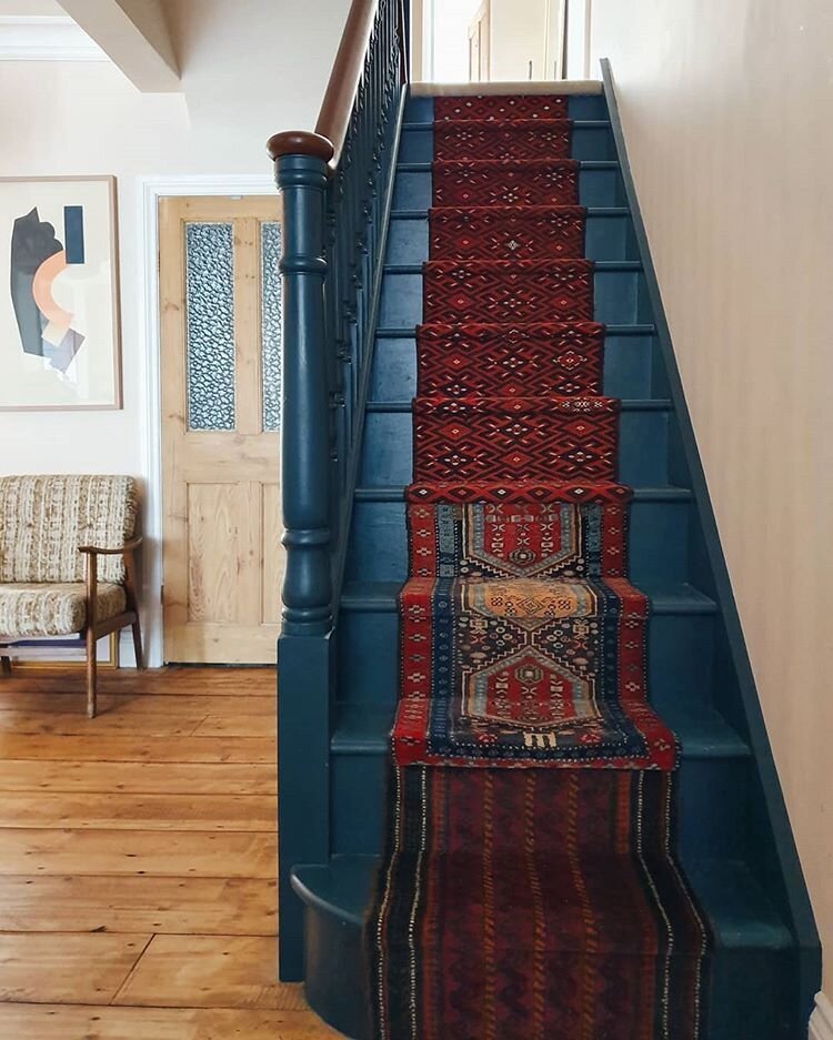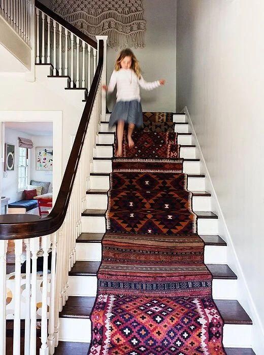 I first pinned this idea years ago and haven’t stopped thinking about it since. I think my entry was made for this pop of vintage print and color and it kind of combines all my favorite things. I have yet to decide if I’m going to attempt to DIY this or call in a professional carpet person for help. I’m going to do a little more research and see how difficult it looks. I mostly worry about my ability to keep it straight all the way down! I can’t wait to finally do this in our entryway and a stair runner is much needed as our hardwoods are very worn in this area.