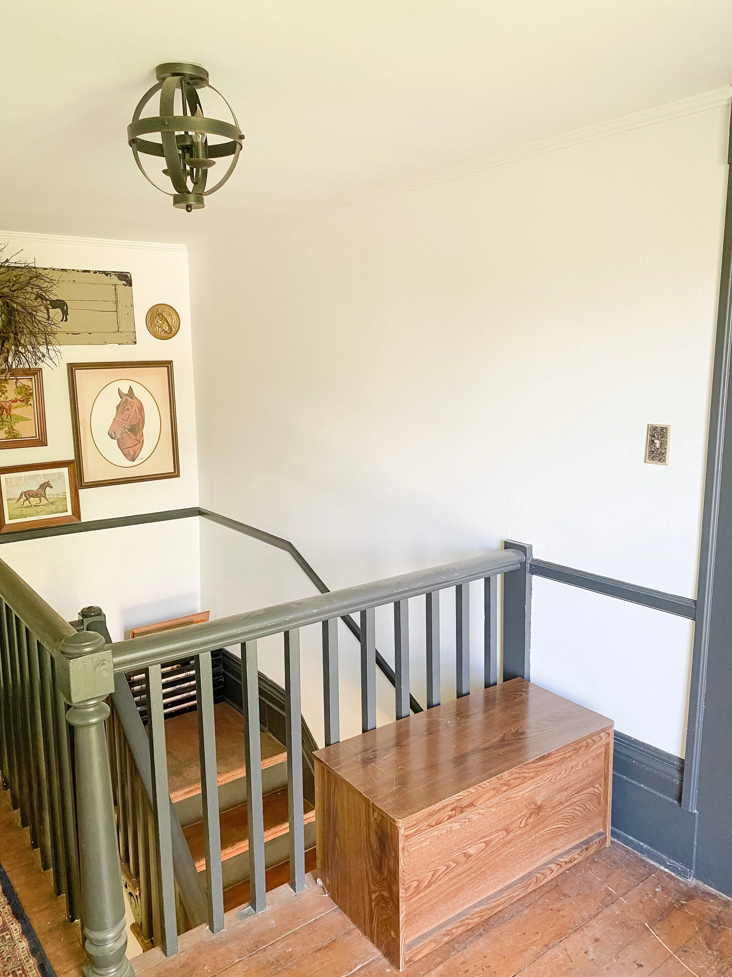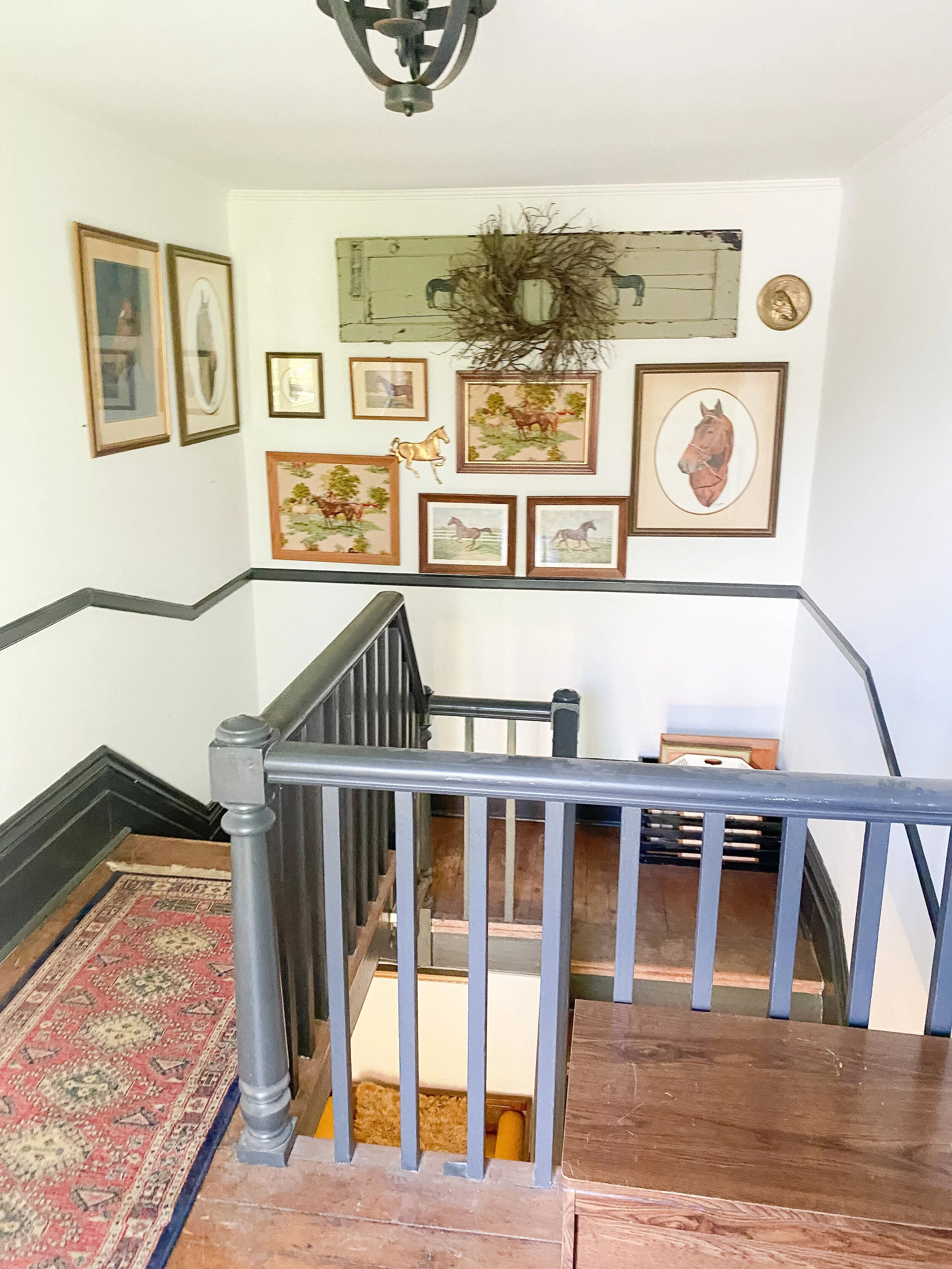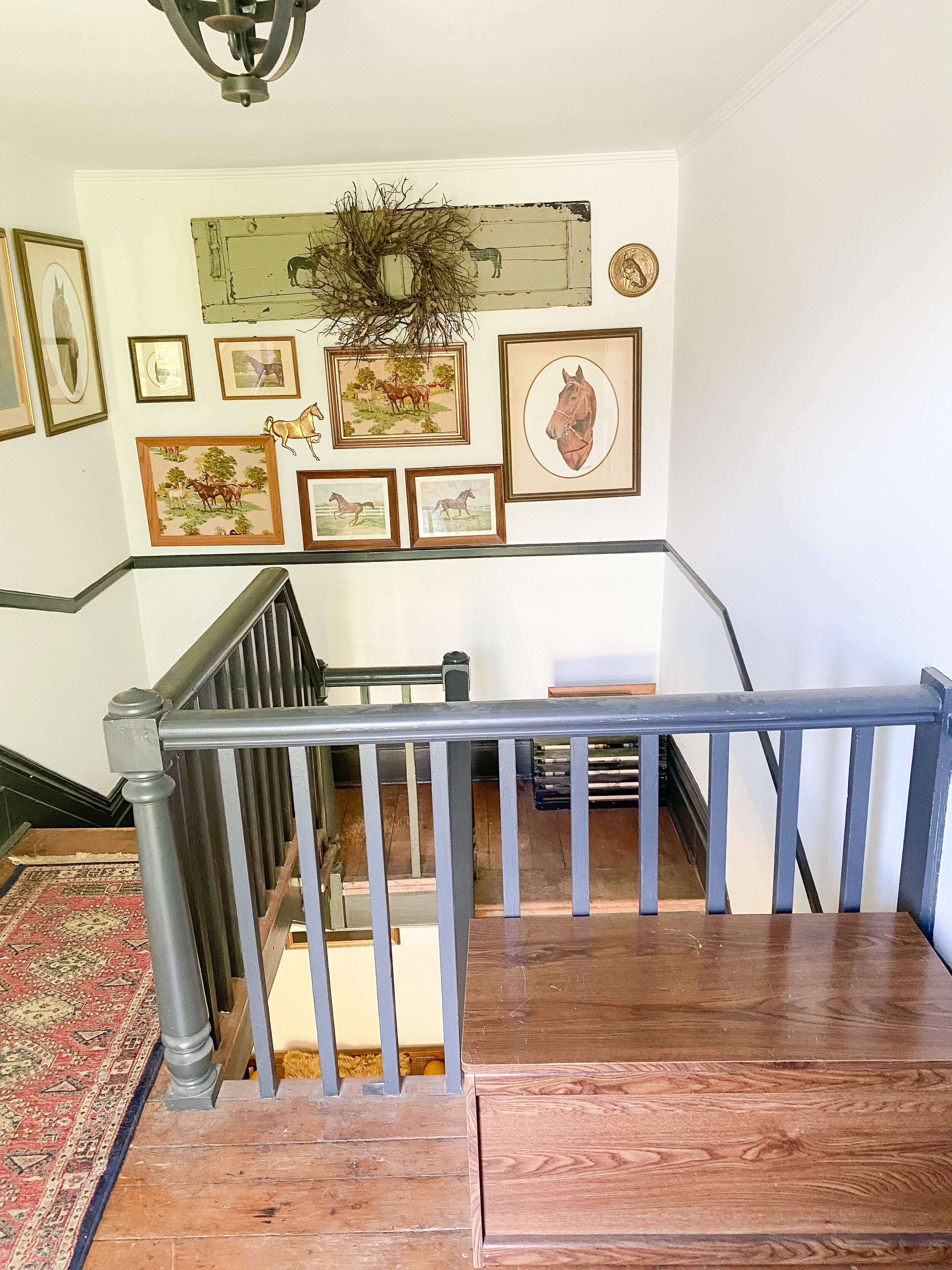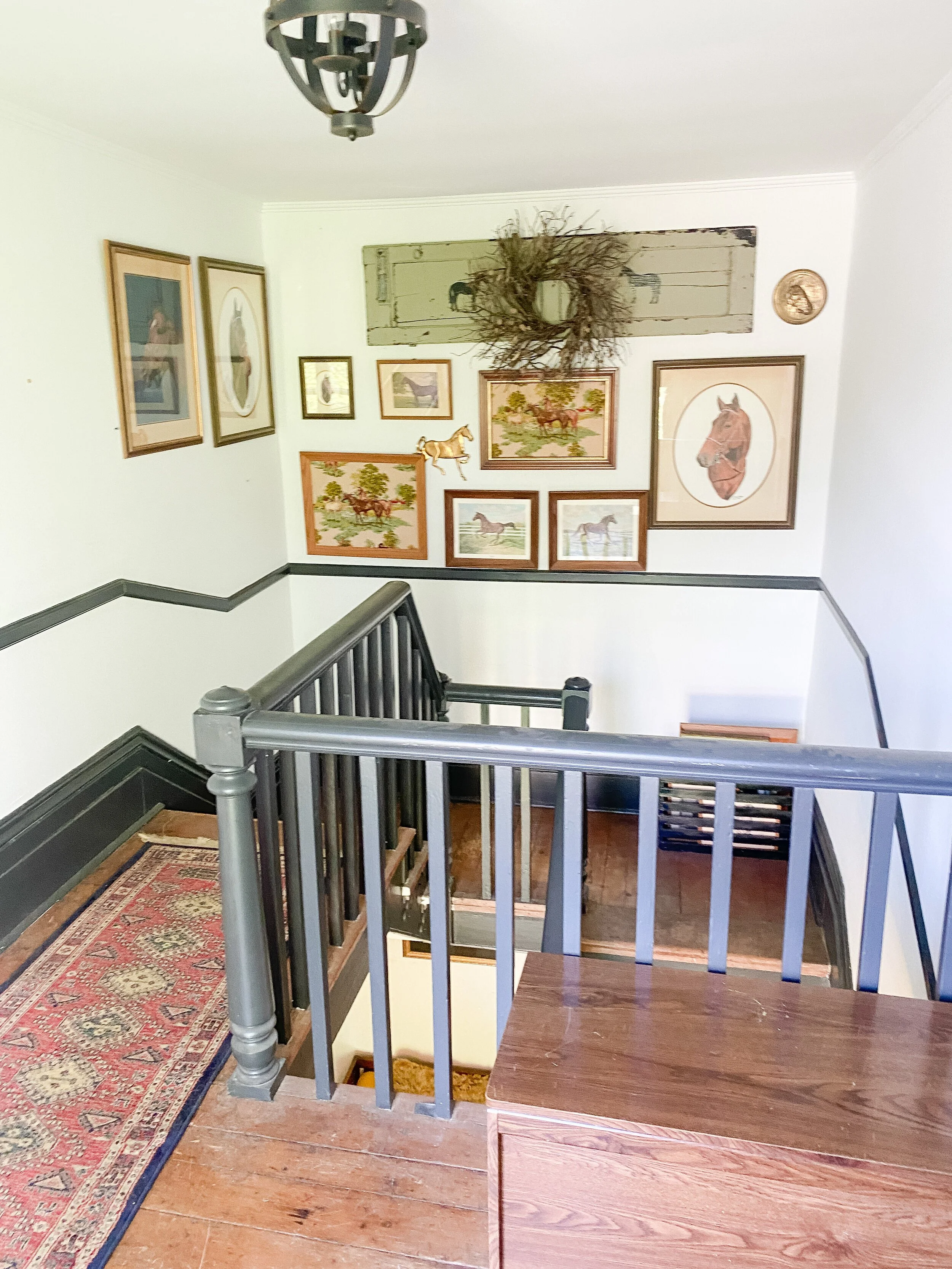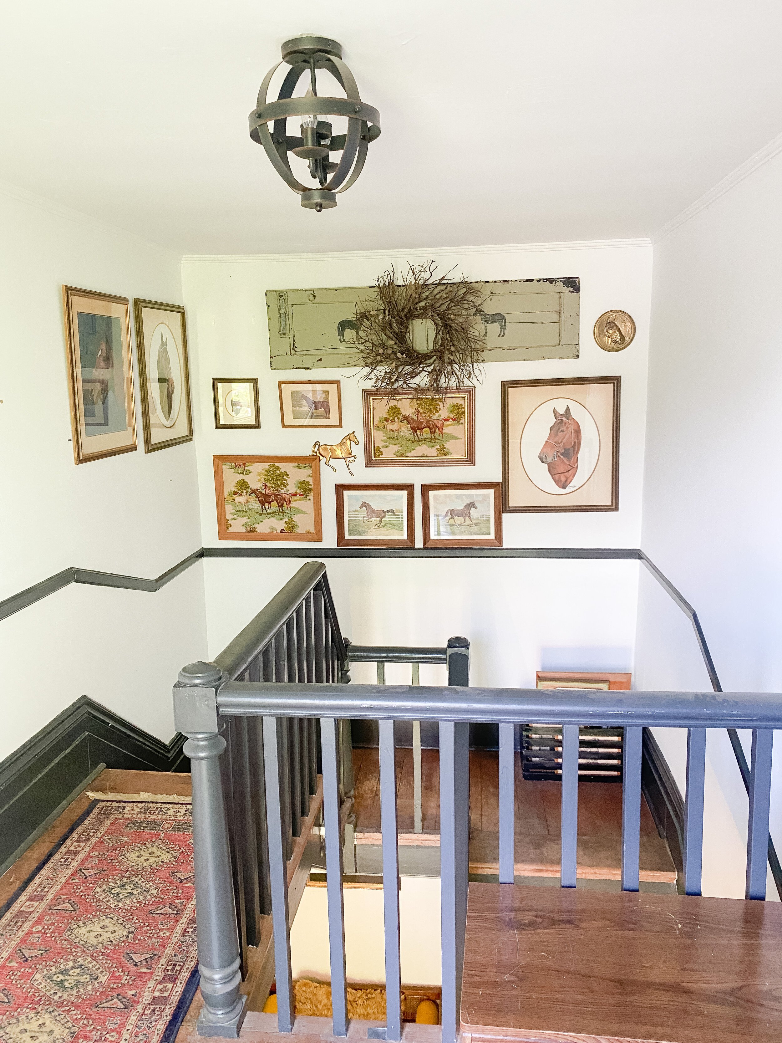 I currently have an equestrian themed gallery wall which leans a little rustic for my current taste so I’m excited to update it! I do still love a gallery wall for this landing area and want to keep something similar there but just with a refreshed feel! I have a special idea for the contents of the gallery wall but that is going to be a surprise! I am leaning toward the picture ledge style look because I could easily update and switch things out. I also like the idea of adding some sconces here and possibly also doing decorative trim or wallpaper on this wall behind the gallery, pending the wall finishes I decide to do throughout.