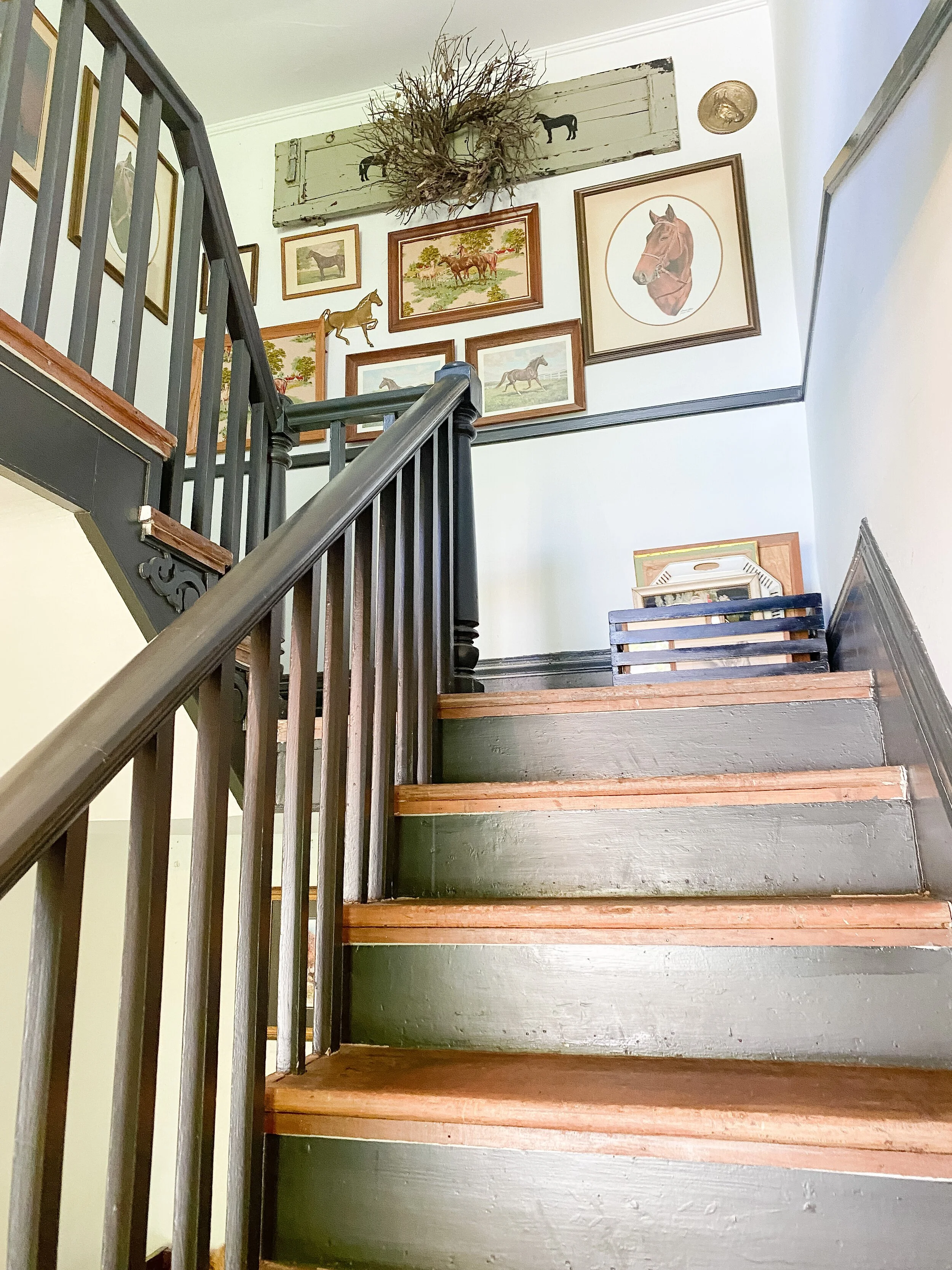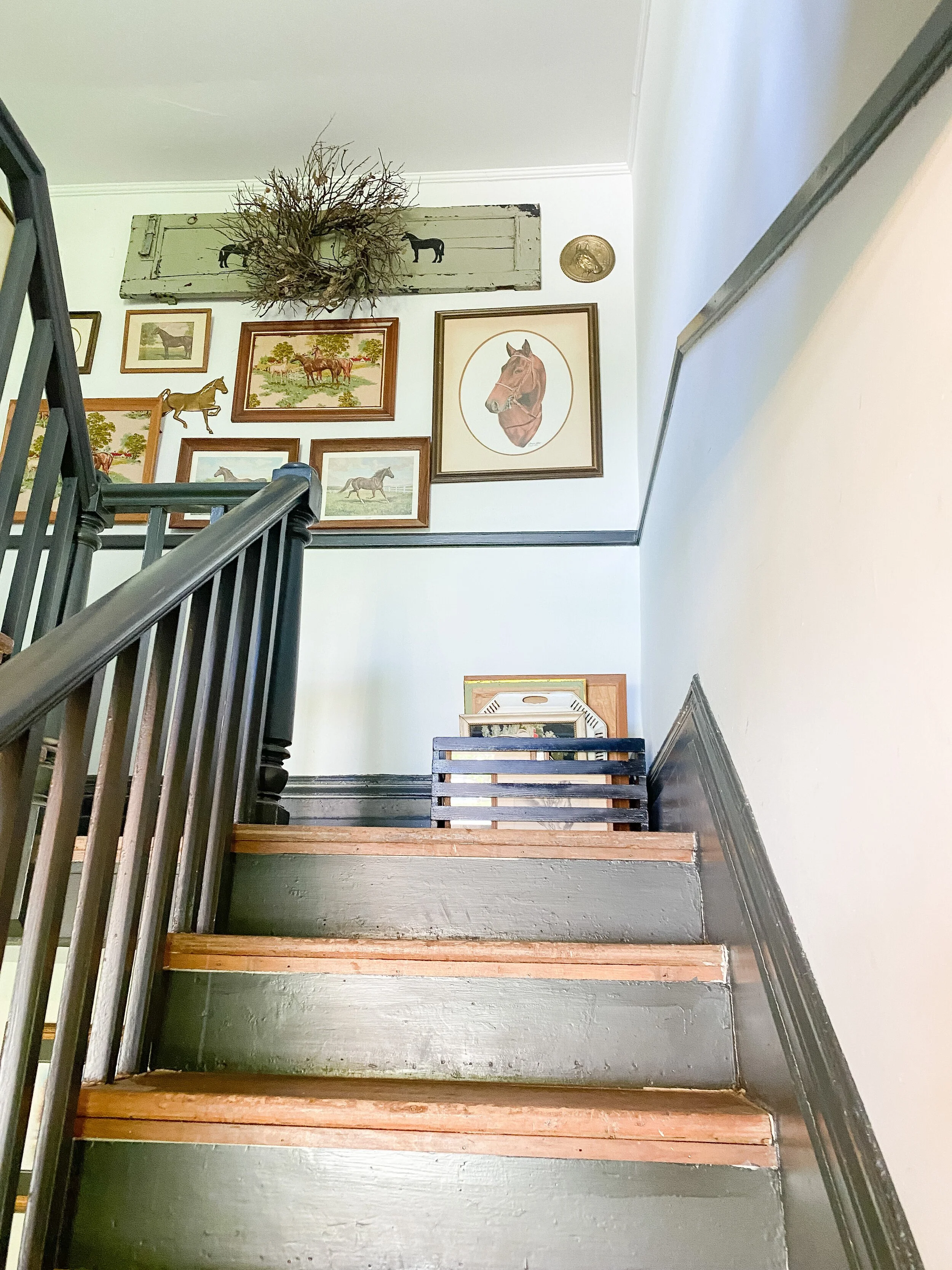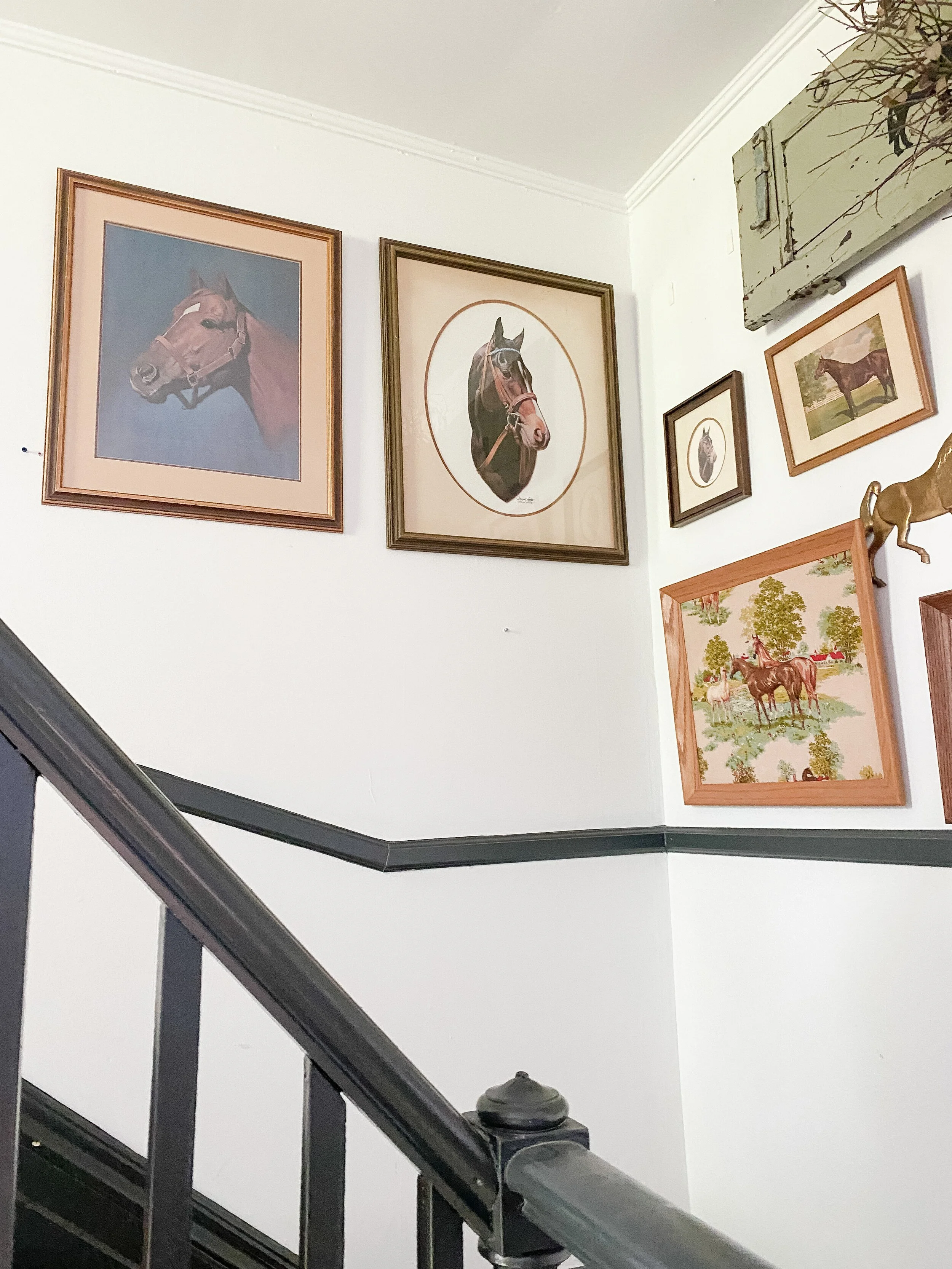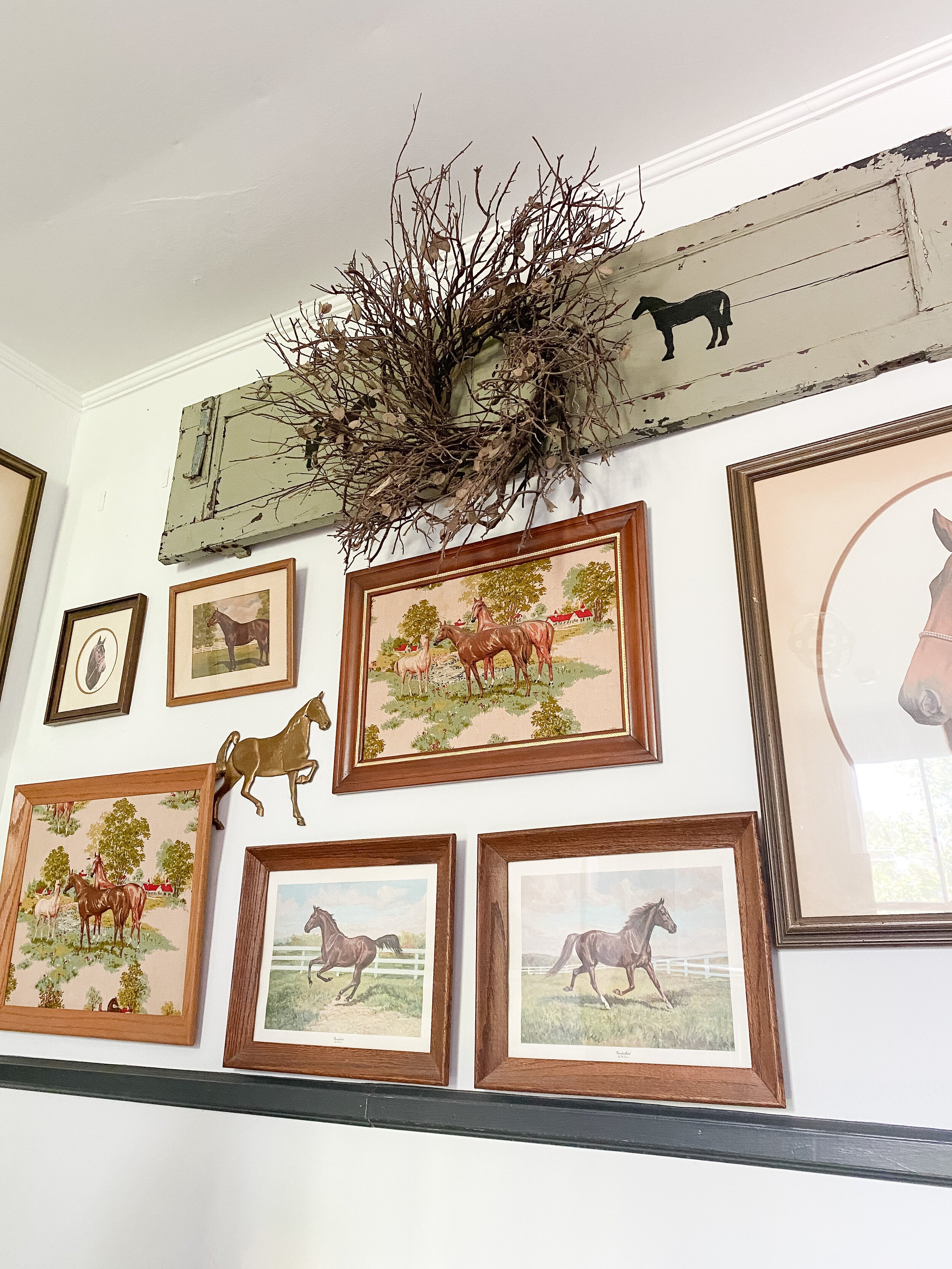 I currently have an equestrian themed gallery wall which leans a little rustic for my current taste so I’m excited to update it! I do still love a gallery wall for this landing area and want to keep something similar there but just with a refreshed feel! I have a special idea for the contents of the gallery wall but that is going to be a surprise! I am leaning toward the picture ledge style look because I could easily update and switch things out. I also like the idea of adding some sconces here and possibly also doing decorative trim or wallpaper on this wall behind the gallery, pending the wall finishes I decide to do throughout.